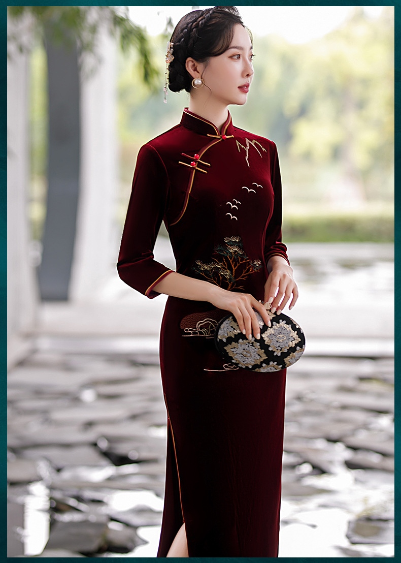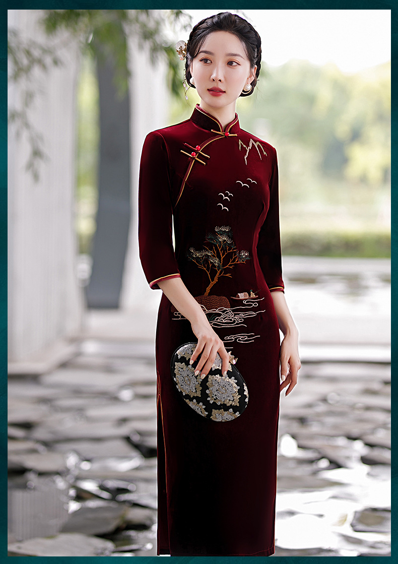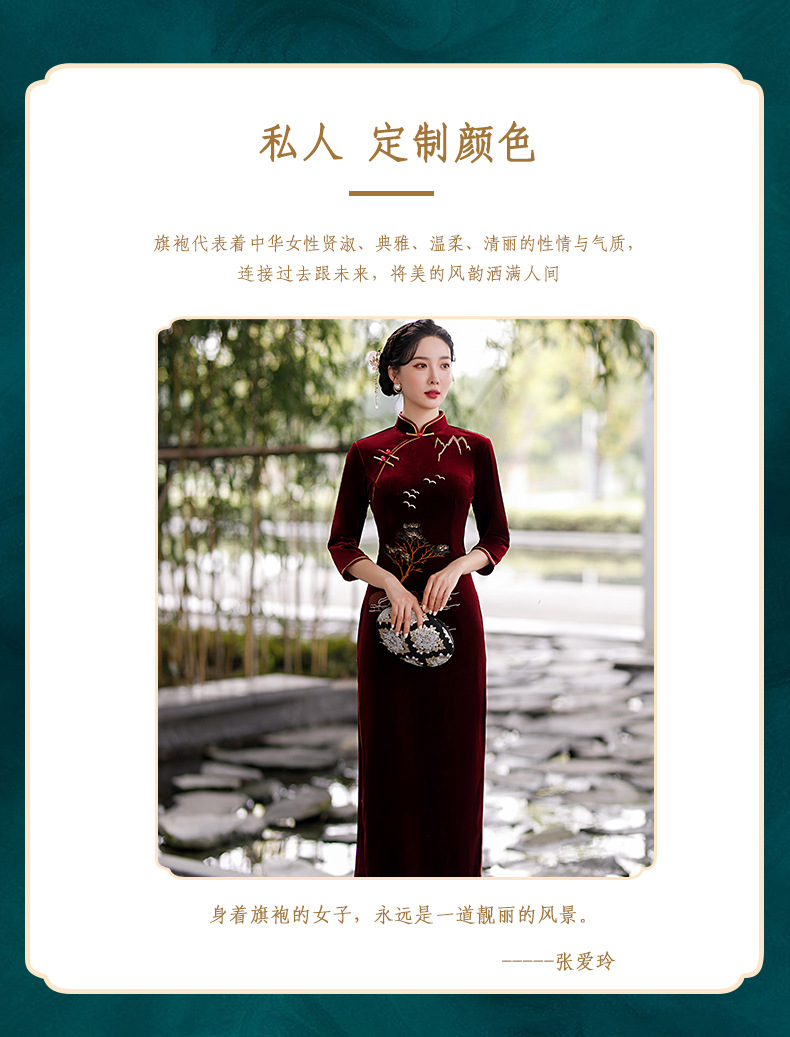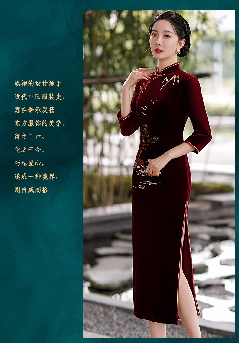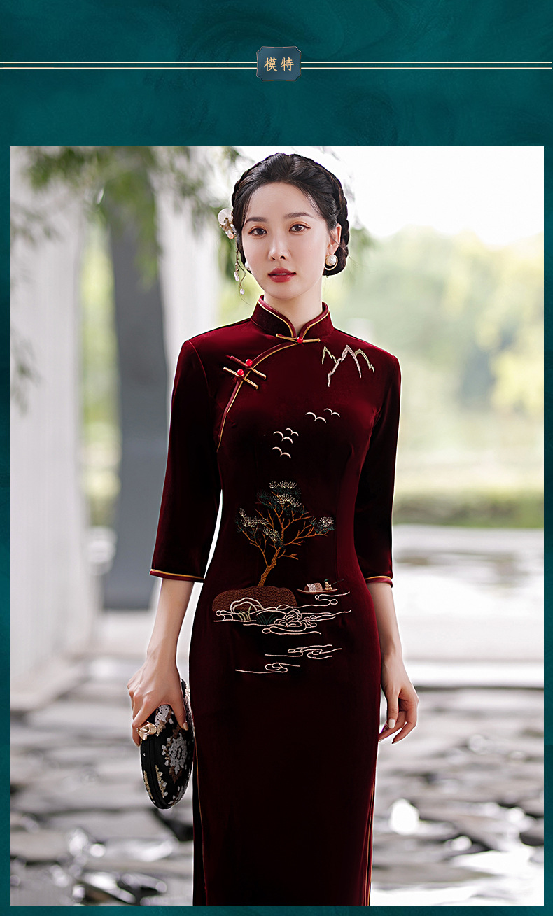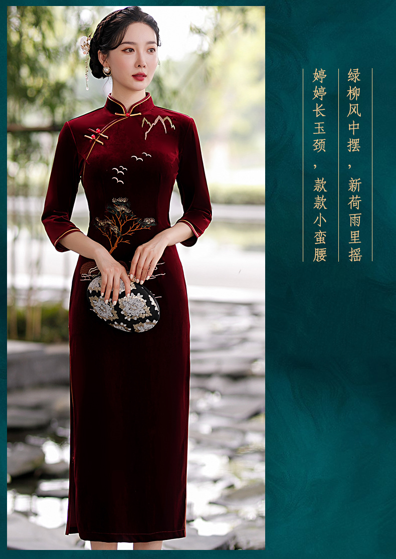 酒红色中式修身立领七分袖走秀中国风旗袍ST-B8059