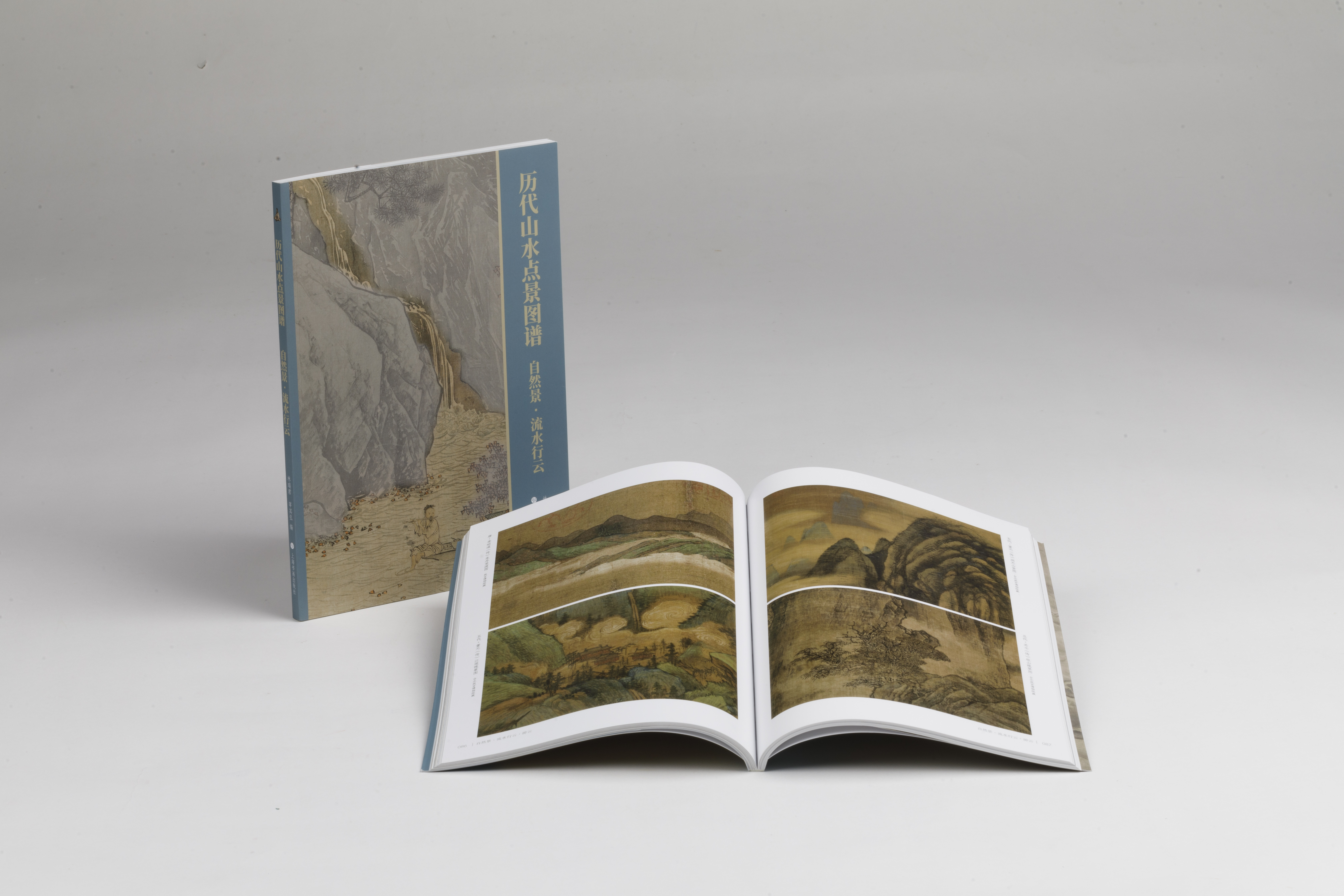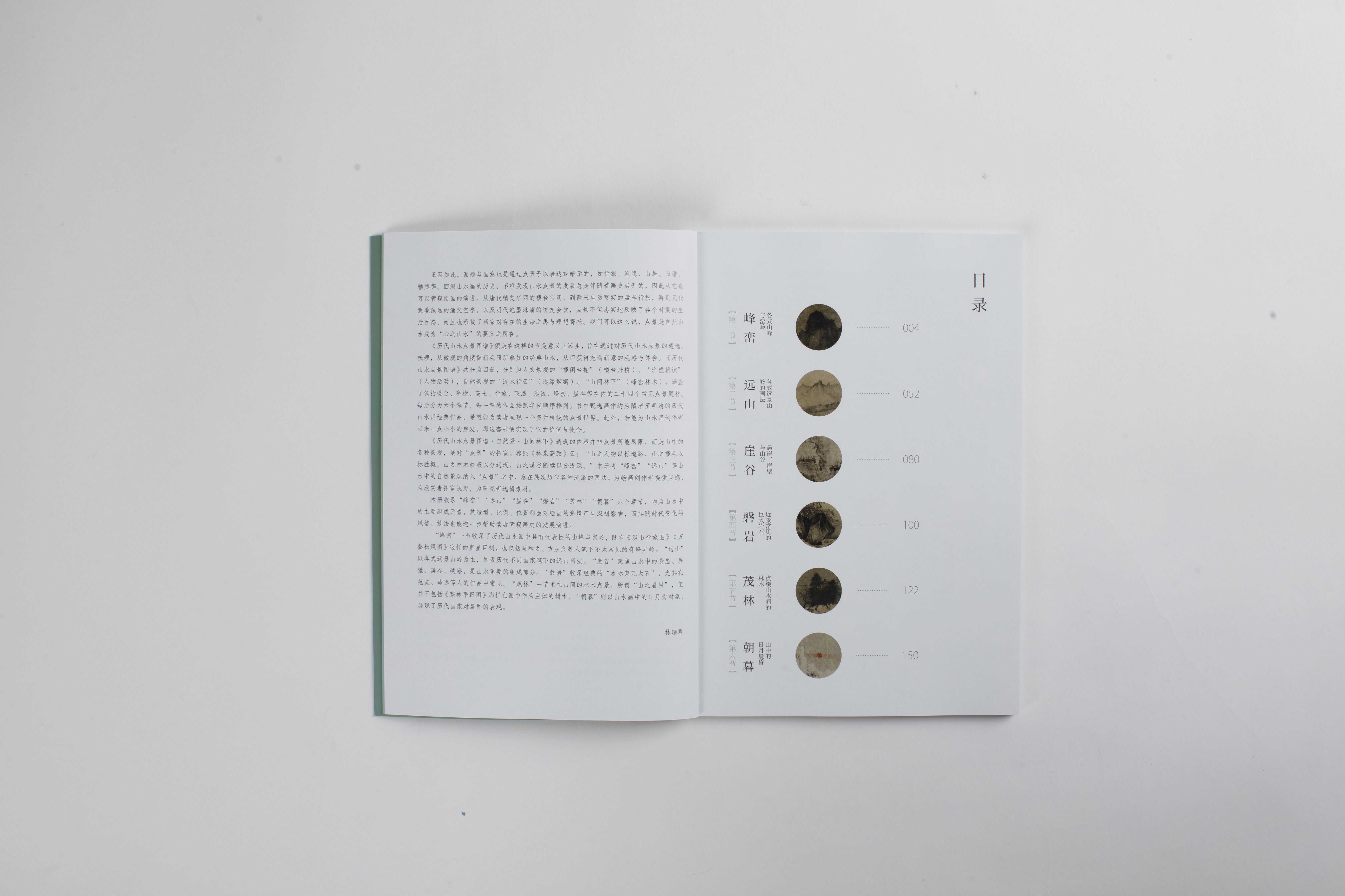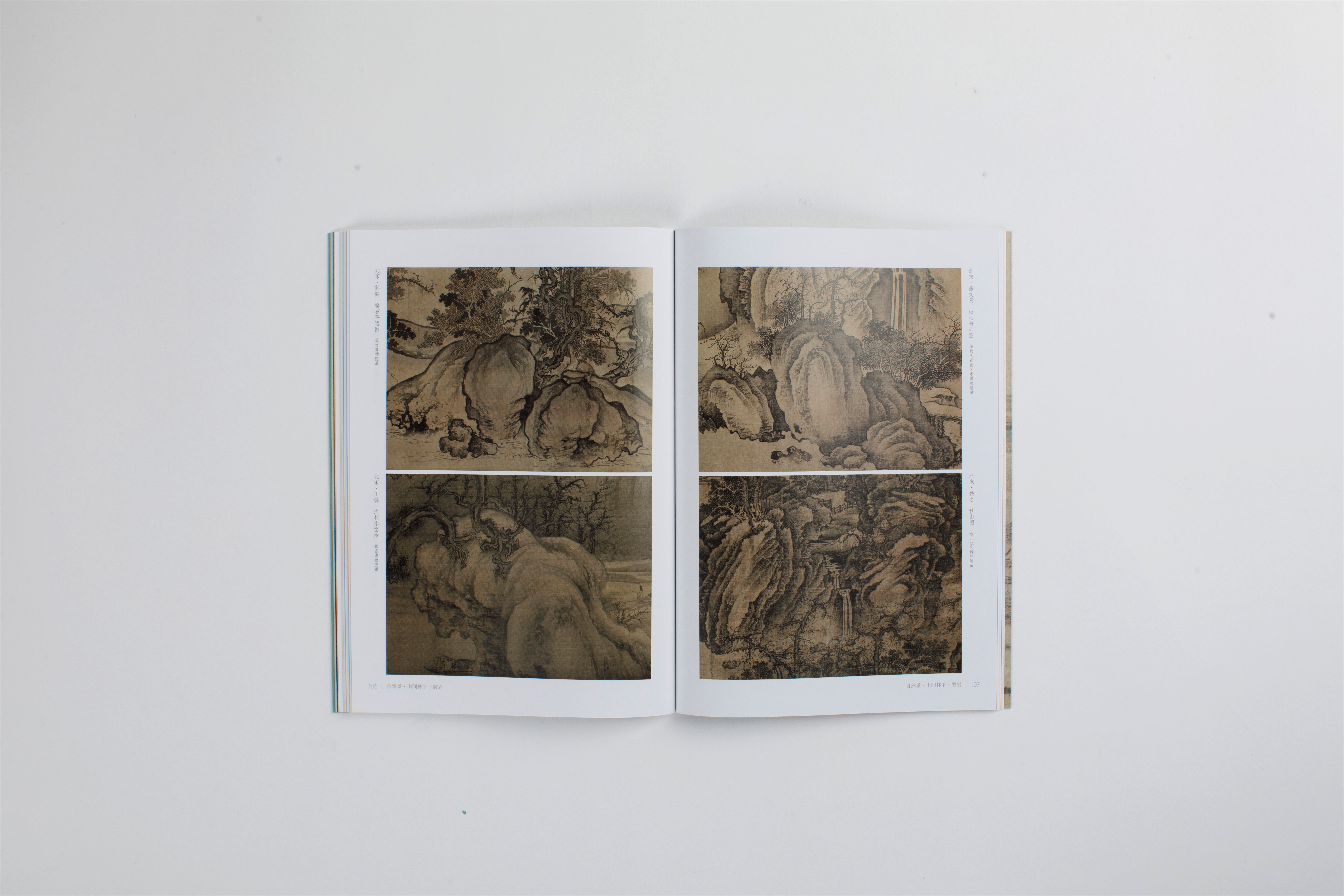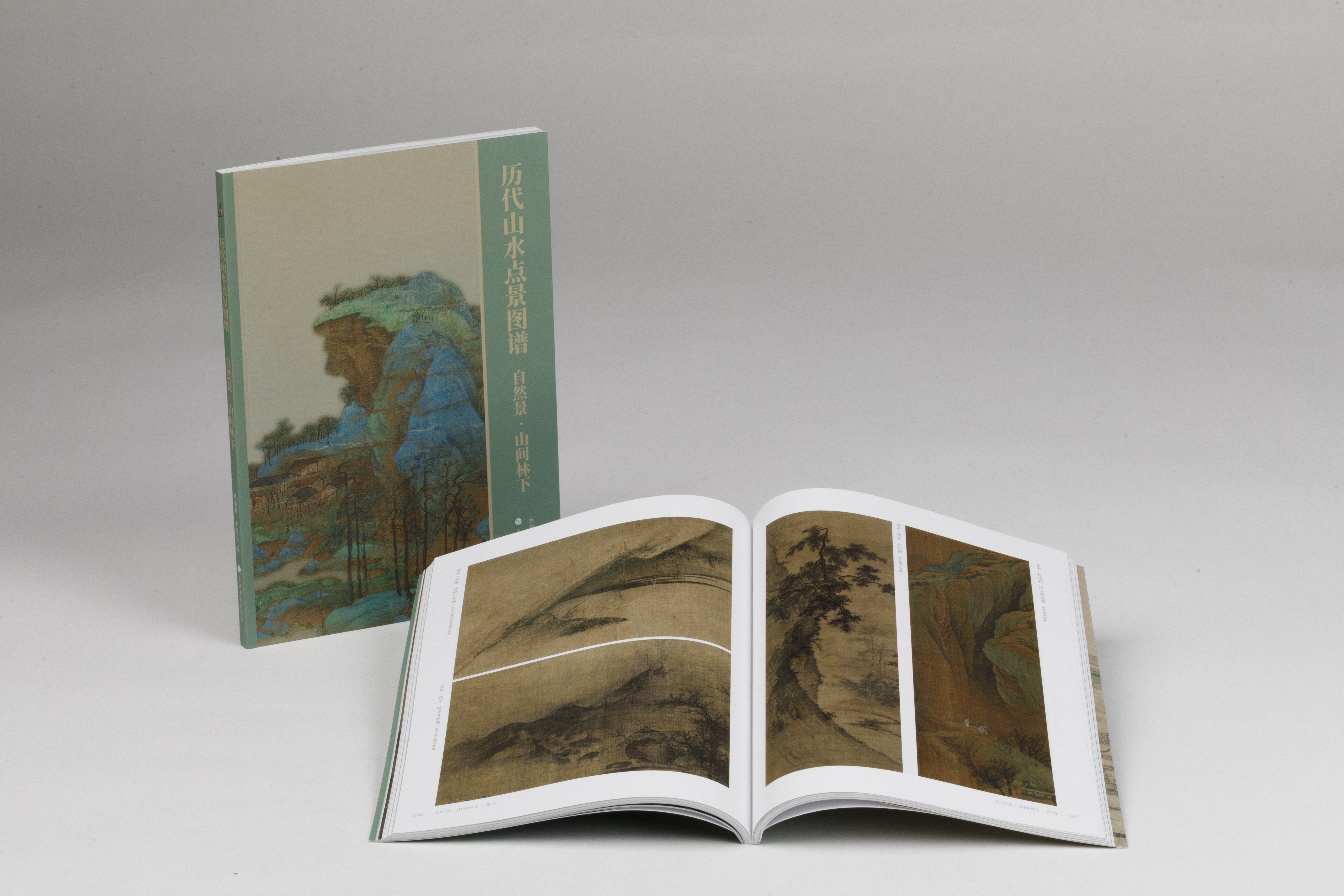 《历代山水点景图谱·自然景·流水行云》一册,收录与“云水”意象相关联的山水点景,包括“飞瀑”“溪流”“水浪”“游云”“烟霭”“花草”六个章节。其中“飞瀑”一节主要收录山间垂落的瀑布与湍流落差形成的飞涧。“溪流”一节主要收录流淌山间的溪径曲水。“水浪”一节集结了历代山水画中各式的水面波纹。“游云”一节则收录了历代各式各样的云法,包括勾勒、渲染、留白、敷粉等各种画法描绘的云。“烟霭”一节关注山水中对雾色、烟霭的表现,重在氛围的体现、意境的烘托。“花草”一节收录水畔山间的芦苇、荷塘、野花等植物点景。在山水画中,水既富有诗意,也是意境的来源。崖壁上悬挂的飞瀑给人一种庄严肃穆的高远之美;深谷中纵横交错的溪涧则营造出一种深远的意境;至于辽阔的平远之境,只能通过烟波浩渺的空旷水域体现,而本册的旨趣亦在此处。《历代山水点景图谱·自然景·山间林下》遴选的内容并非点景所能局限,而是山中的各种景观,是对“点景”的拓宽。本册将“峰峦”“远山”等山水中的自然景观纳入“点景”之中,意在展现历代各种流派的画法,为绘画创作者提供灵感,为欣赏者拓宽视野,为研究者选辑素材。本册收录“峰峦”“远山”“崖谷”“磐岩”“茂林”“朝暮”六个章节,均为山水中的主要组成元素,其造型、比例、位置都会对绘画的意境产生深刻影响,而其随时代变化的风格、技法也能进一步帮助读者管窥画史的发展演进。“峰峦”一节收录了历代山水画中具有代表性的山峰与峦岭。“远山”以各式远景山岭为主,展现历代不同画家笔下的远山画法。“崖谷”聚焦山水中的悬崖、岩壁、溪谷、峡峪,是山水重要的组成部分。“磐岩”收录经典的“水际突兀大石”。“茂林”一节重在山间的林木点景,所谓“山之眉目”,但并不包括《寒林平野图》那样在画中作为主体的树木。“朝暮”则以山水画中的日月为对象,展现了历代画家对晨昏的表现。
