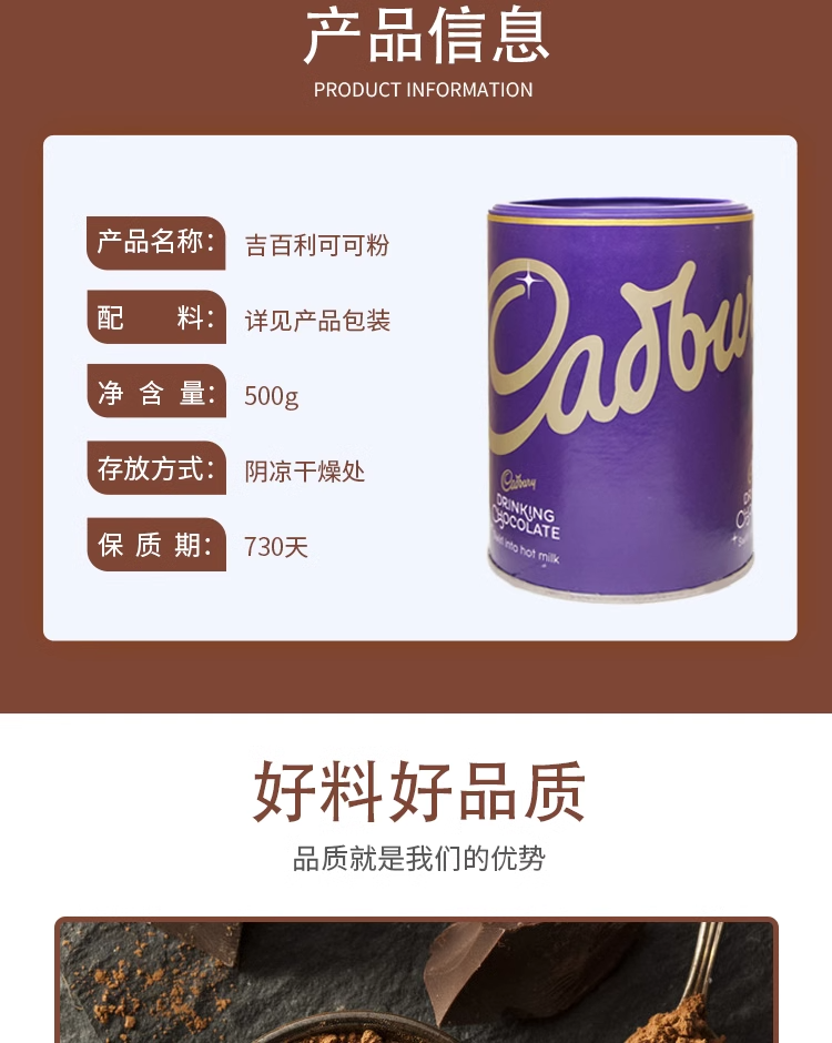 【中欧班列精选】英国进口吉百利巧克力粉可可粉朱古力粉热冲饮品500g 烘焙甜品料