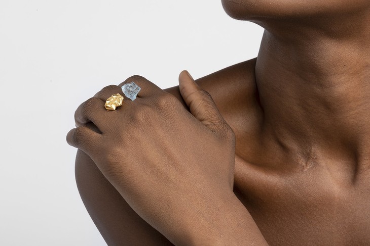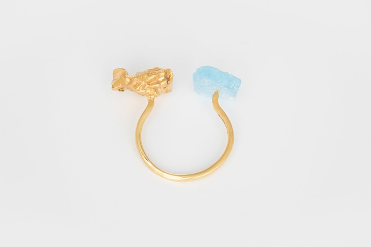 材质:Hand crafted 925 silver ring with 18k gold plating and a rough Blue Topaz.