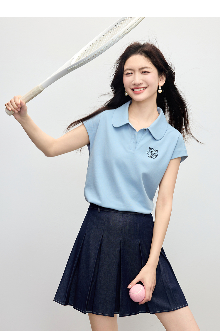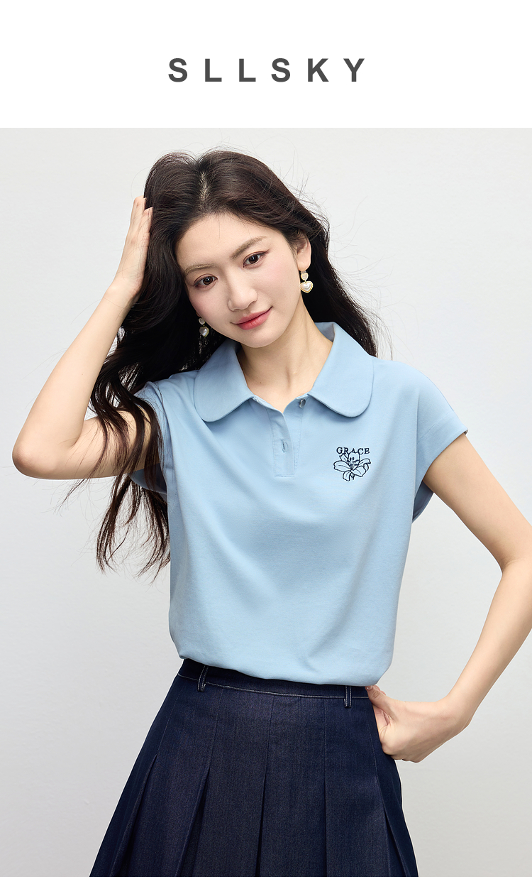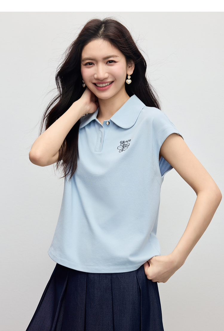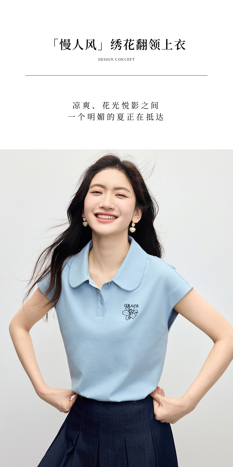 【五折购】熙世界Polo领正肩t恤女夏2025新款设计感刺绣休闲飞飞袖体恤上衣