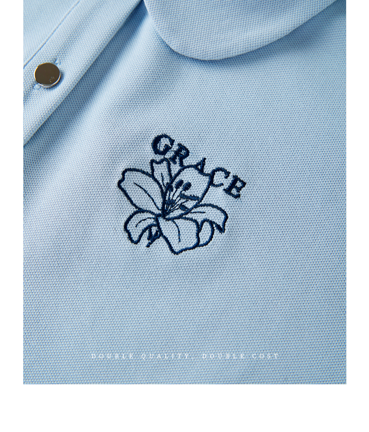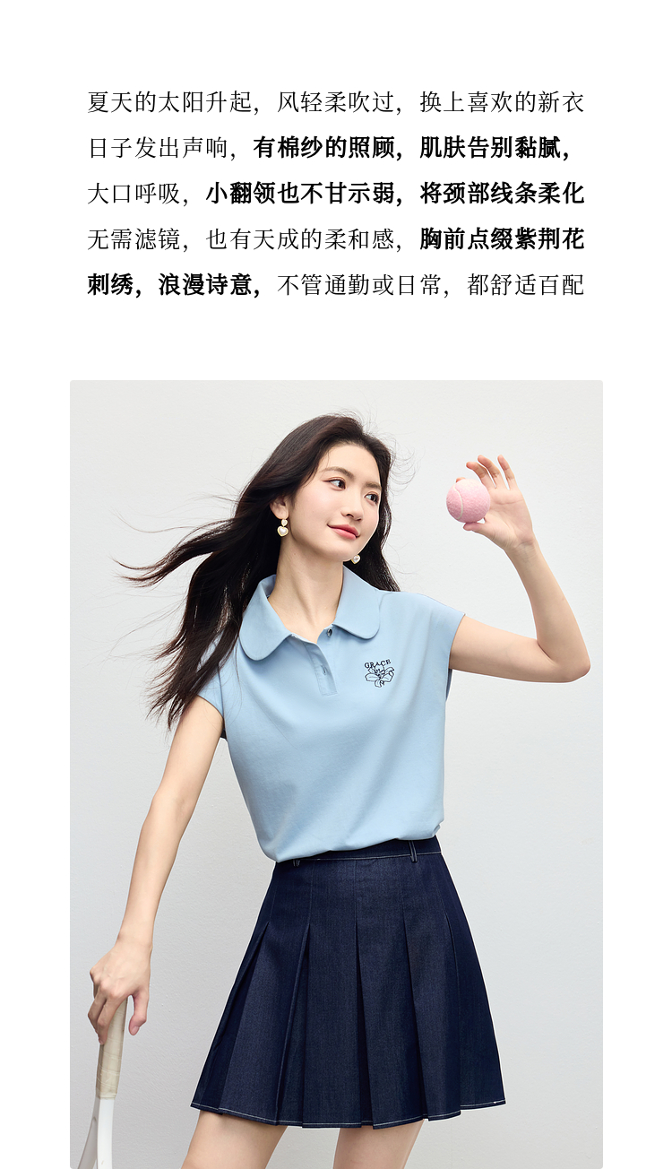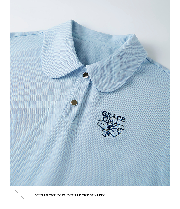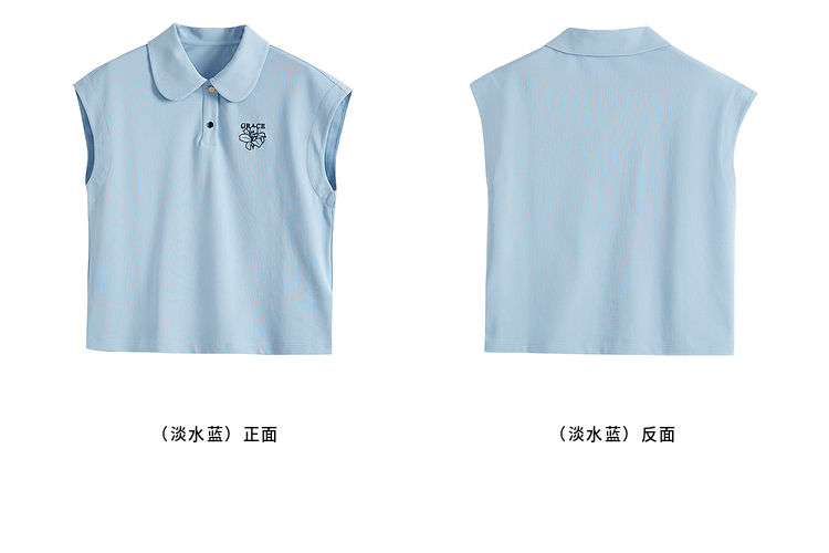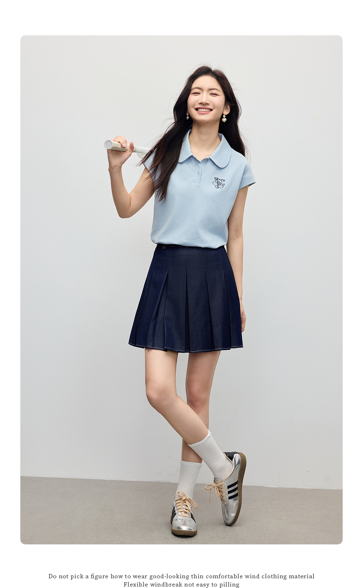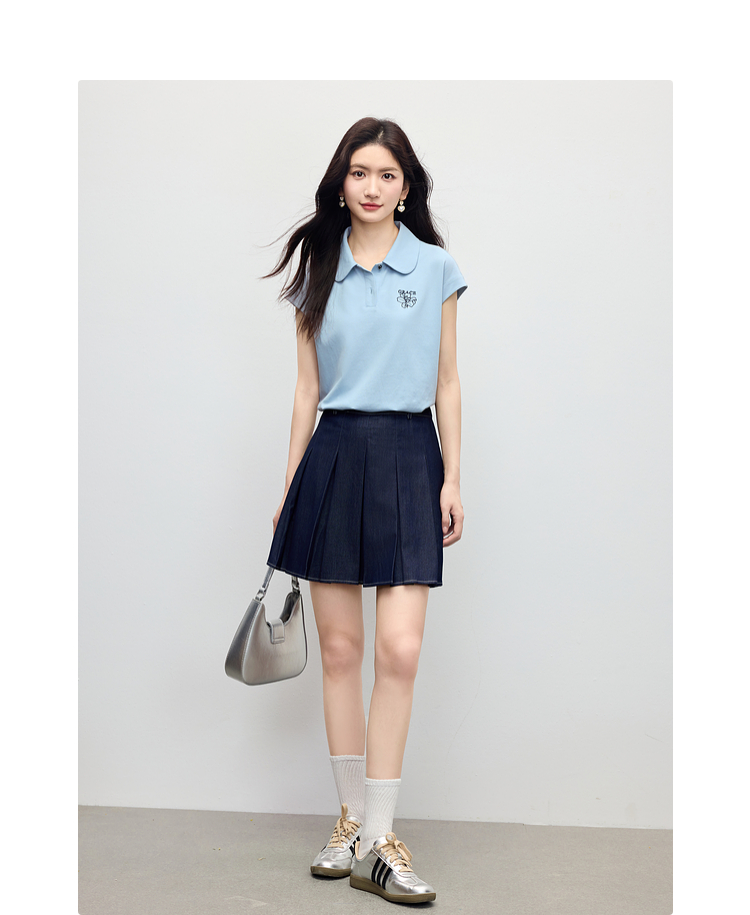【五折购】熙世界Polo领正肩t恤女夏2025新款设计感刺绣休闲飞飞袖体恤上衣