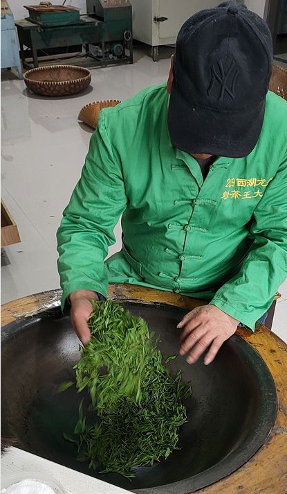 龙井茶的制作工艺流程为摊放、青锅、回潮、二青叶分筛、辉锅、干茶分筛、挺长头、归堆、贮藏收灰等,而在龙井茶的炒制中,抖、搭、拓、甩、推、抓、扣、捺、磨、压10种炒制手法则尤为关键,不是依次单独使用,而是互相结合穿插进行,而考究的工艺,是优质龙井茶的必备条件