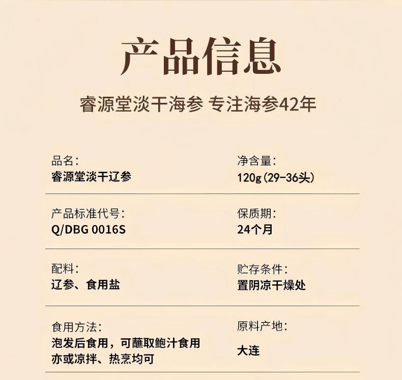 睿源堂大连淡干海参120g(29-36头)
