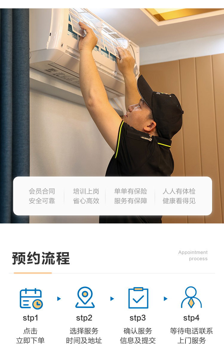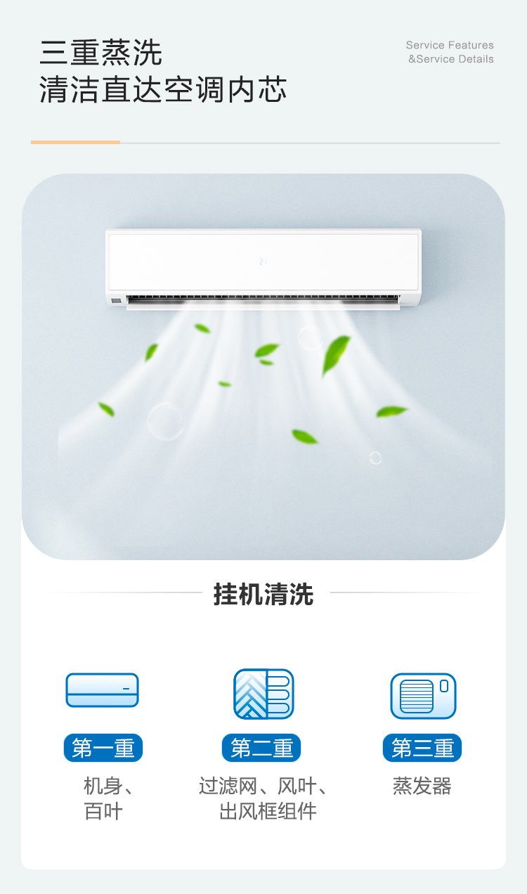 空调挂机清洗范围:滤网,蒸发器,翅片,风轮会采用高温蒸汽清洗,消毒杀菌。
