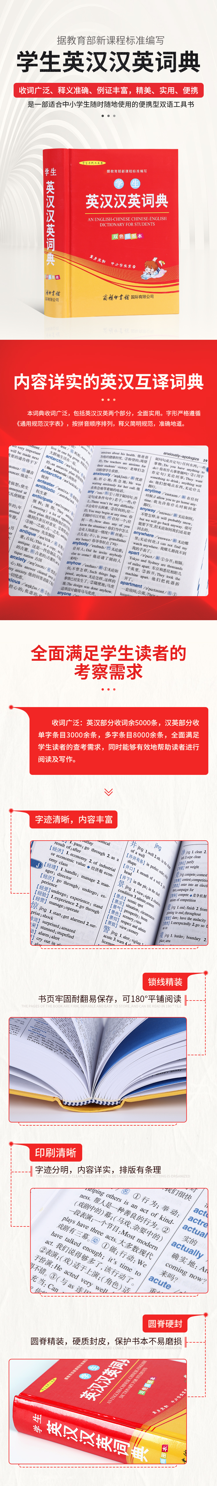 本词典收词广泛,全面实用。包括英汉汉英两个部分。英汉部分收单词及词组5000余条。词条中的释义均经过反复推敲,用词精准。例句典型、生动,将常用义项和基本用法恰如其分地展现出来。汉英部分收单字条目3000余条,多字条目8000余条。字形严格遵循《通用规范汉字表》,按拼音顺序排列。汉英释义简明规范。完全能够满足学生读者的查考需求,同时能够有效地帮助读者进行阅读及写作。