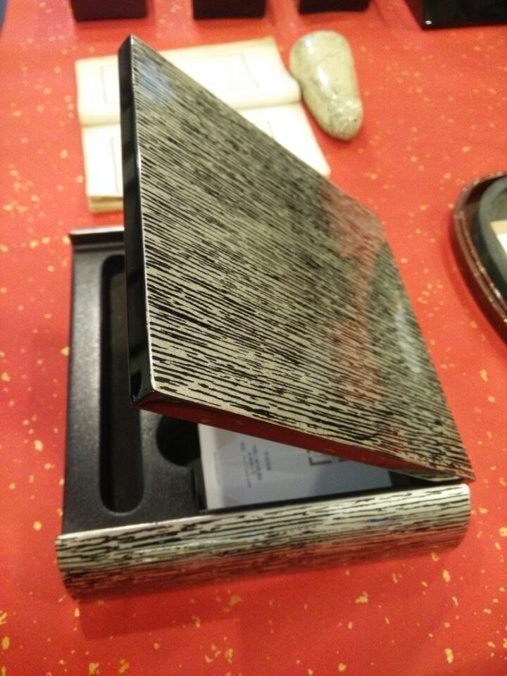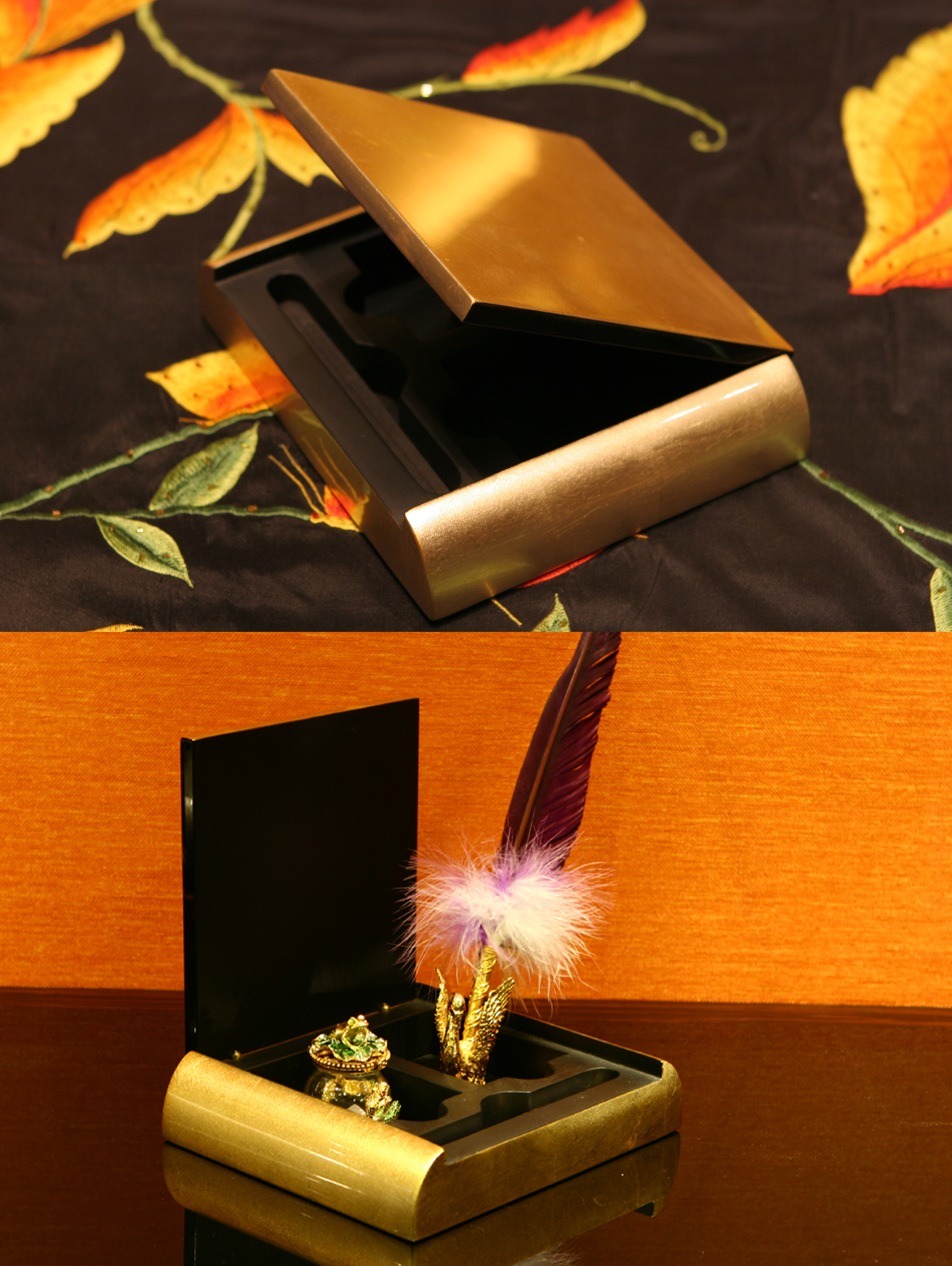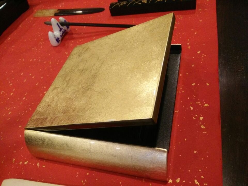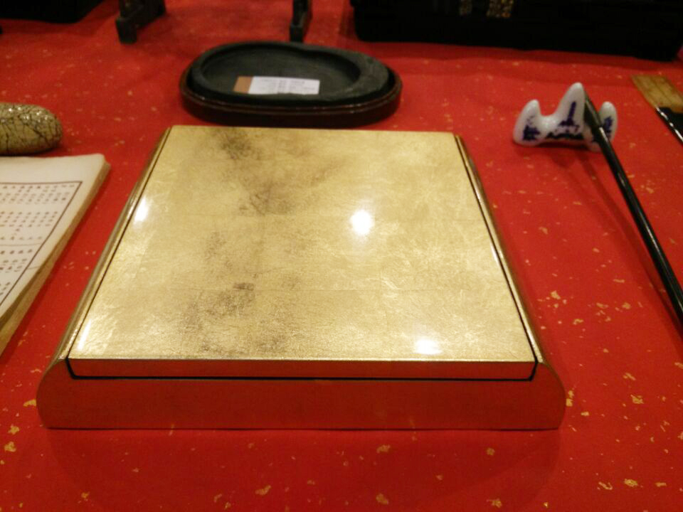 漆艺贴箔手工工艺,金色部分是用黄金打成薄金箔片,再手工裱贴在素坯上而成。
