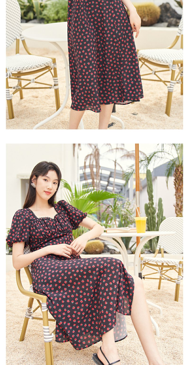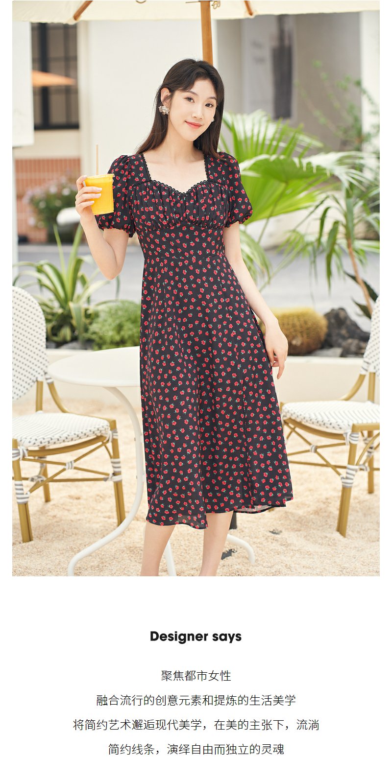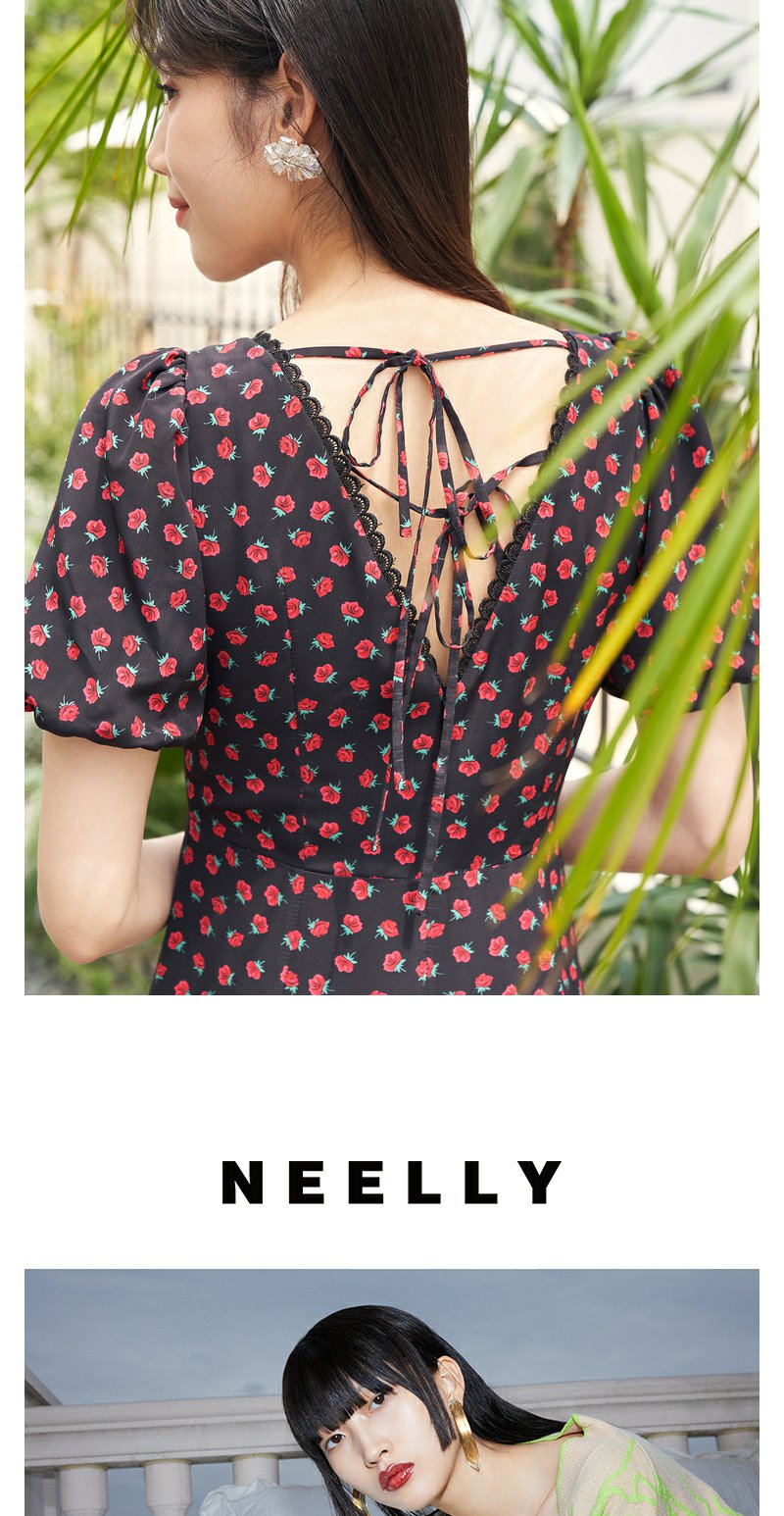 NEELLY纳俪夏季复古方领泡泡袖碎花连衣裙女雪纺A字裙露背度假风N23054Y0551621302