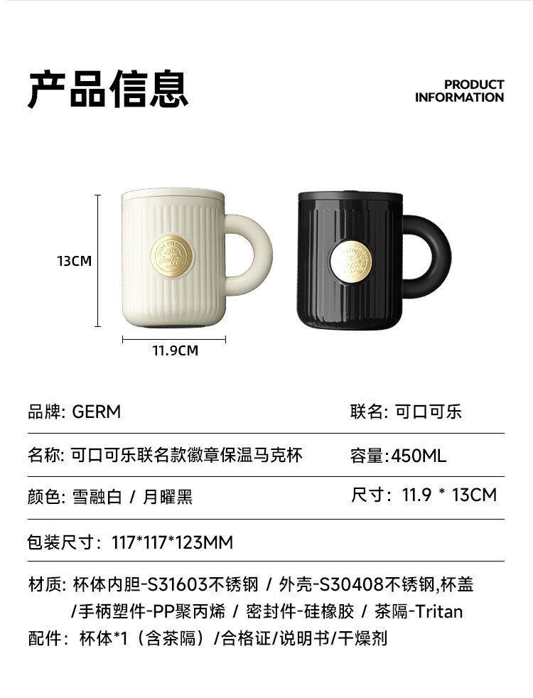 格沵(germ)马克保温杯316不锈钢大容量男女士办公室咖啡杯学生茶杯水杯子 白色【可口可乐联名】 450ml