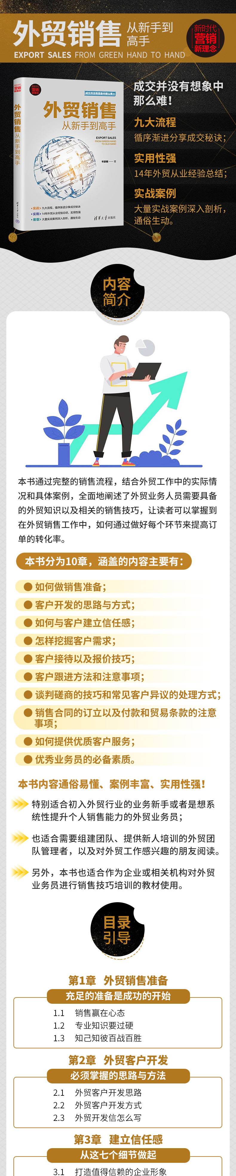 本书通过完整的销售流程,结合外贸工作中的实际情况和具体案例,全面地阐述了外贸业务人员需要具备的外贸知识以及相关的销售技巧,让读者可以掌握到在外贸销售工作中,如何通过做好每个环节来提高订单的转化率。本书分为10章,涵盖的内容主要有:如何做销售准备;客户开发的思路与方式;如何与客户建立信任感;怎样挖掘客户需求;客户接待以及报价技巧;客户跟进方法和注意事项;谈判磋商的技巧和常见客户异议的处理方式;销售合同的订立以及付款和贸易条款的注意事项;如何提供优质客户服务;优秀业务员的推荐素质。本书内容通俗易懂、案例丰富、实用性强,特别适合初入外贸行业的业务新手或者是想系统性提升个人销售能力的外贸业务员,同时也适合需要组建团队、提供新人培训的外贸团队管理者,以及对外贸工作感兴趣的朋友阅读。另外,本书也适合作为企业或相关机构对外贸业务员进行销售技巧培训的教材使用。