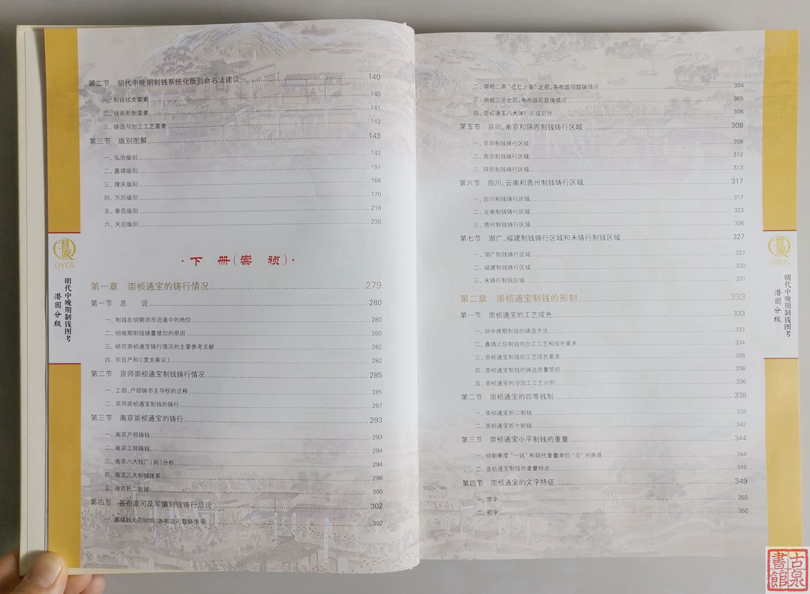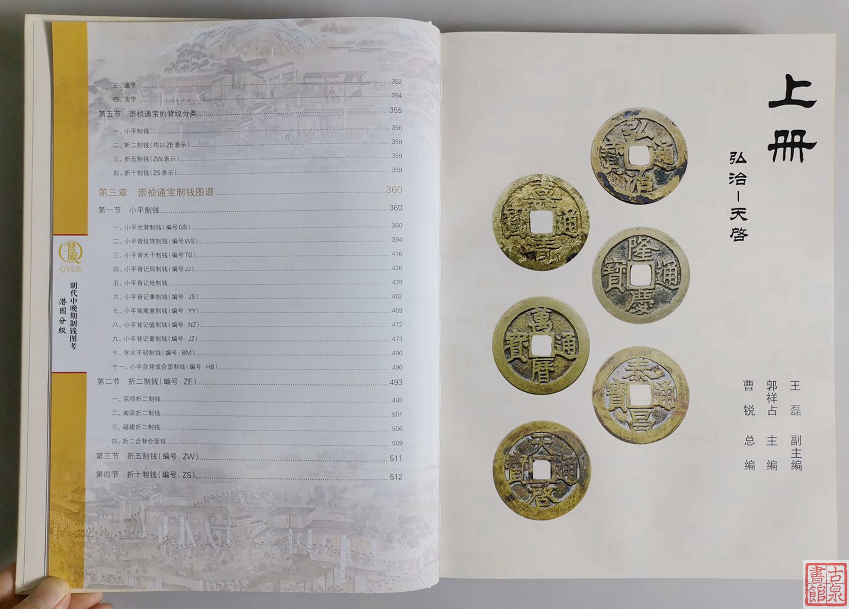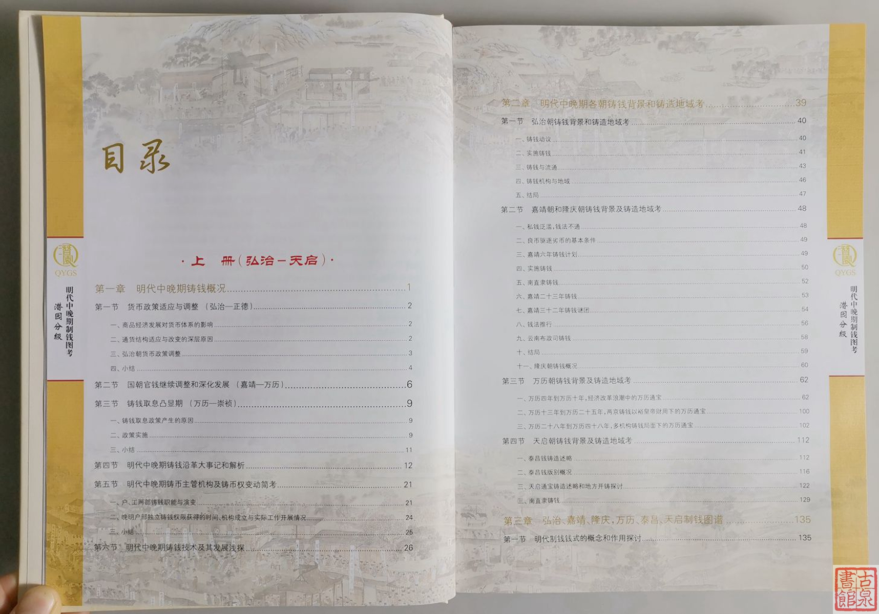 本书主要内容为∶明代中晚期铸钱概况、明代中晚期各朝铸钱背景和铸钱地域考、崇祯钱铸行总况、弘治到天启钱版别图解、崇祯钱版别图解。参考资料涉及《明实录》、《大明会典》、《钦定续文献通考》等古籍善本资料达 70 余种,《中国货币史》、《中国钱币大辞典·元明编》、《大明泉谱》、《崇祯通宝钱谱》、《铜钱危机视野下的明代币制变革》等明代货币学、钱币学书籍、论文等达数十种。是迄今为止,明代中晚期制钱研究中查考资料特别丰富的一部著作。图册部分收录了从弘治通宝到崇祯通宝,共7个年号钱的制钱实物高清图片达2000 余张,绝大部分来自于大明泉社泉友的藏品,涵盖了目前发现的大部分明代中晚期制钱版别。是广大明钱发烧友版别参考、辨伪的入门级实用工具书。
