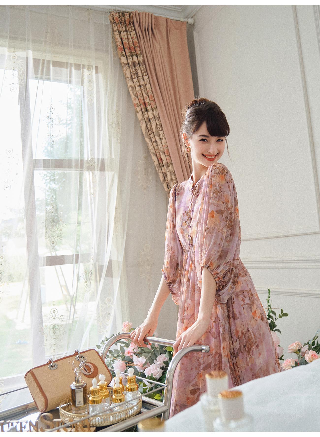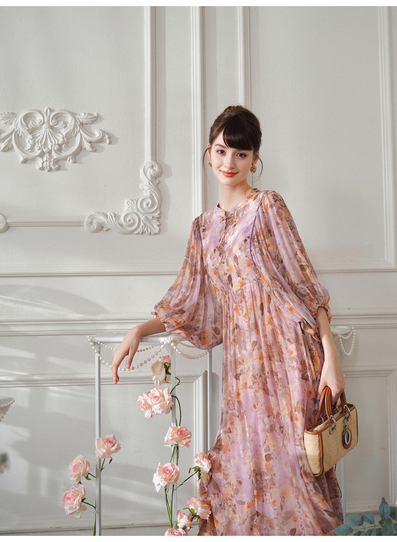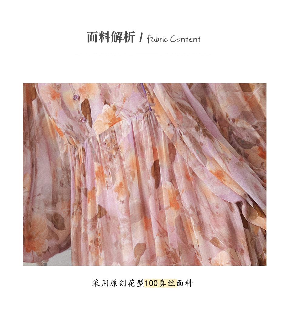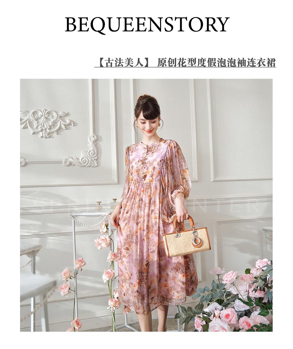 BeQueenStory【古法美人】原创花型100桑蚕丝度假泡泡袖女装连衣裙