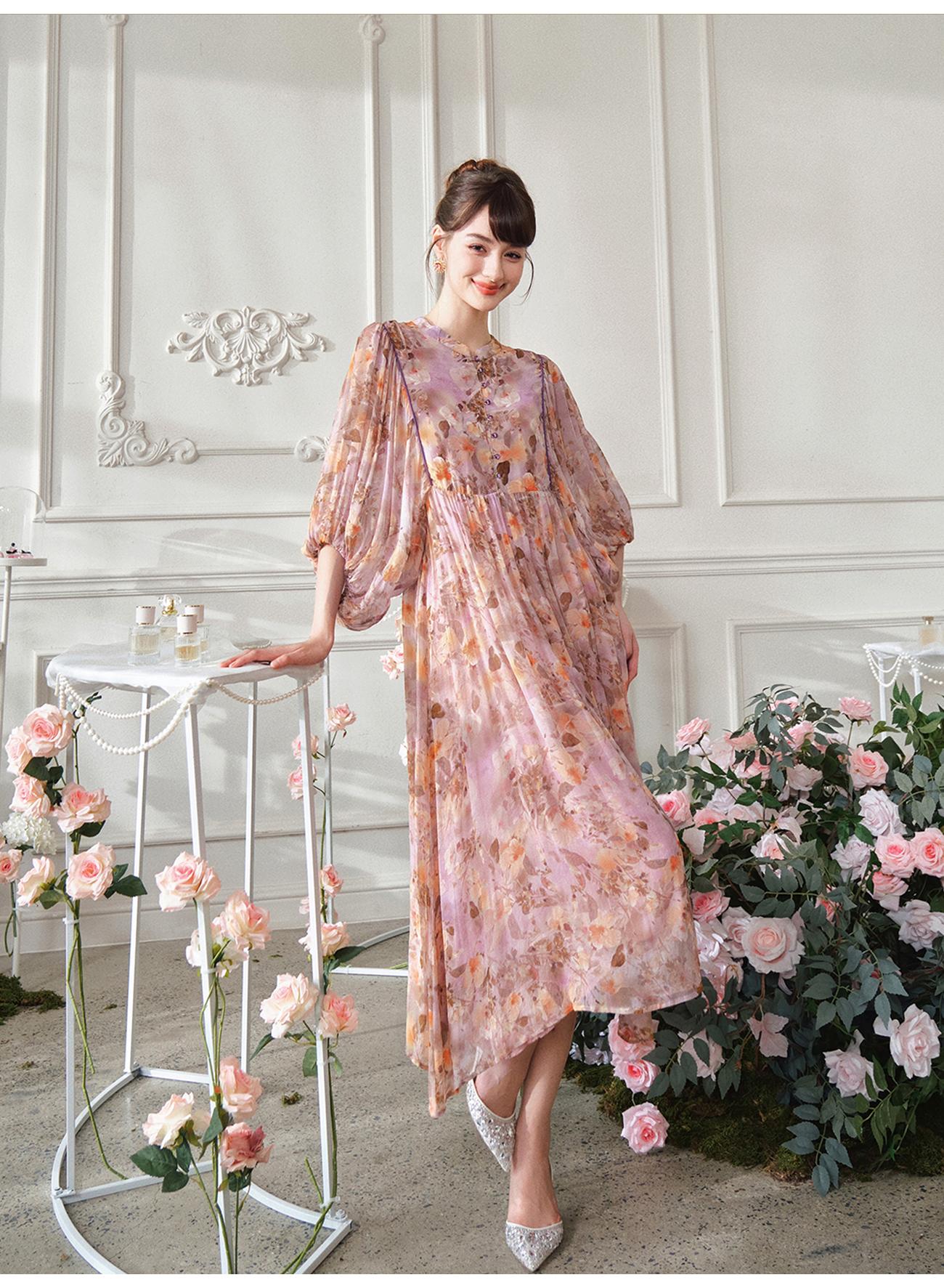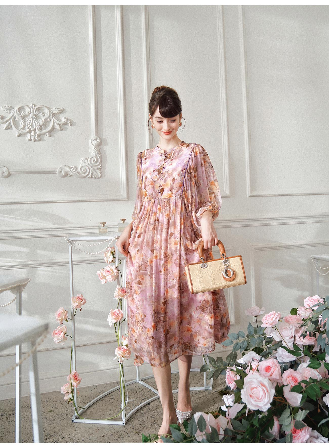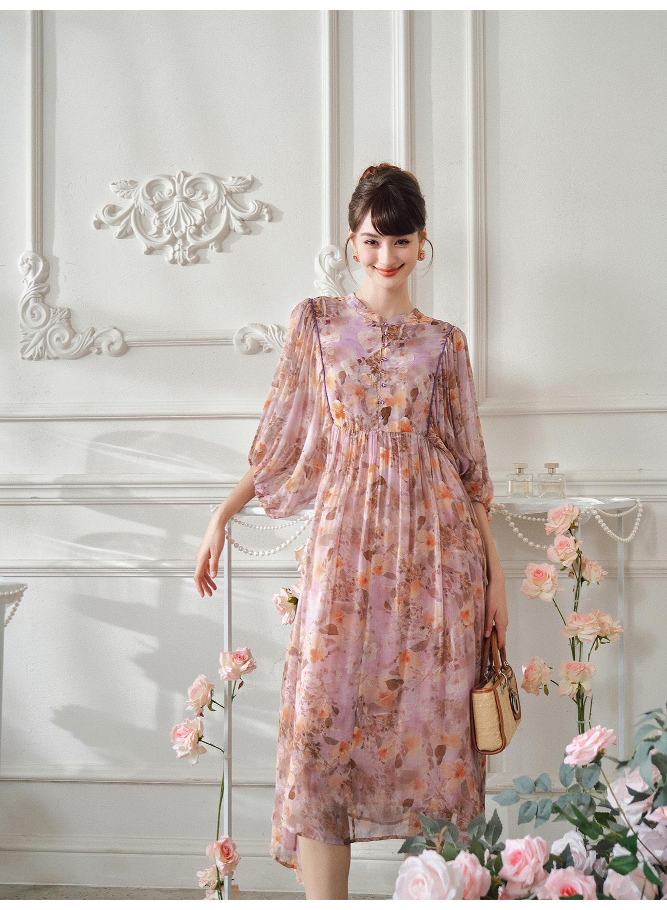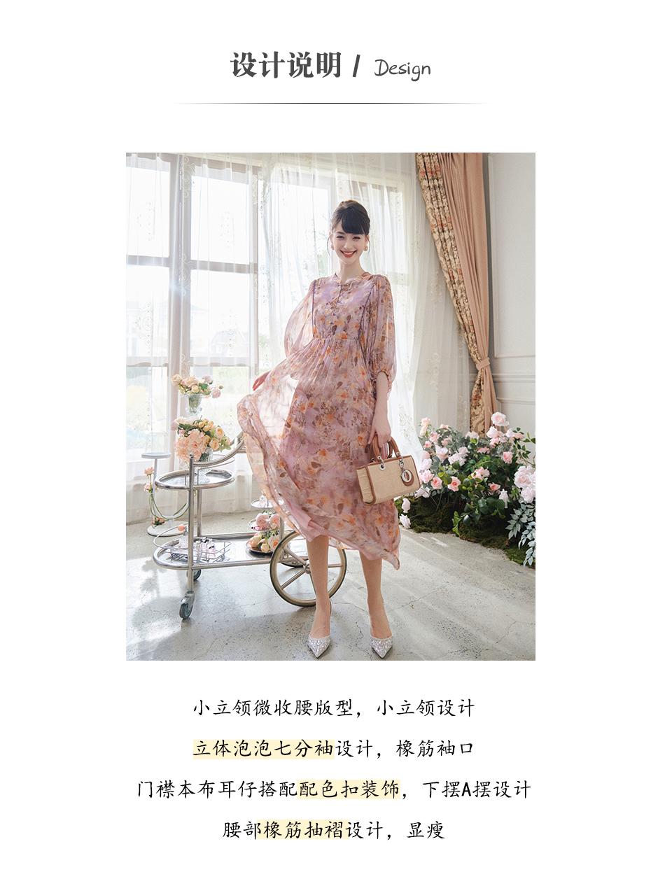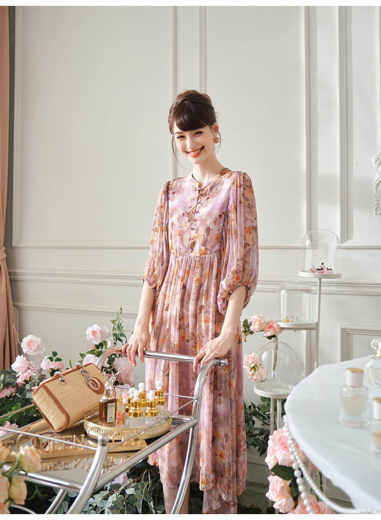 BeQueenStory【古法美人】原创花型100桑蚕丝度假泡泡袖女装连衣裙