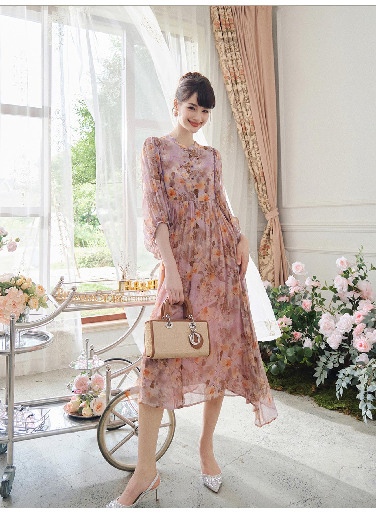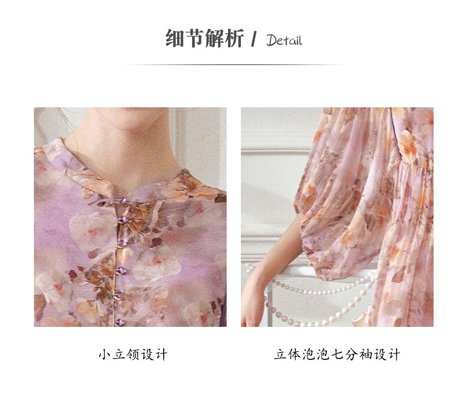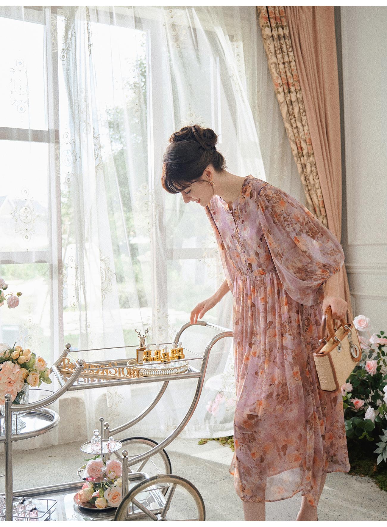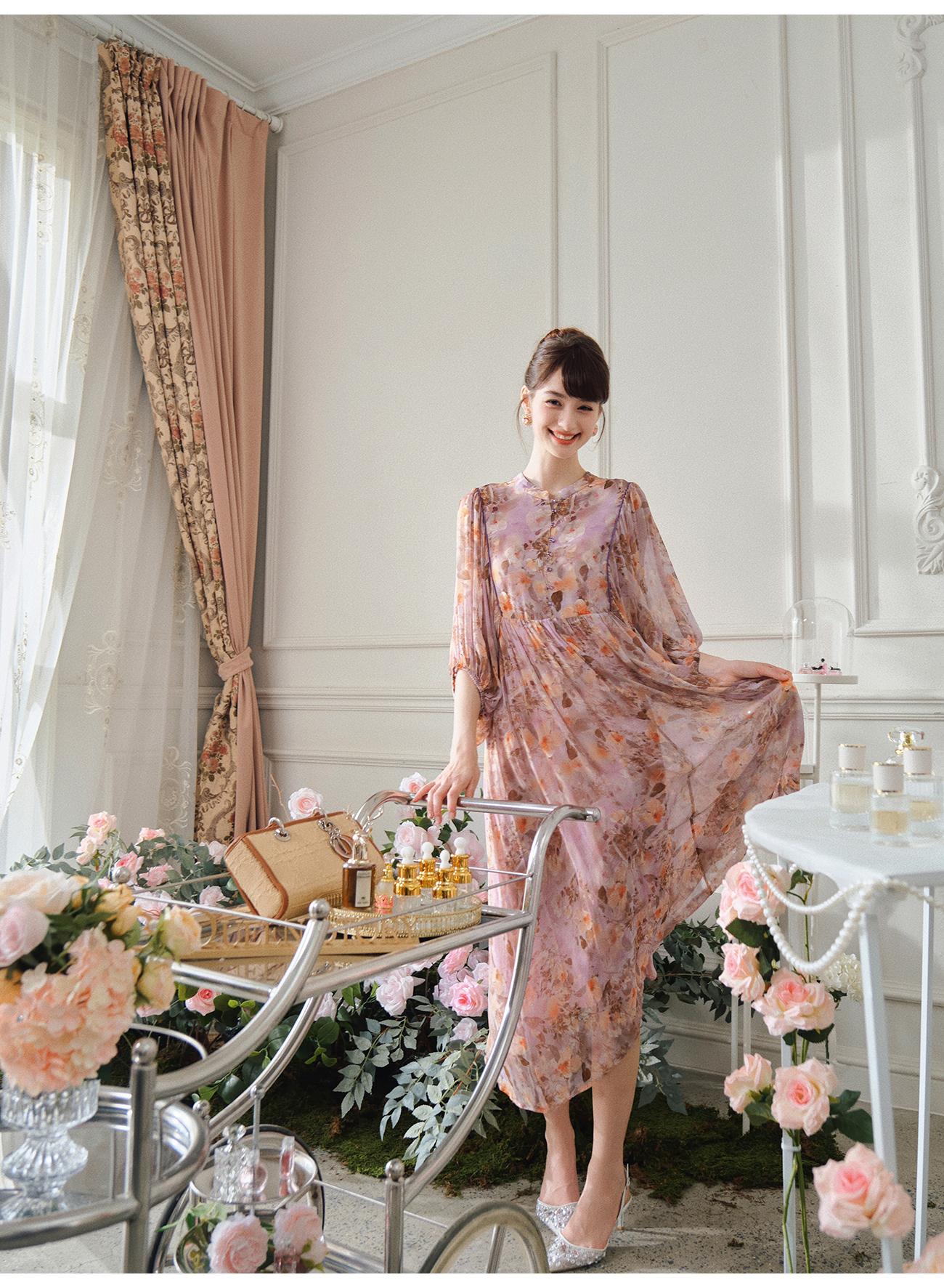 BeQueenStory【古法美人】原创花型100桑蚕丝度假泡泡袖女装连衣裙