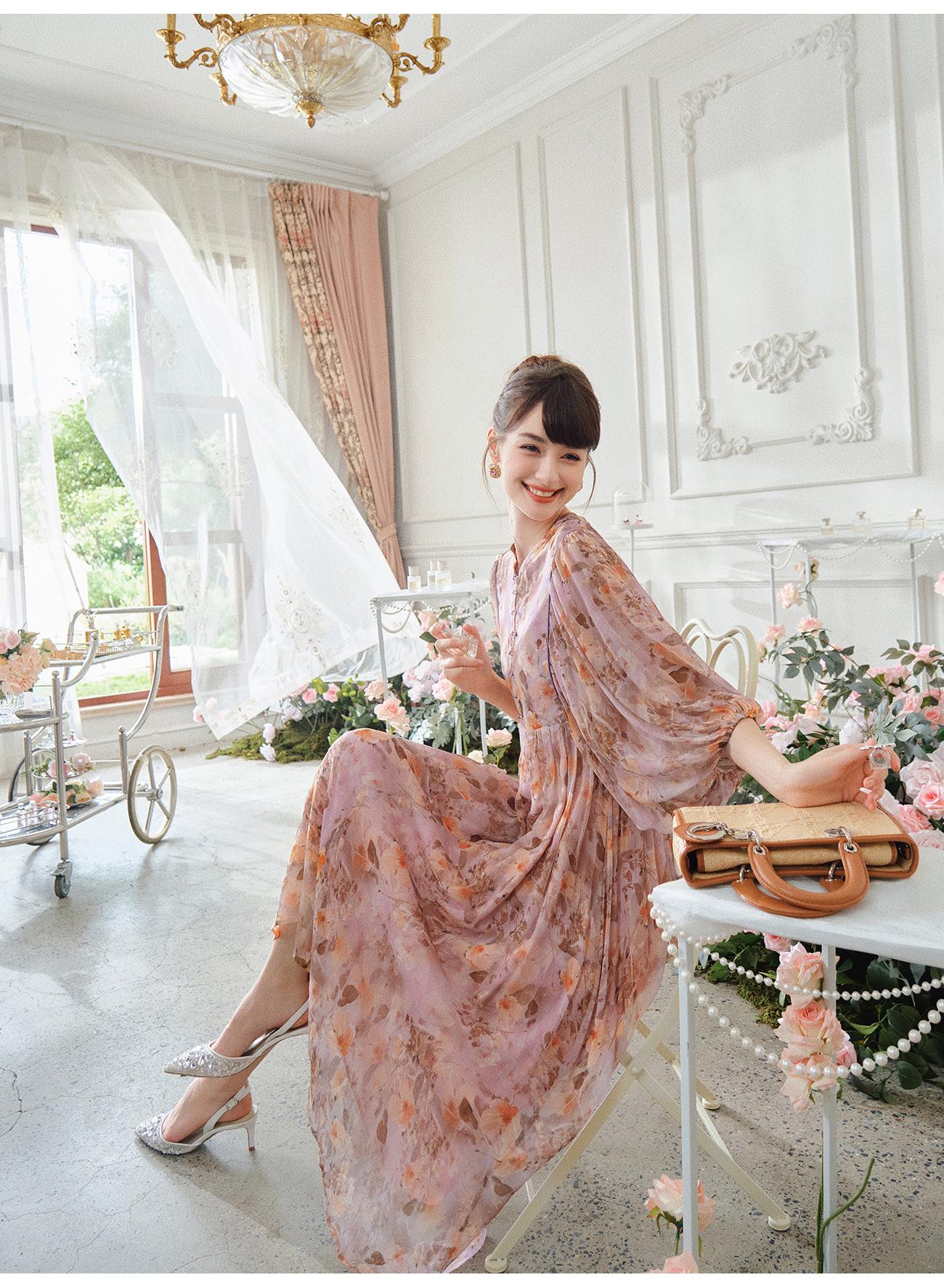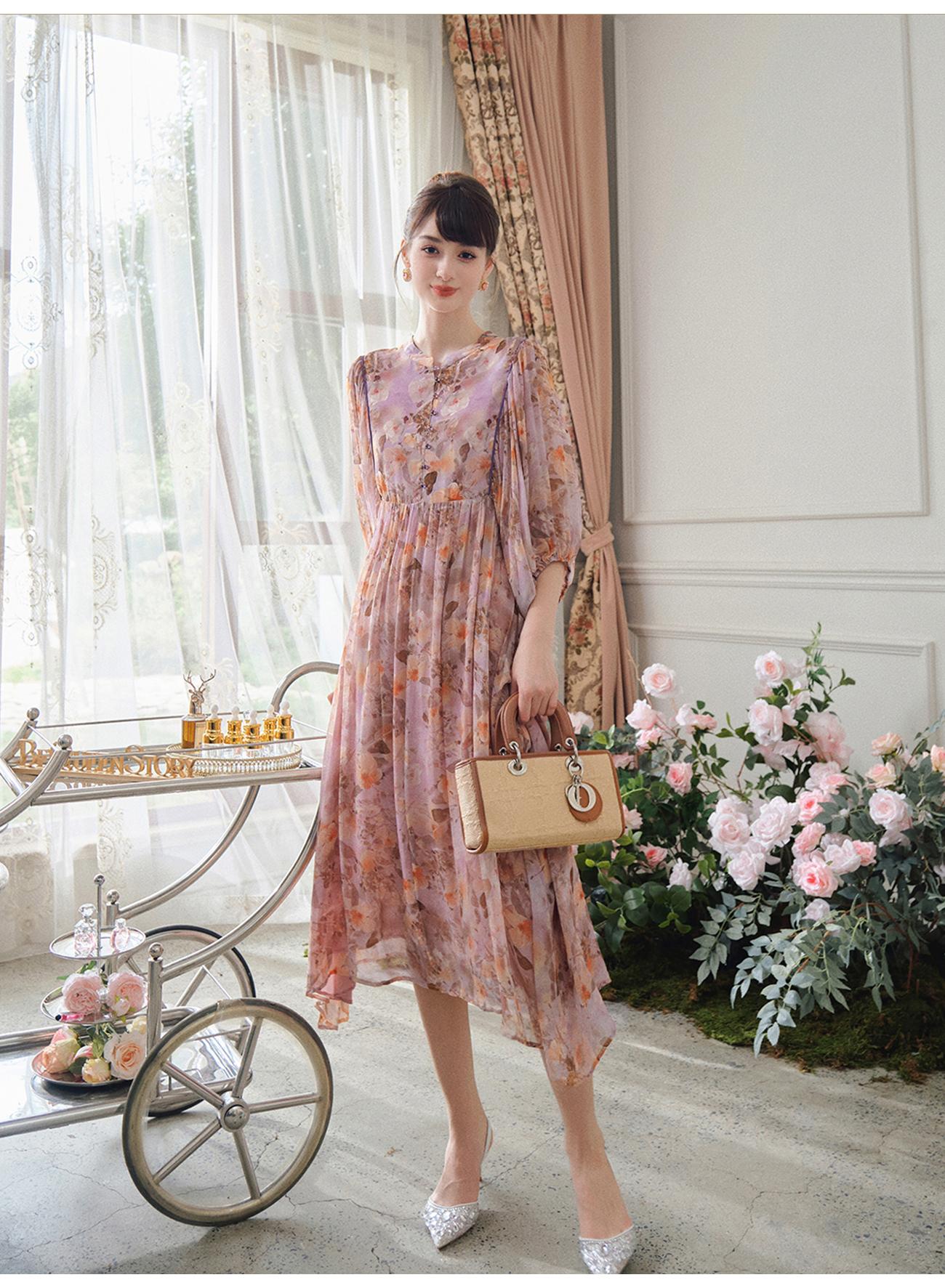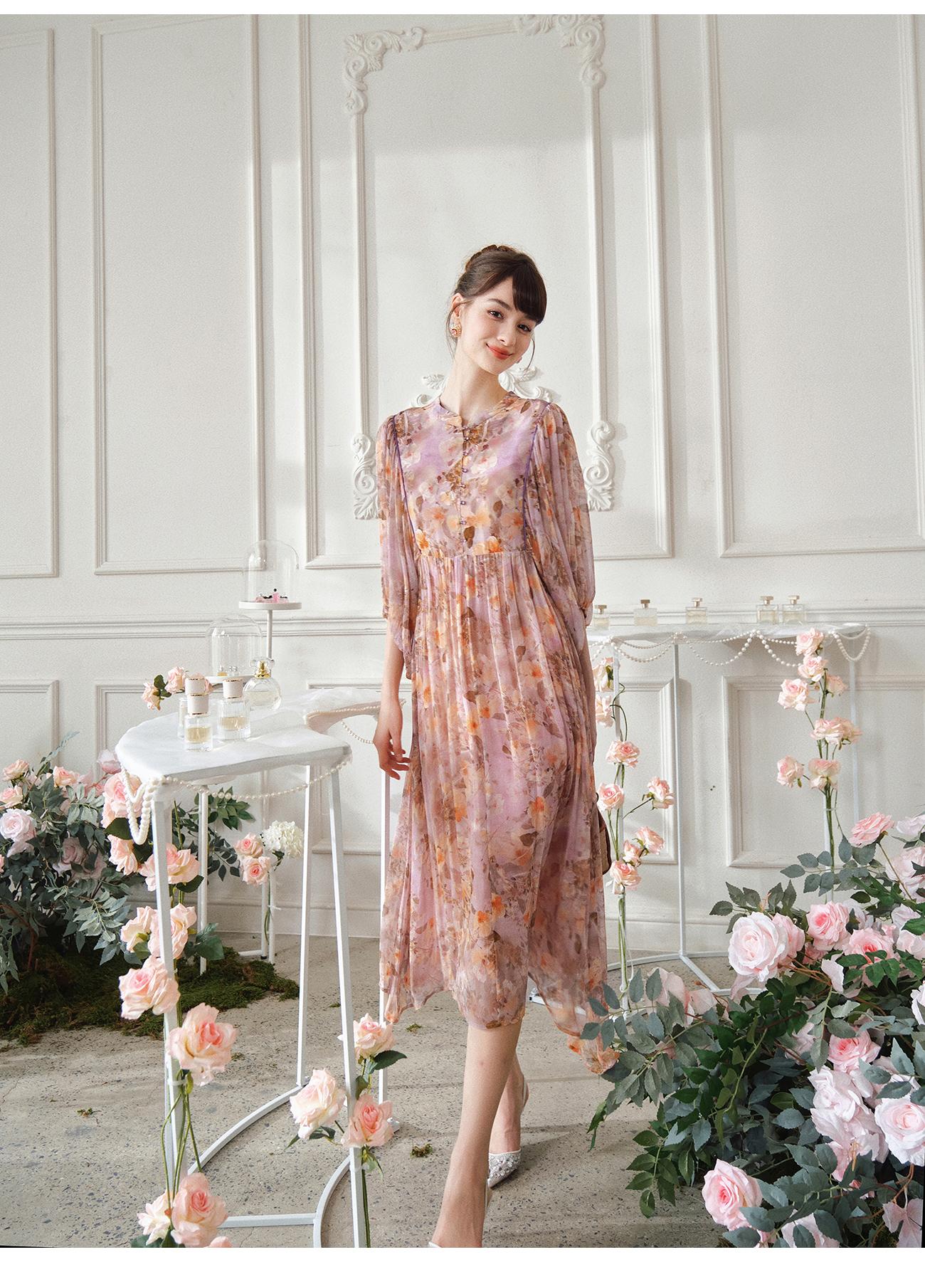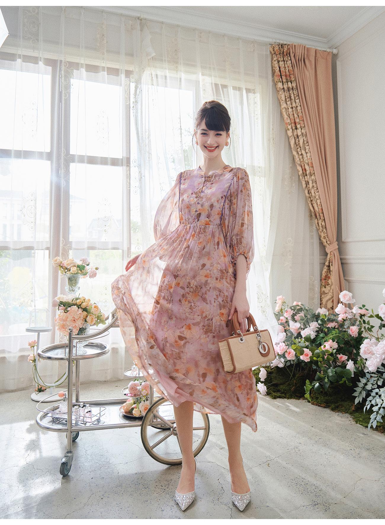 BeQueenStory【古法美人】原创花型100桑蚕丝度假泡泡袖女装连衣裙