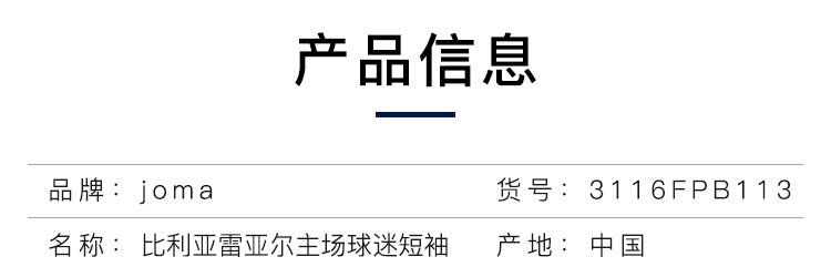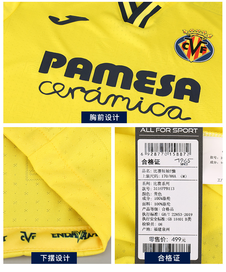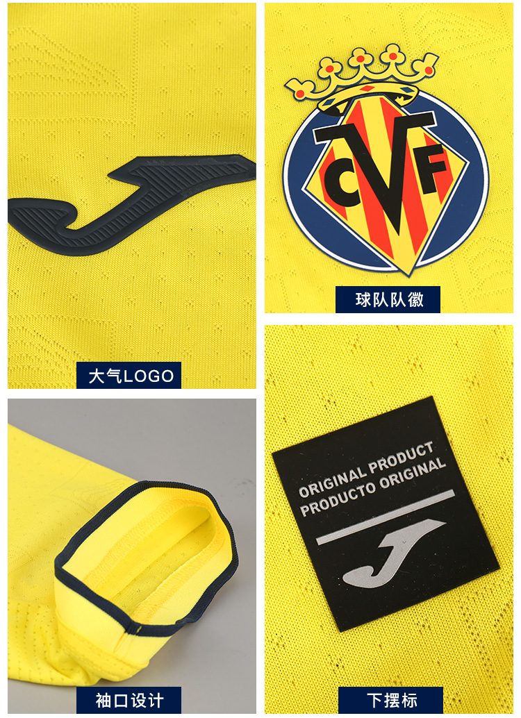 JOMA/荷马比利亚雷亚尔主场球迷版比赛短袖足球服成人男