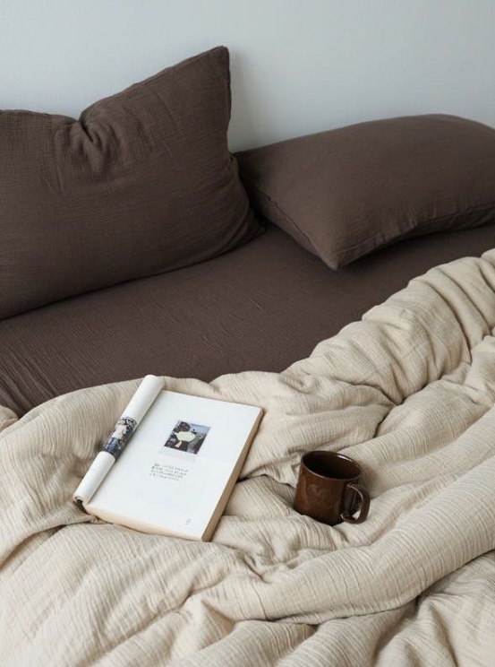 ✅ 褶皱美学|故意不烫平的奢侈 "这不是瑕疵,是年薪百万设计师的隐藏彩蛋!" 🌰栗子棕x燕麦白|冷灰调x奶油米 ✔️ 微皱纹理放大面料肌理感|光影下有流动的丝绸光泽 ✔️ 色块拼接撞出低调贵气|老师傅剪裁撞色,低调贵气不撞款,比纯色生动,比印花克制 铺上秒变杂志拍摄现场,闺蜜来了不肯走! ✅ 母婴级安全|把宝宝标准卷给成人 ▫️ 通过62项SGS检测|甲醛、荧光剂、重金属全绿 ▫️ 洗烘50次不起球|越旧越有vintage味道 ▫️ 适配15-28℃四季裸睡|冬蓄热夏排汗的黑科技