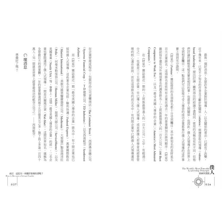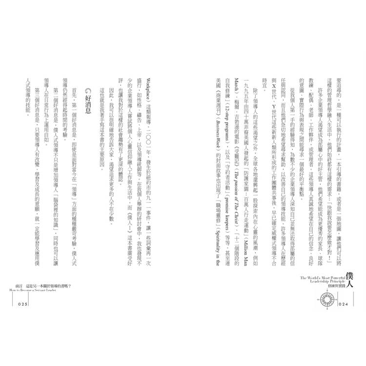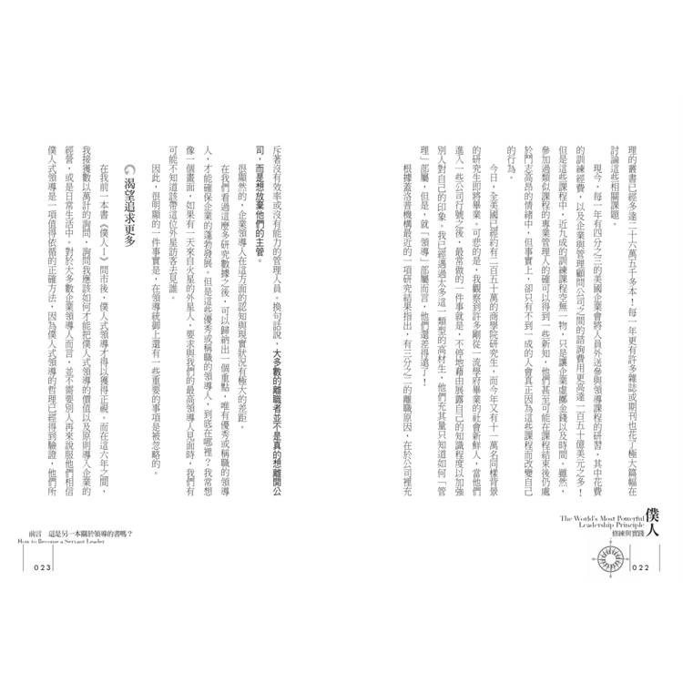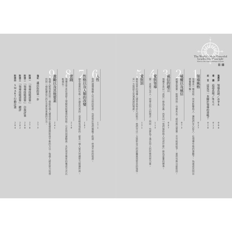 此外,作者並以三個篇章分別說明領導人的性格養成、改變的重要性,以及激勵所能獲致的成效。最後,作者應用多年實務經驗擬定了一份「領導技能清單」,以確實協助讀者評估自身狀況、實踐僕人式領導。