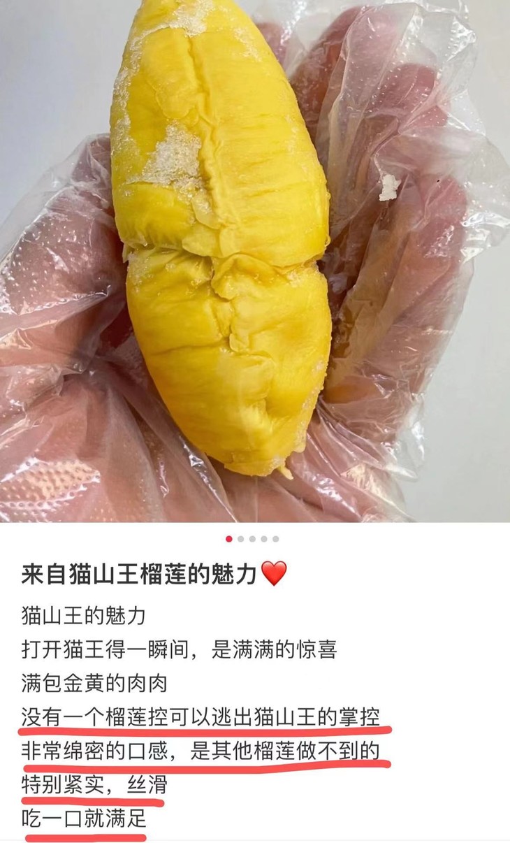 猫山王的高级之处在于 层次感不同于一般的榴莲!! 猫山王肉质嫩滑细致 初入口甘甜,后调回苦 同样是甜,更多了几分滋味 像是一位长相甜美性格冷淡清幽的美女 让人忍不住想要多花点心思去了解和欣赏
