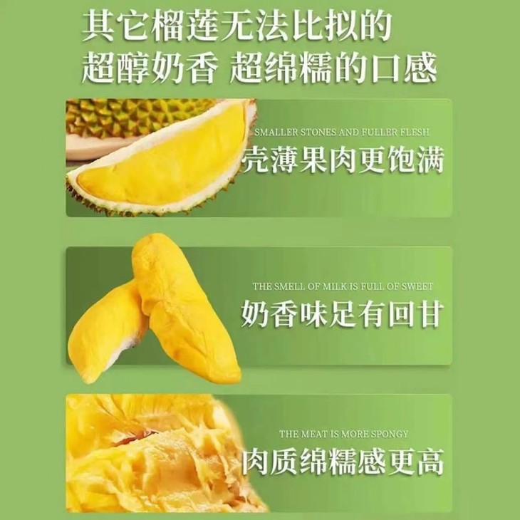 在吃货的世界里 这个世界上的榴莲只有两种 一种叫猫山王榴莲,一种叫其他榴莲 而马来西亚的猫山王榴莲达到了殿堂级别❗ 只要是吃过正宗的猫山王榴莲 哪有不沦陷的? 小豚猫山王榴莲果肉——选用的都是马来西亚🇲🇾核心产区的优质榴莲 口感绝对不会踩雷 果肉金黄,且肉质细腻,入口即化! 产量极低!只精选1%饱满A级果 肉厚核小,吃起来真的更爽! 是任何其他榴莲都无法满足的痛快!