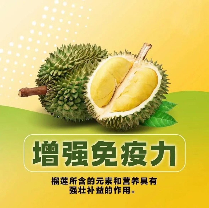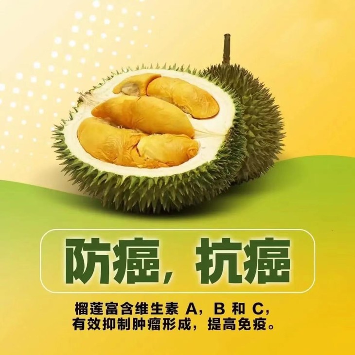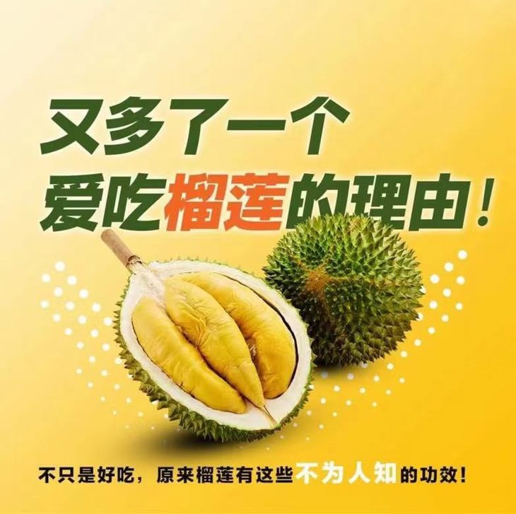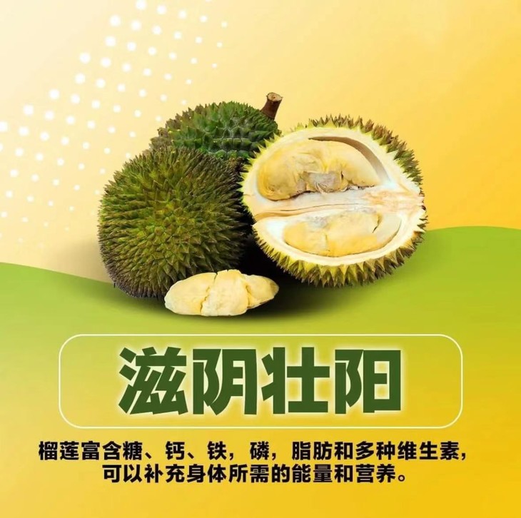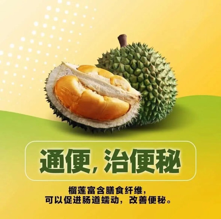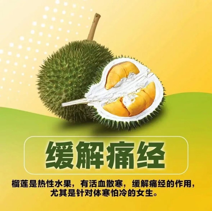 🌟关于榴莲的营养和功效: 活血散寒、强身健体、润肠通便 榴莲性热,女性经期适当食用可补肾助阳, 能缓解腹部寒凉引起的痛经症状。 另外,榴莲肉糖分、脂肪含量都比较高, 可以帮助人体补充营养的同时降低患病几率。 榴莲中也含有丰富的膳食纤维,这种成分可吸收肠道内水分, 有容性的膨胀后会刺激肠壁,促进肠道蠕动, 治疗便秘,且有助于预防直肠癌、结肠癌。 榴莲含有丰富的蛋白质和脂类,对肌体有很好的补养作用, 是良好的果品类营养来源。 榴莲补益价值相当高,有滋养强身的功用。 可治心腹冷痛、胃痛以及皮肤病。 被誉为【水果之王】当之无愧