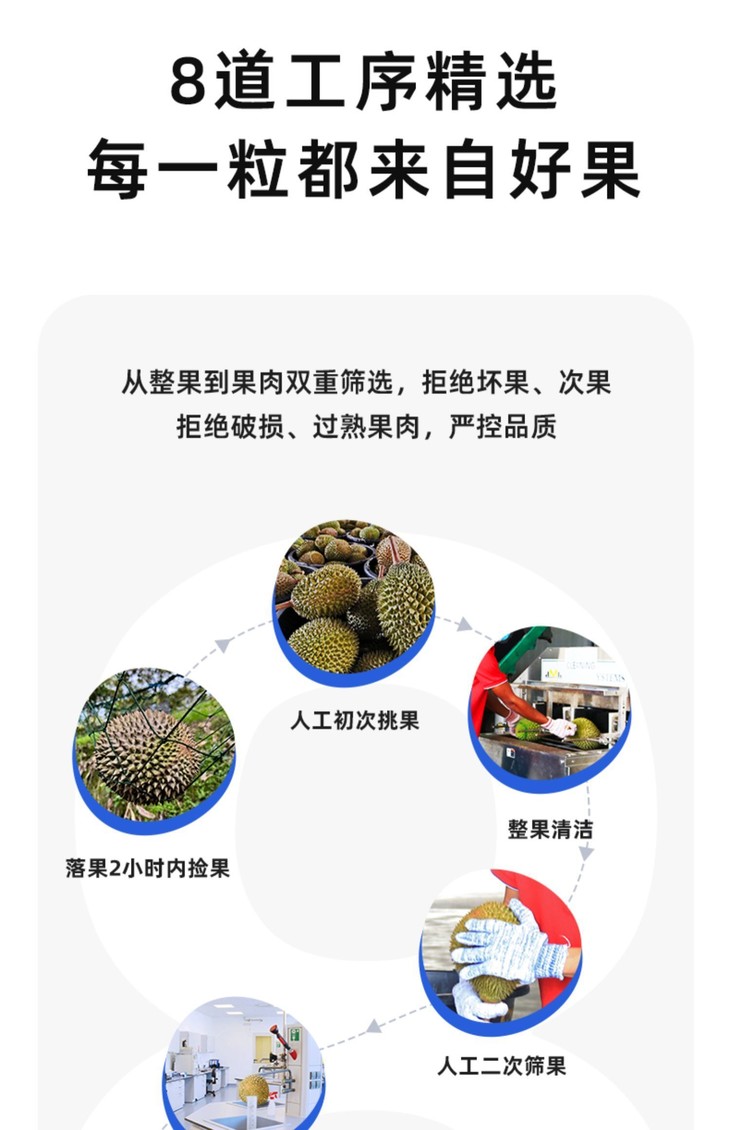 液氮是目前世界最先进的生物锁鲜技术 为了还原猫山王最新鲜的口感 每一颗猫山王自然成熟掉落后 在2小时内进行挑选,清洗 -18℃液氮实力保鲜,牢牢锁住每一口鲜甜 真正做到0添加! 8道工序精选!每一粒都来自好果!