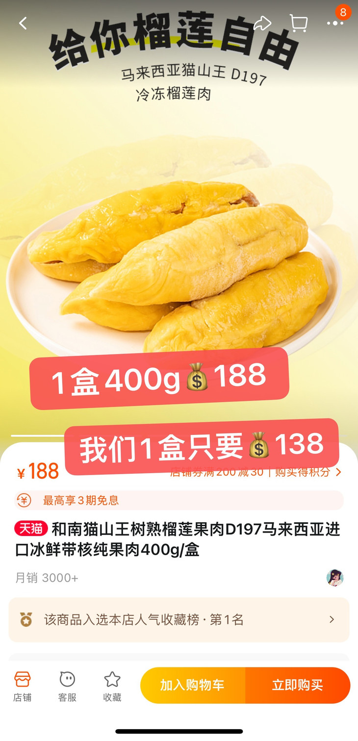 还没开吃,就被顶级榴莲的霸道香气征服! 口味醇厚香甜,好吃得让人做梦都惦记! 比带壳的榴莲好吃了不是一点点!贵也值了! 团购就是大写的划算!入手超值! 某宝买马来西亚的进口榴莲1盒就要💰188! 我们团购1盒只要💰138! 超值优惠姐妹们千万不要错过!