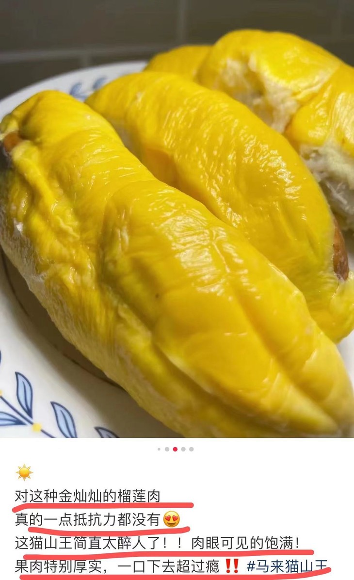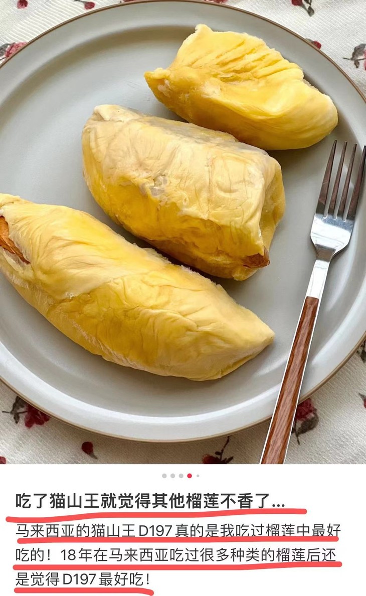 而且这款榴莲果肉不是泰国金枕、不是越南青尼 也不是马来西亚各种“杂牌”的榴莲品种 猫山王对气候的要求极为苛刻 全年温度达25℃以上,且地形地势、光照雨水的不同 都会造成猫山王品质的极大差异! 连著名美食家蔡澜都为之倾倒 马来西亚有200多种榴莲,农业部给一个一个编号 猫山王的编号是D197,足以见得它“上位”时间不是很长 但是人们特别爱他的口感! 满满好评!