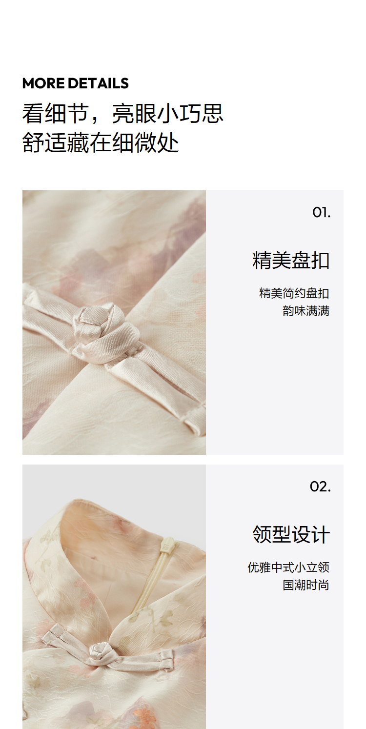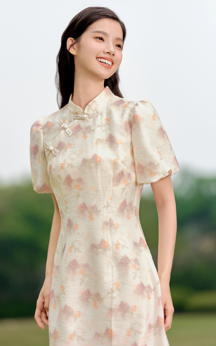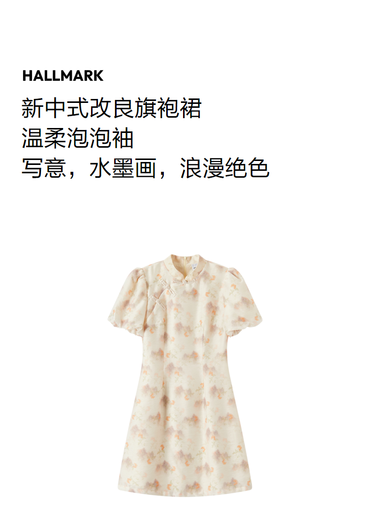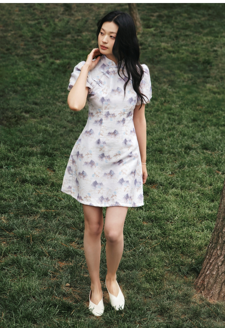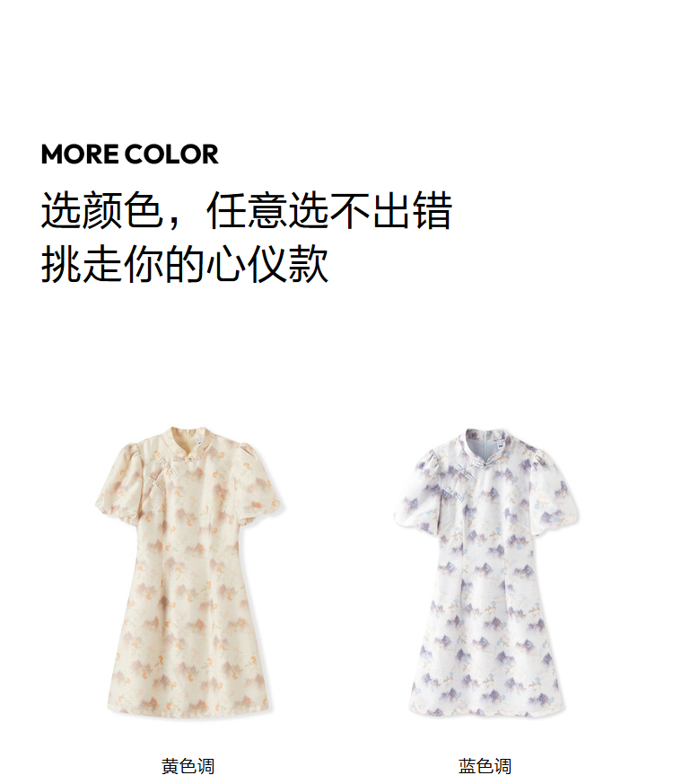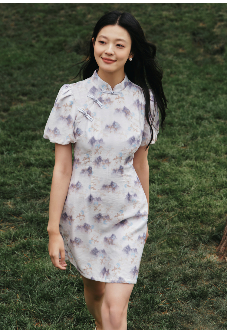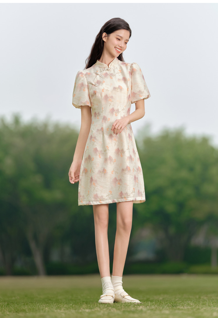 森马连衣裙女水墨画印花泡泡袖盘扣夏季新款新中式改良旗袍裙