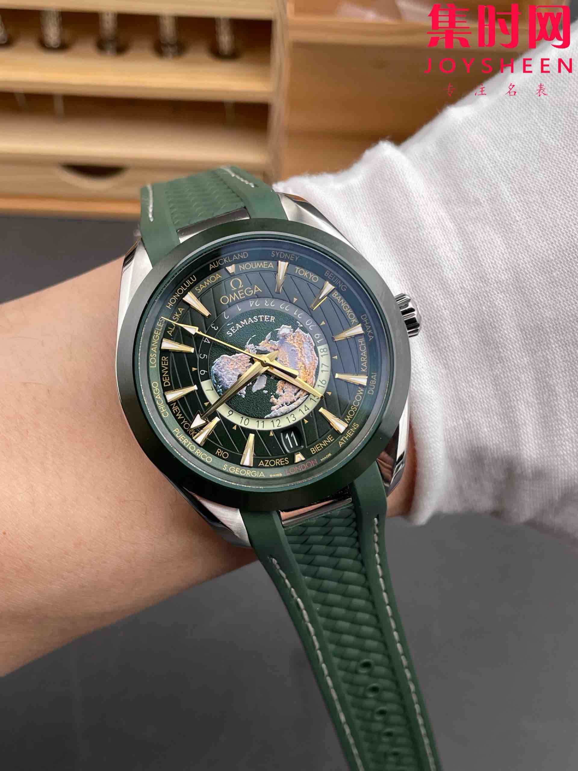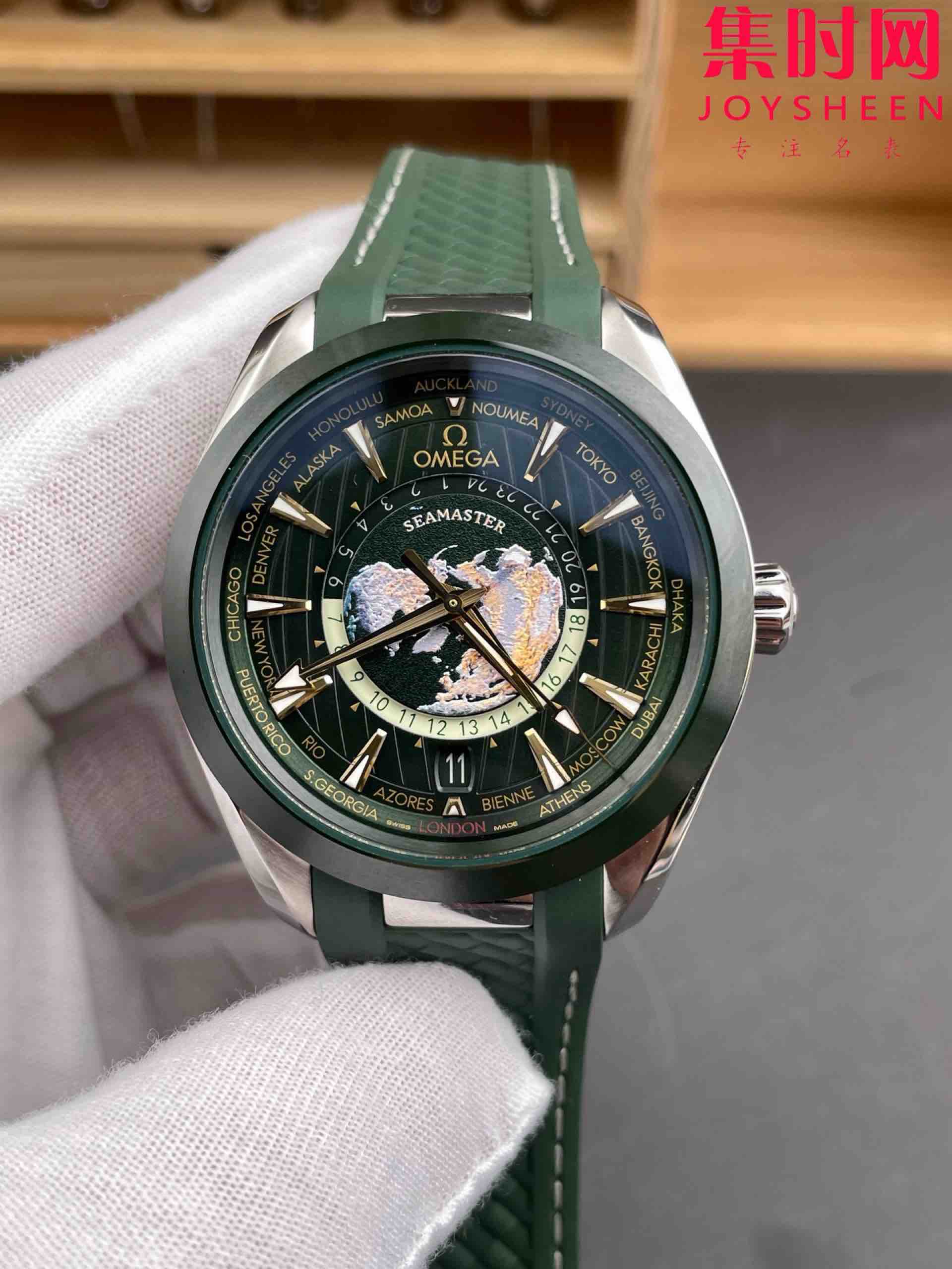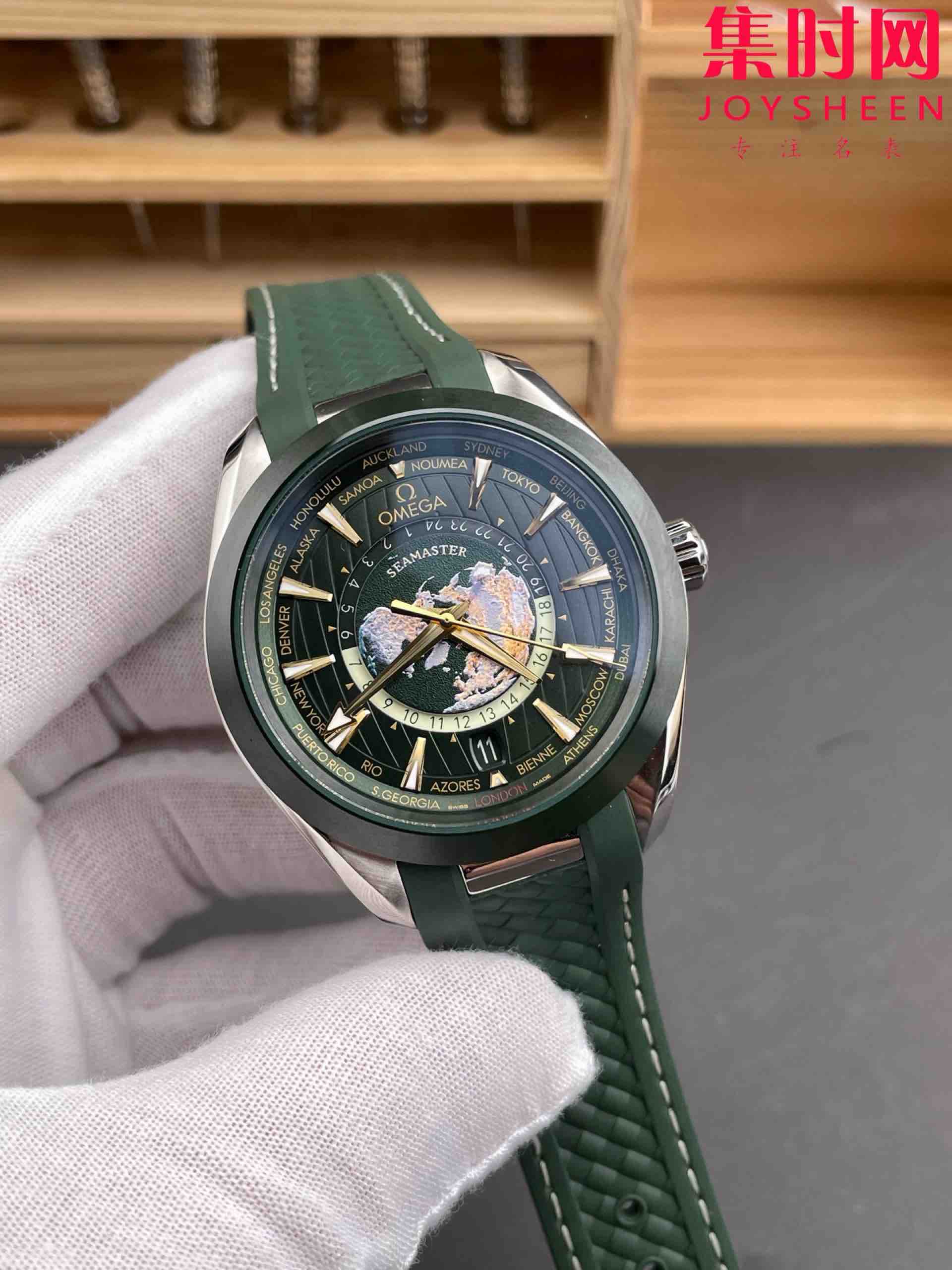 VS欧米茄新款海马世界时系列 VS海马世界时墨绿 绿海马 海马世界时绿色款 男士腕表 表径43mm Aqua Terra 世界时腕表。一款可以戴着环游世界的世界时腕表,激光烧蚀蓝色海洋,陆地浮雕勾勒,24小时hesalite水晶环。辽阔世界尽在掌握,于方寸之间伴您开启环球之旅!搭载VS定制Cal.8938多功能全自动机械机芯,蓝宝石水晶镜面,316L精钢表壳,陶瓷圈口,定制橡胶表带,原装折叠扣,功能同步原装真实可用!表径43mm