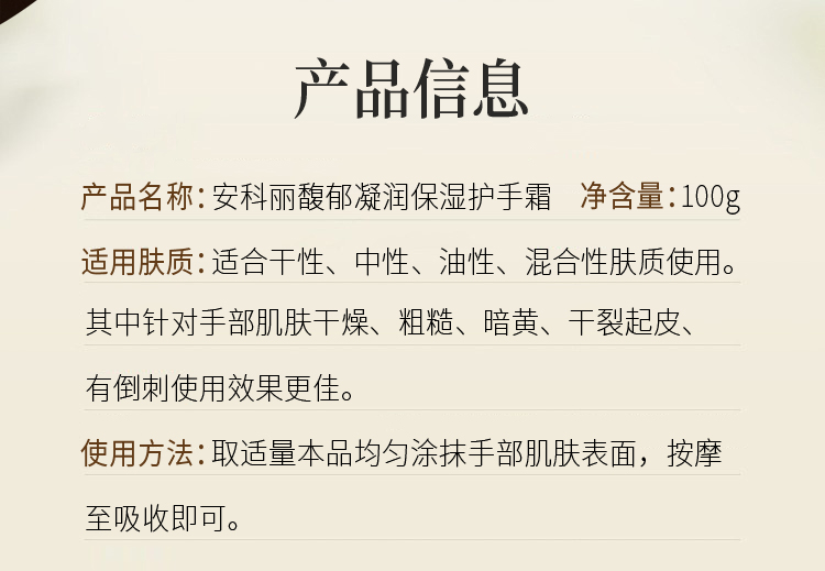 【品牌直发】安科丽 凝润保湿护手霜 肌肤水润透亮100g