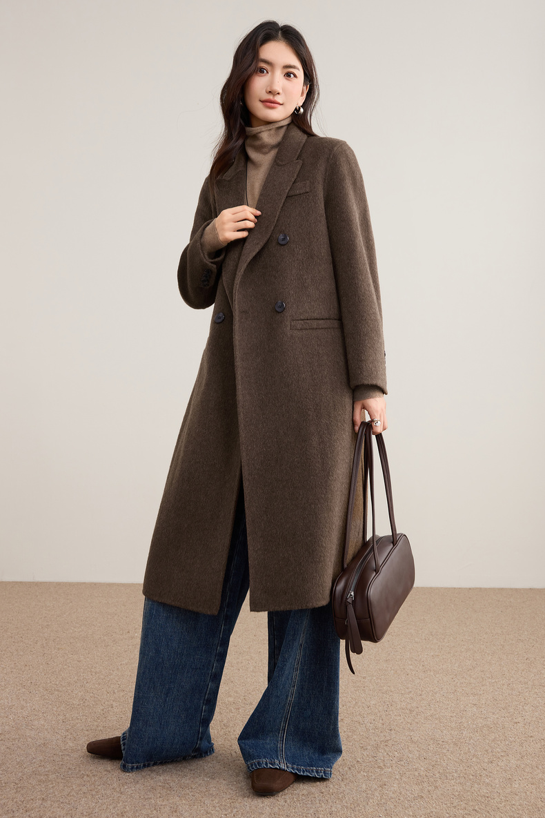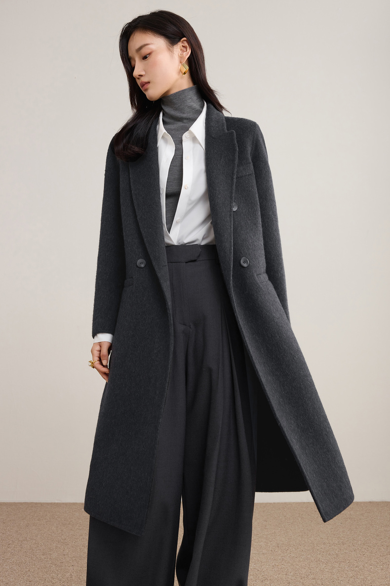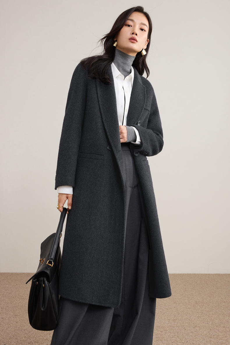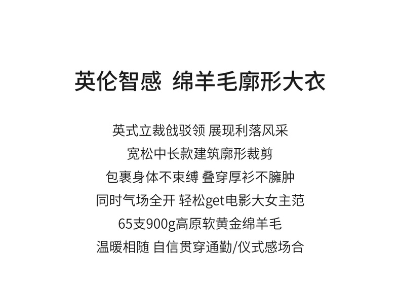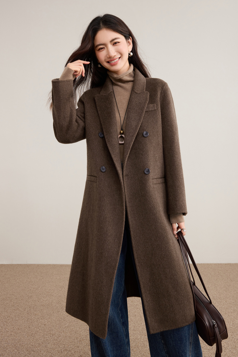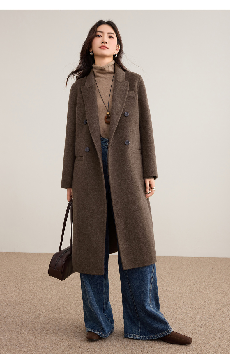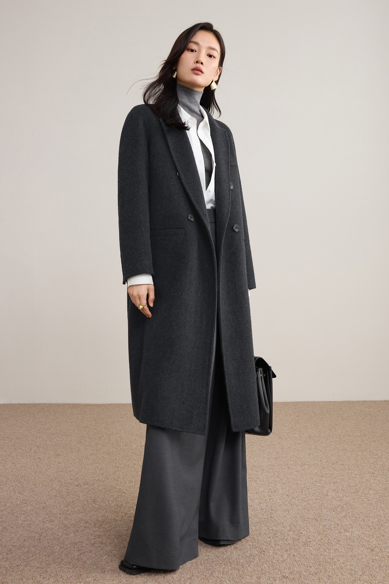 【内购】【绵羊毛】英伦风戗驳领双排扣宽松显瘦厚保暖中长款双面呢大衣-W54OA8769