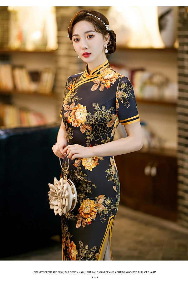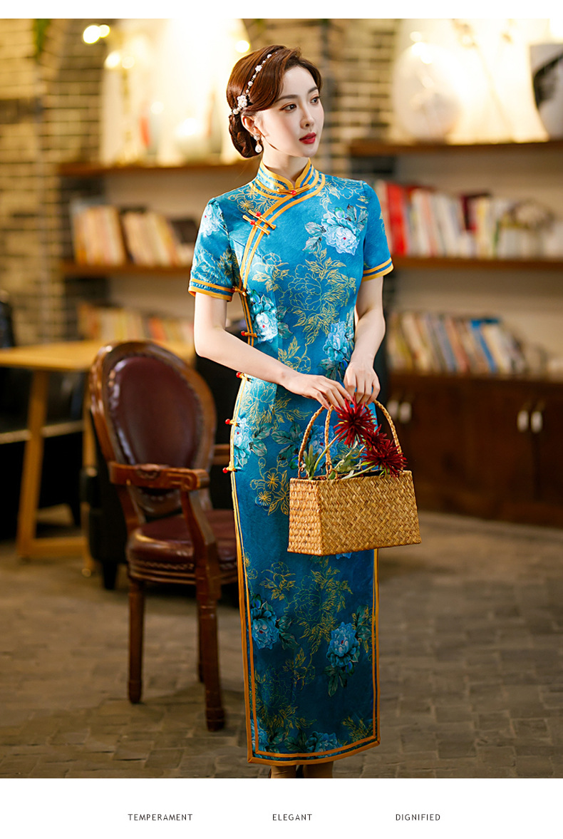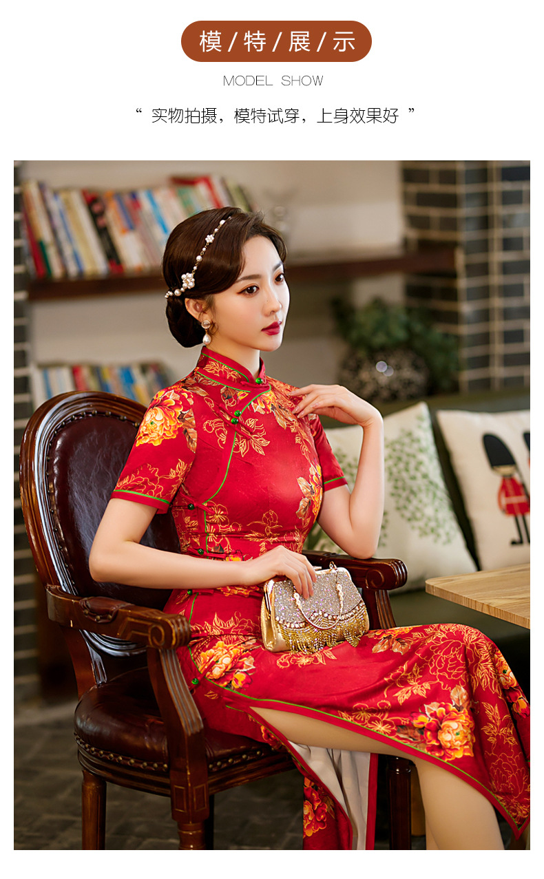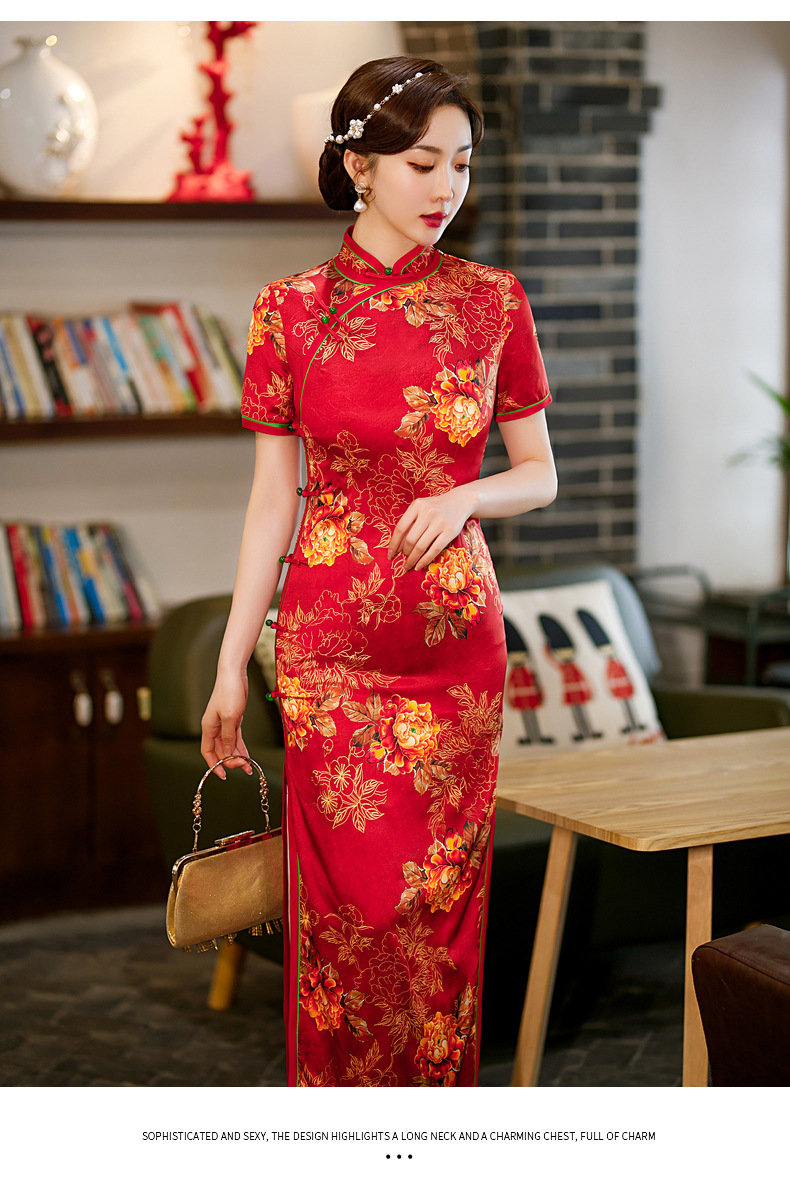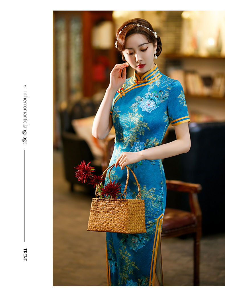 高开衩双层旗袍裙24春夏季新款修身印花国风旗袍CX-0650