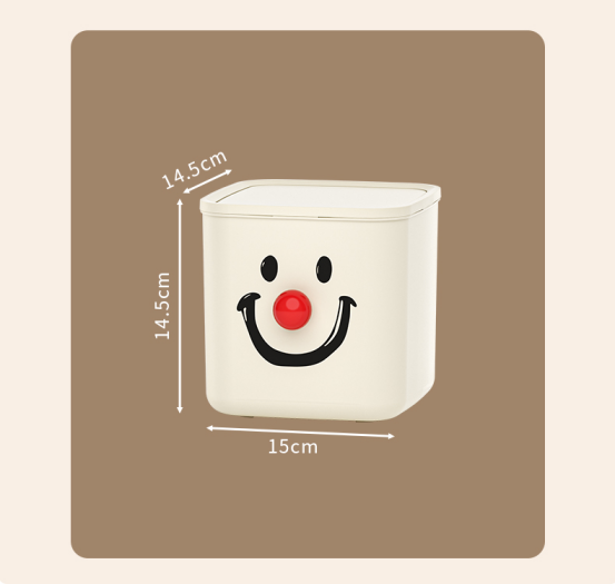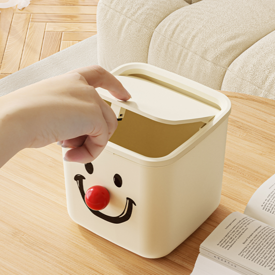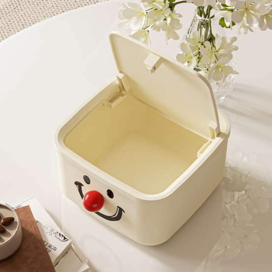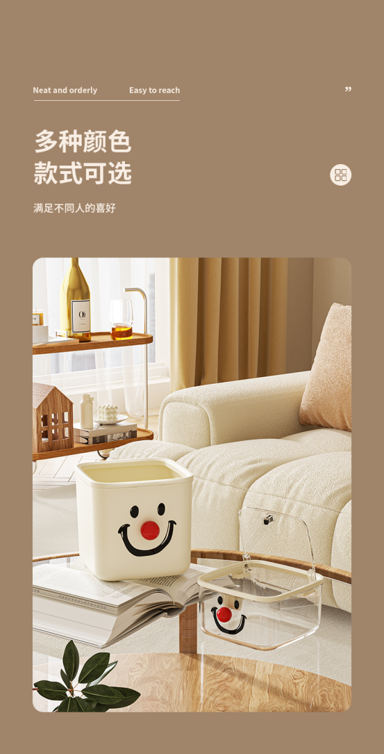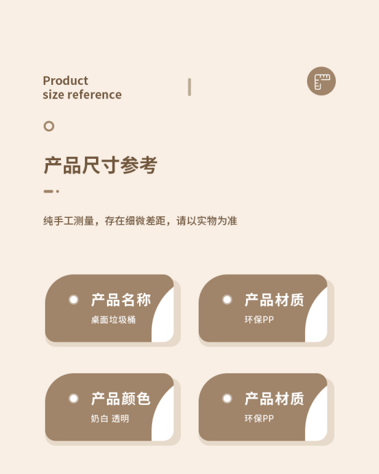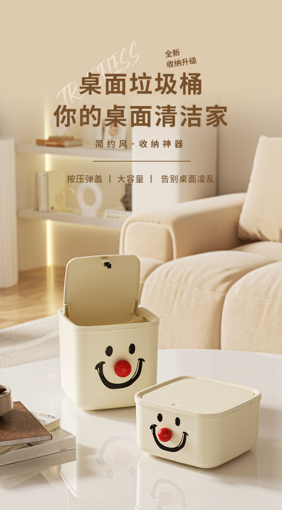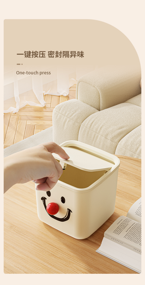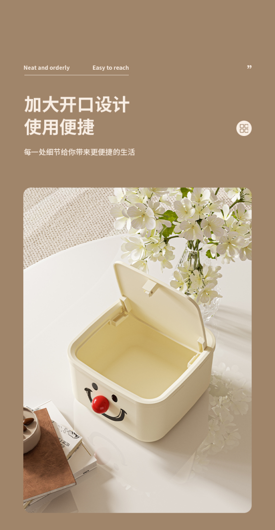 弹盖设计不脏手,防止异味散发 环保材质,结实耐用,使用更放心 小巧不占空间,还可做收纳箱 可放在化妆台、客厅、厨房、办公室、私家车等 这款桌面垃圾桶,多个场景都适用!