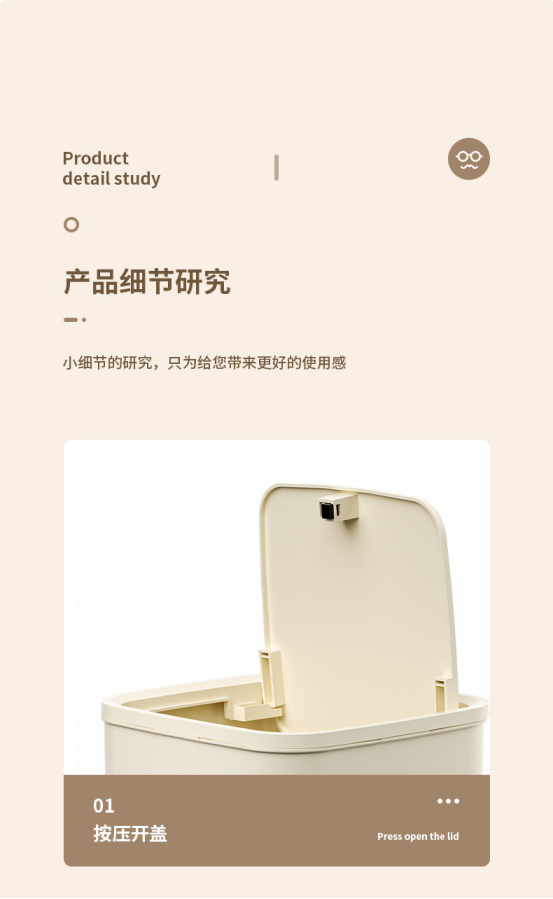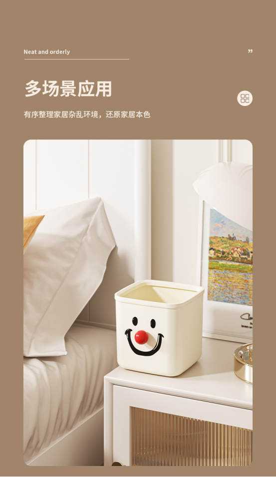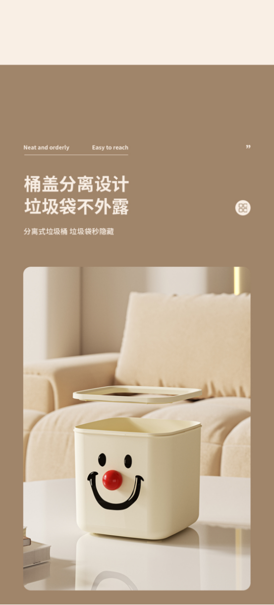 这款垃圾桶开合特别轻柔 不用小心翼翼 就能实现无声扔垃圾💯帮你维护住了家里的安静氛围! 走哪儿放哪儿!适用很方便! 放在客厅、卧室、厨房、卫生间等都可~ 小小的特别不占地方,轻松隐身