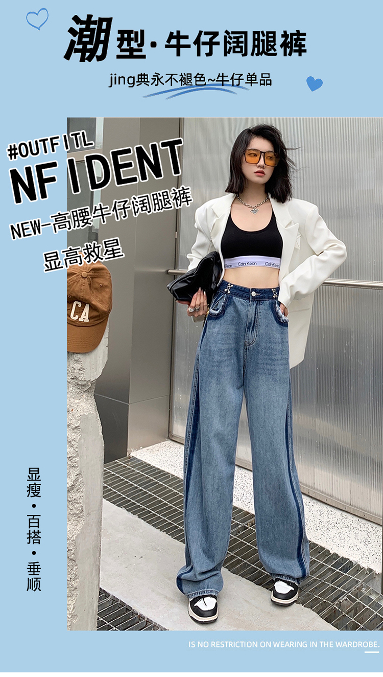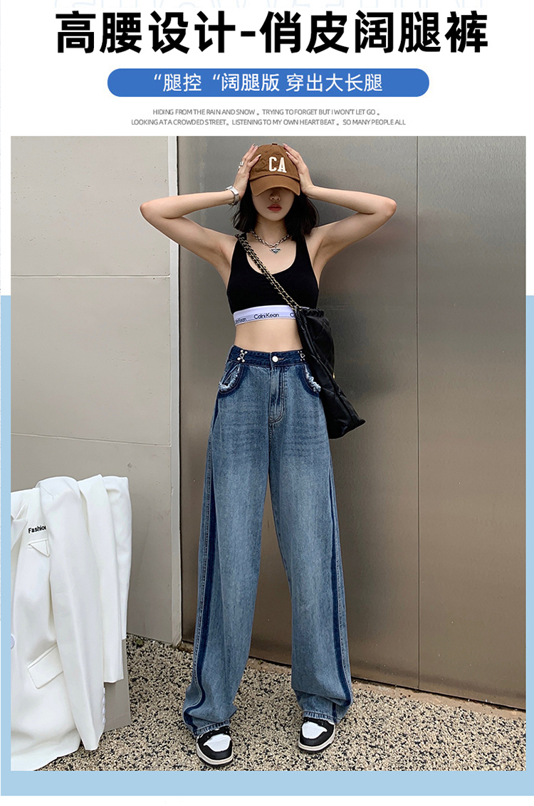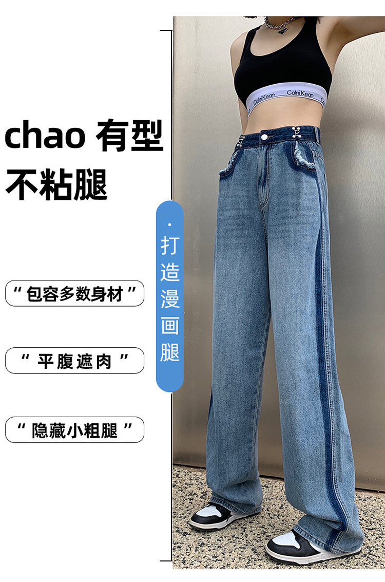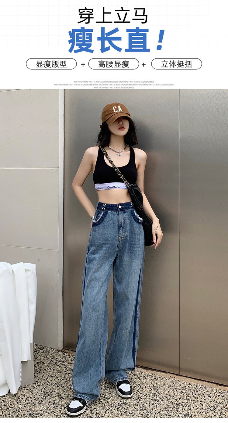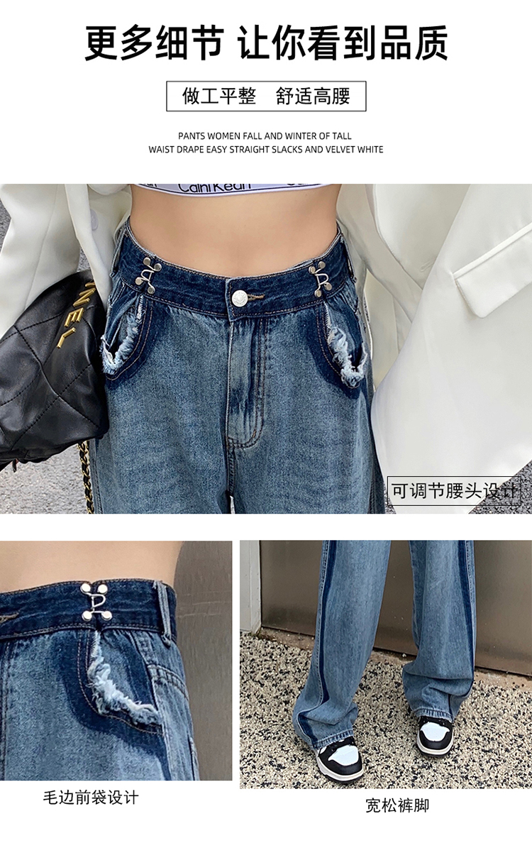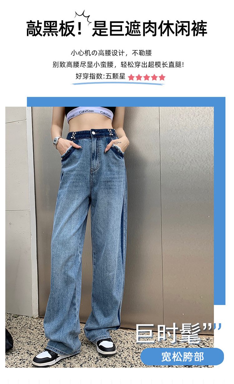 HEY+JEANS美式复古撞色牛仔裤直筒牛仔裤女2022秋季新款弹力高腰显瘦宽松双扣拖地裤
