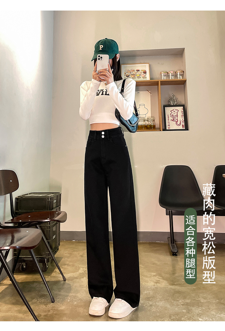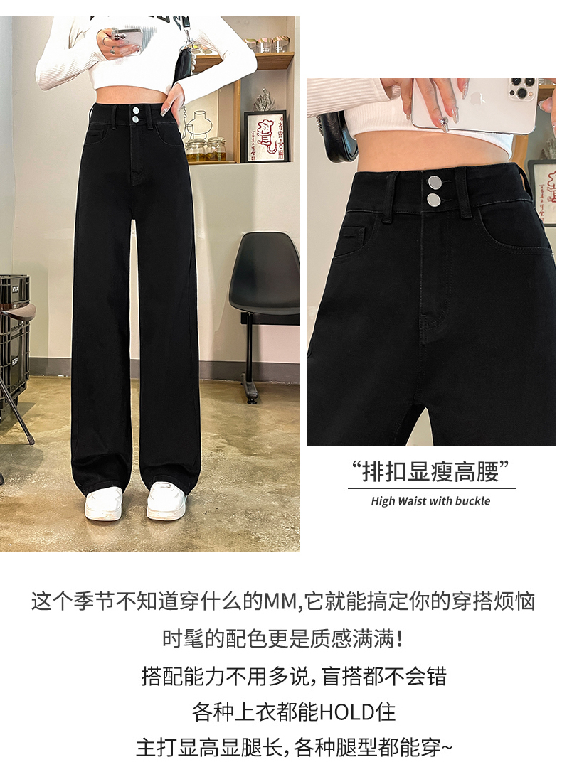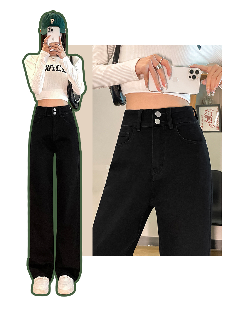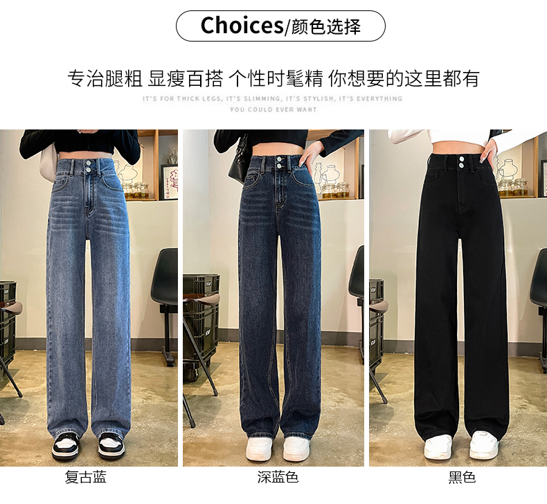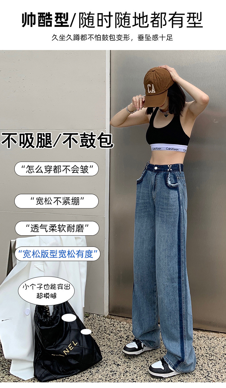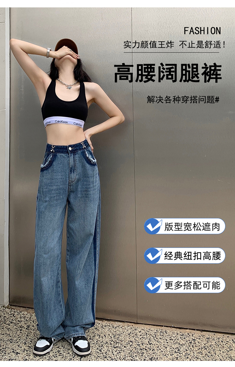 HEY+JEANS美式复古撞色牛仔裤直筒牛仔裤女2022秋季新款弹力高腰显瘦宽松双扣拖地裤