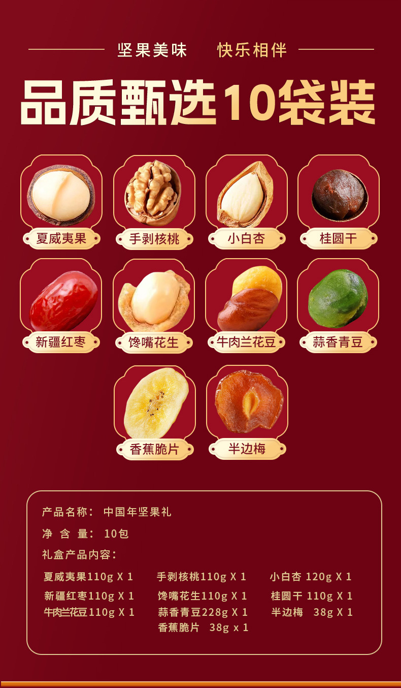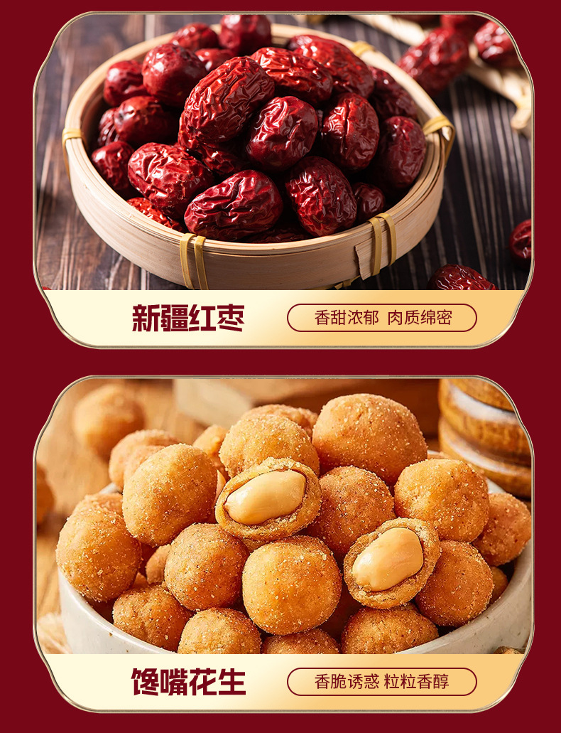 【健康赠礼❗️中国年坚果礼】全球甄选原料,夏威夷果/手剥核桃/小白杏/桂圆干/新疆红枣/馋嘴花生/牛肉兰花豆/蒜香青豆/香蕉脆片/半边梅,红色喜庆节日炒货整箱年货送礼佳品L