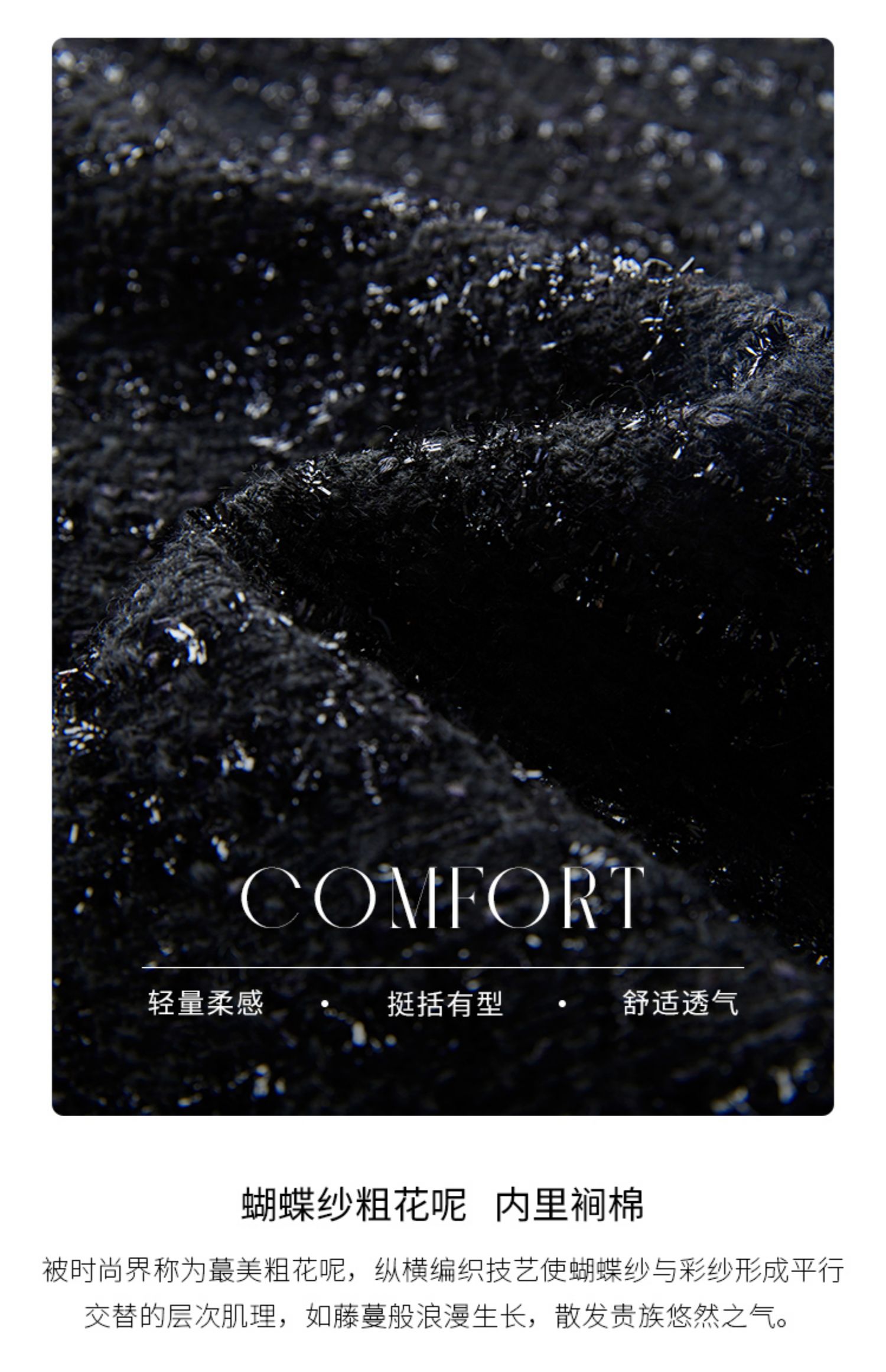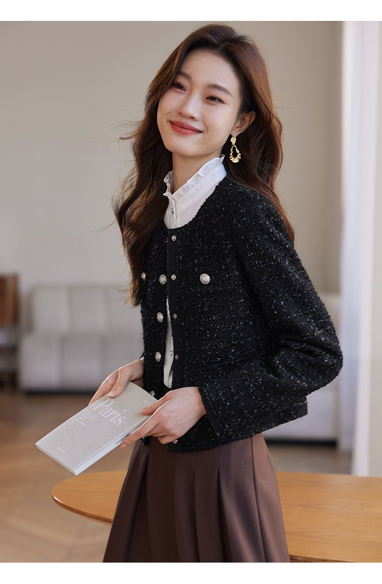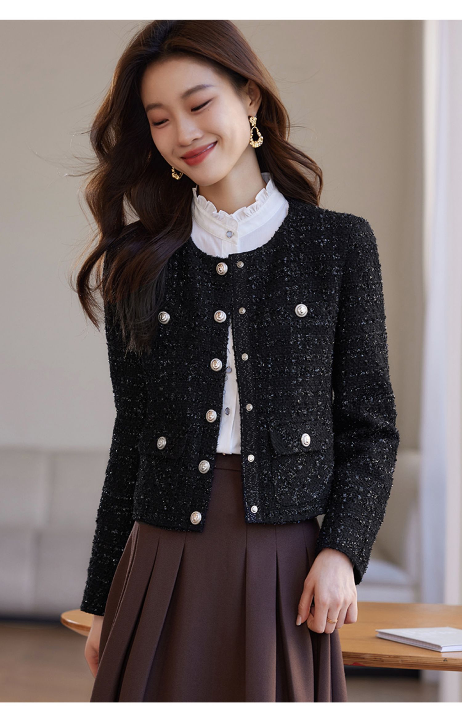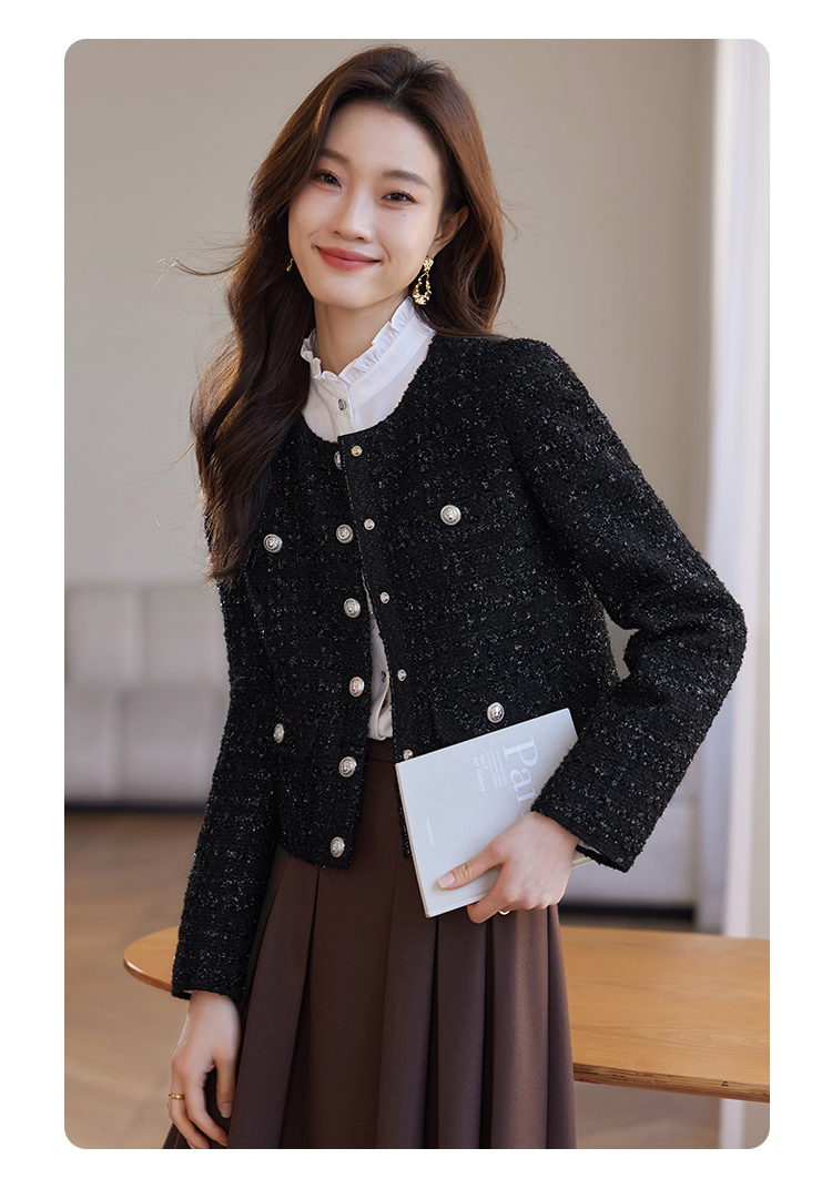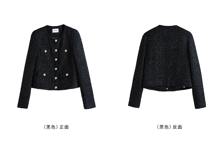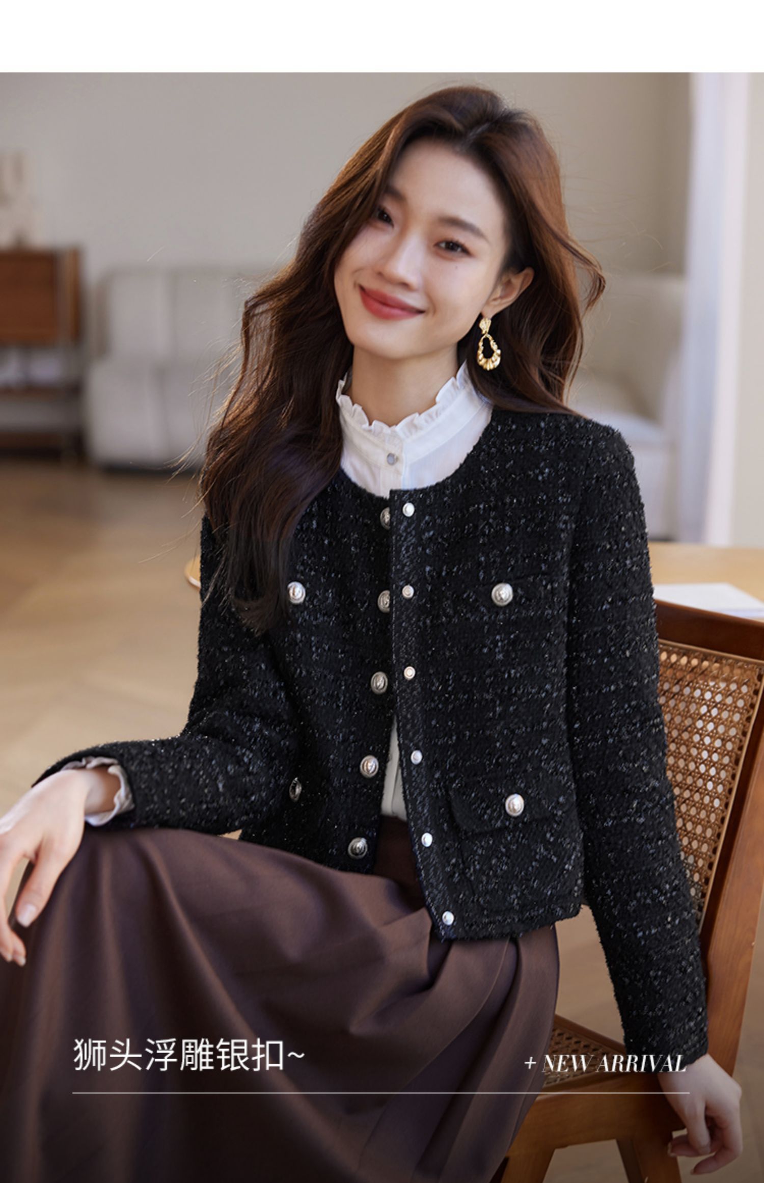 【年货节】熙世界小香风黑色外套女短款加厚夹棉名媛粗花呢上衣2025秋冬款