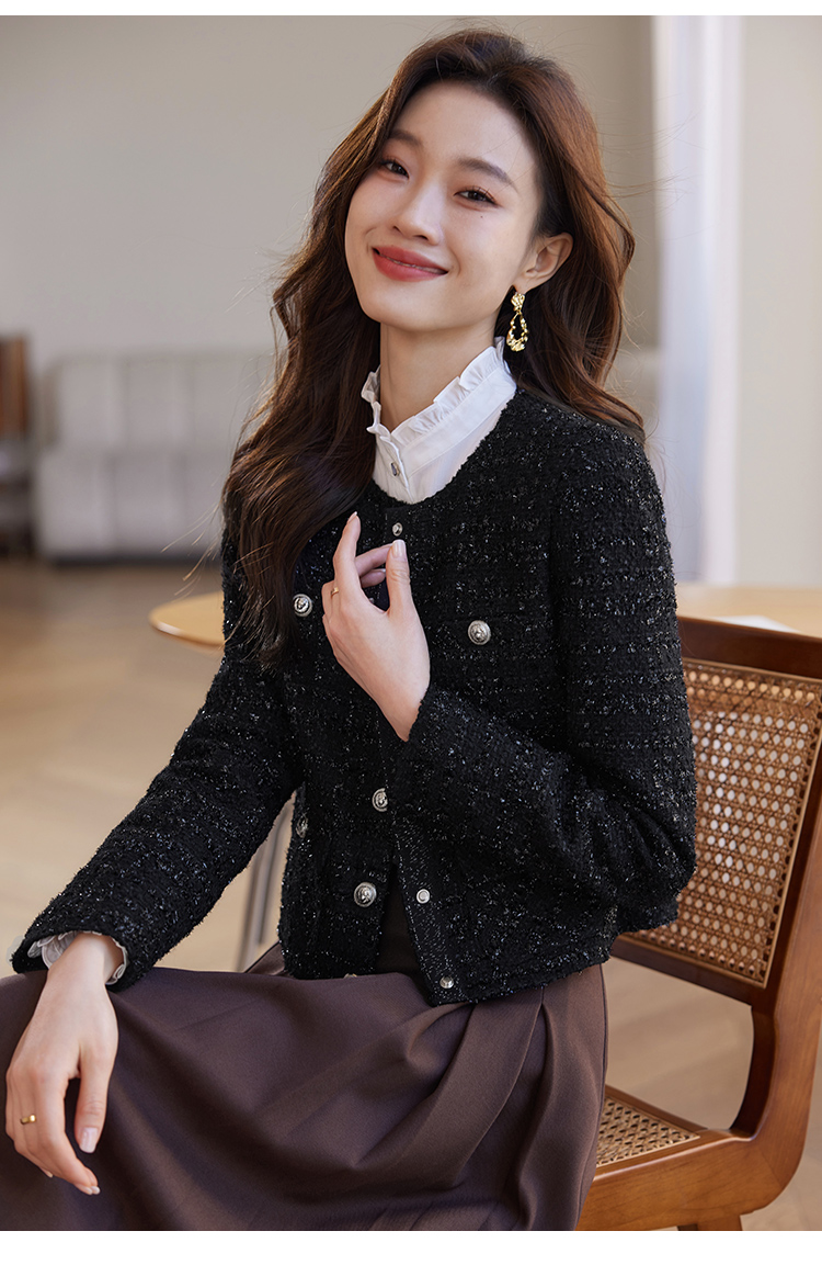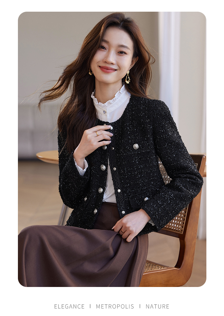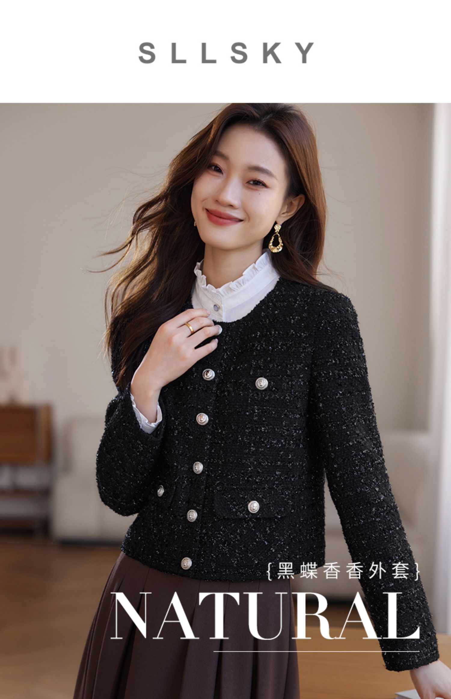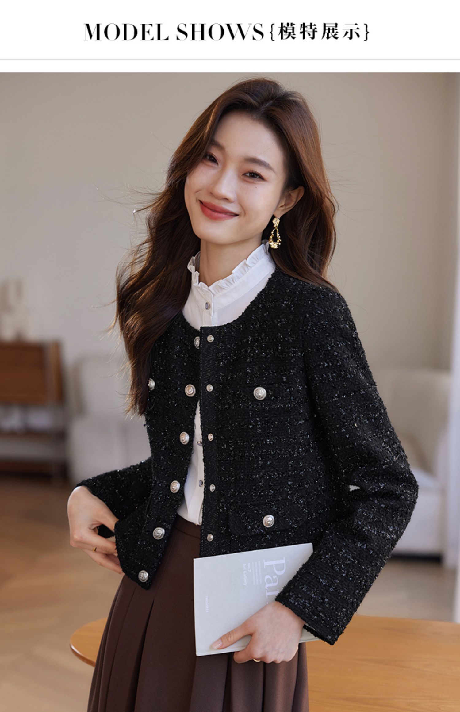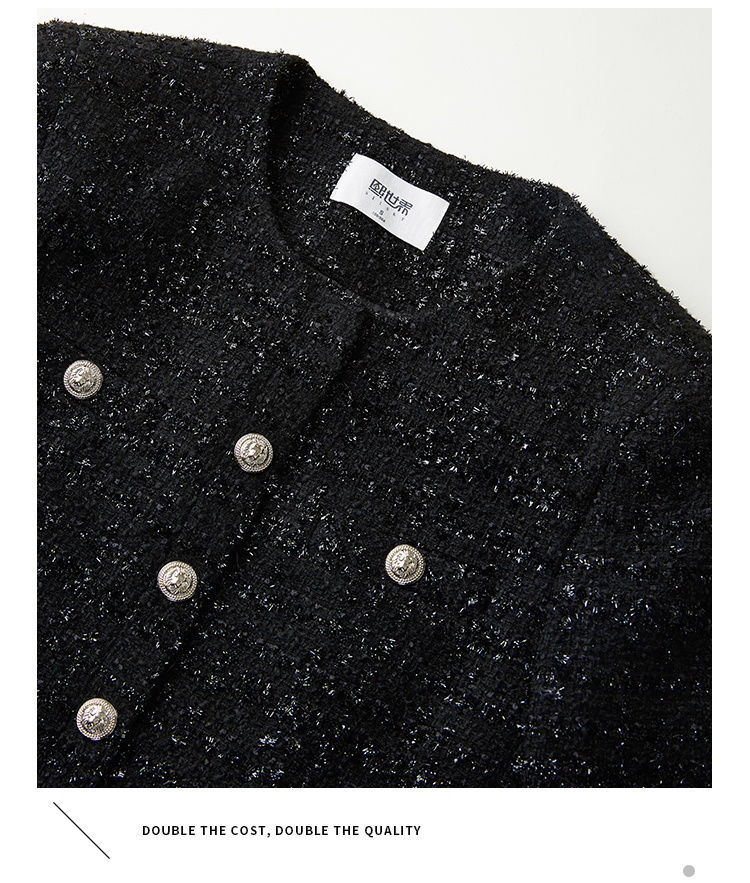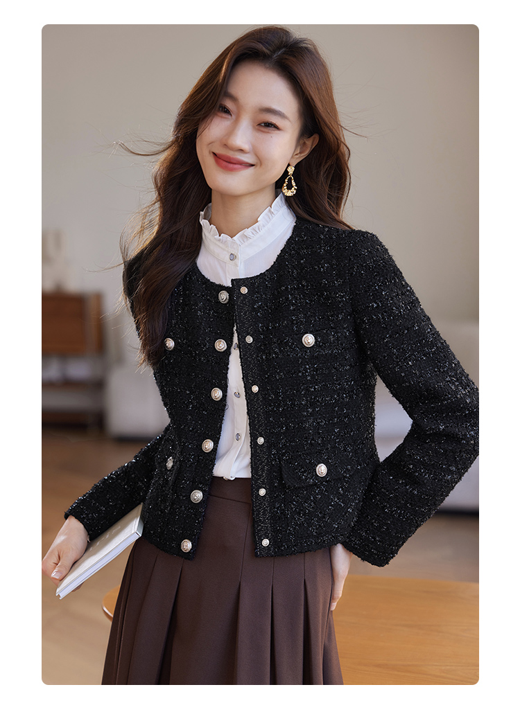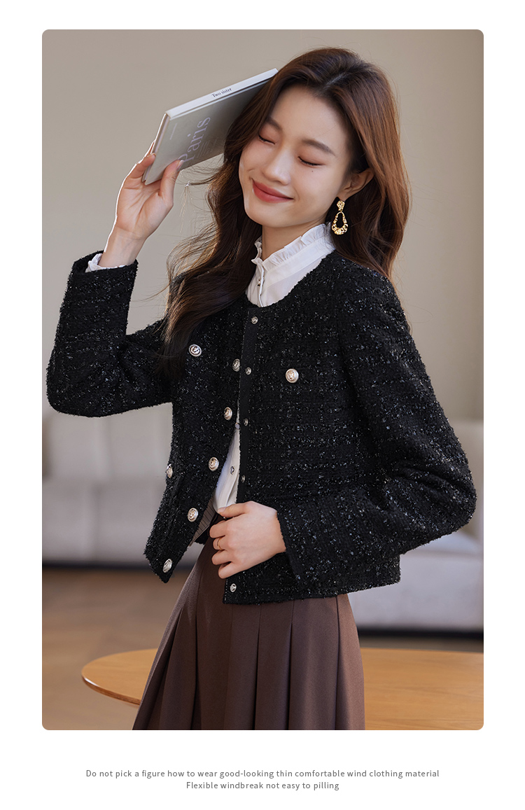 【年货节】熙世界小香风黑色外套女短款加厚夹棉名媛粗花呢上衣2025秋冬款