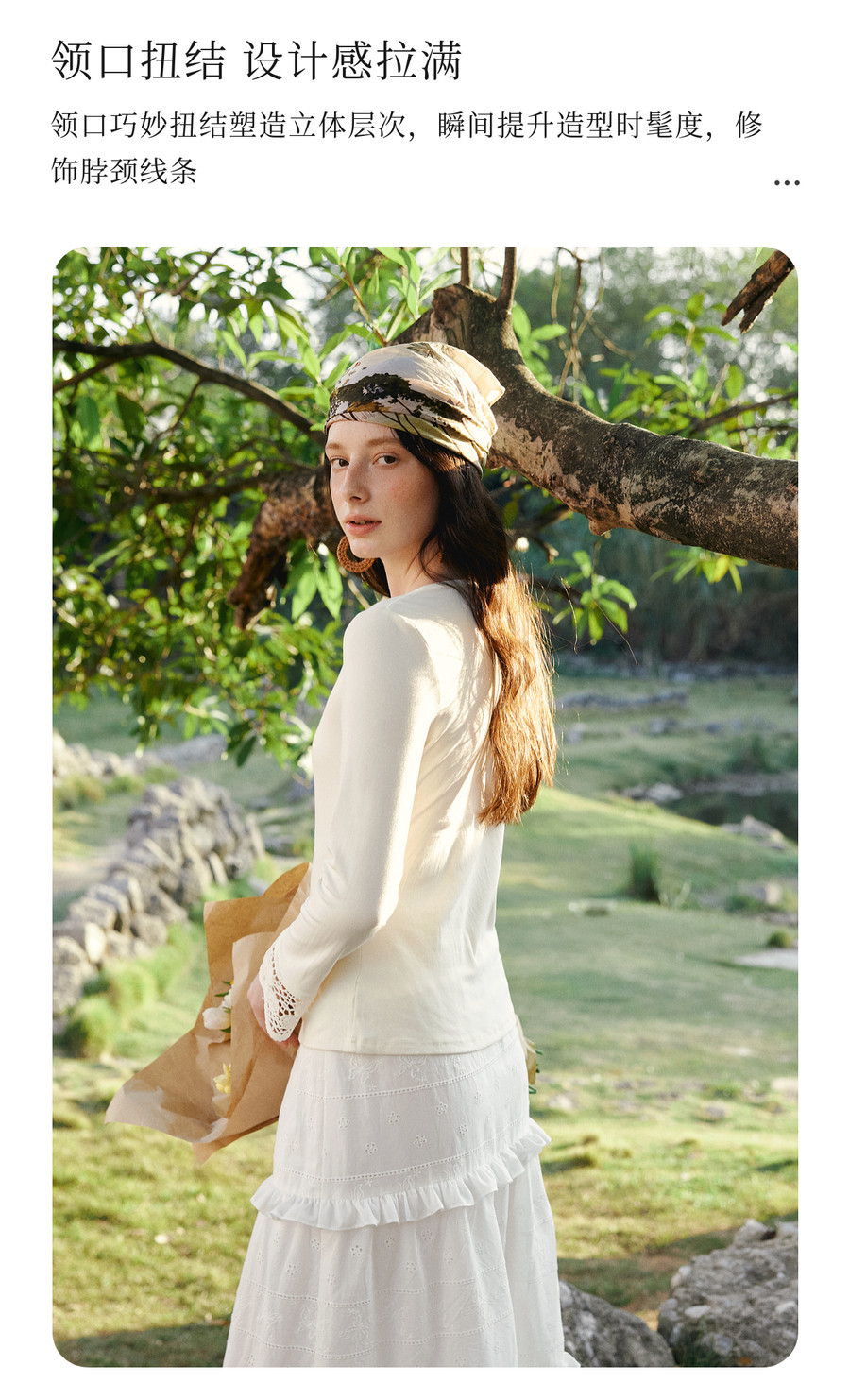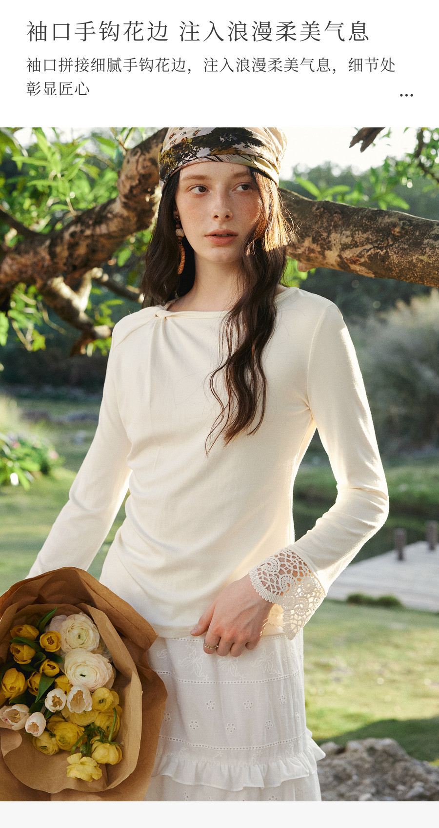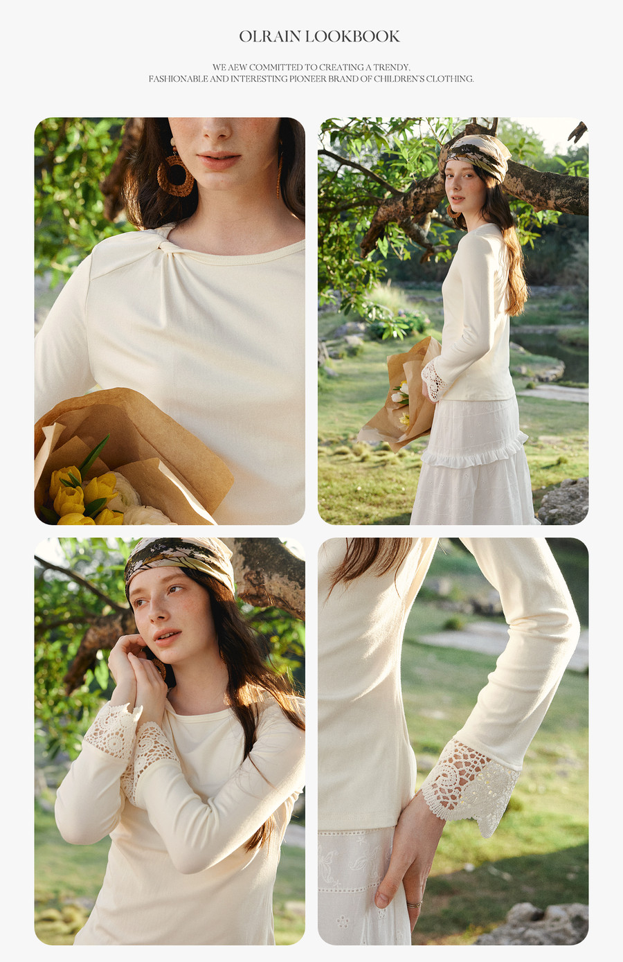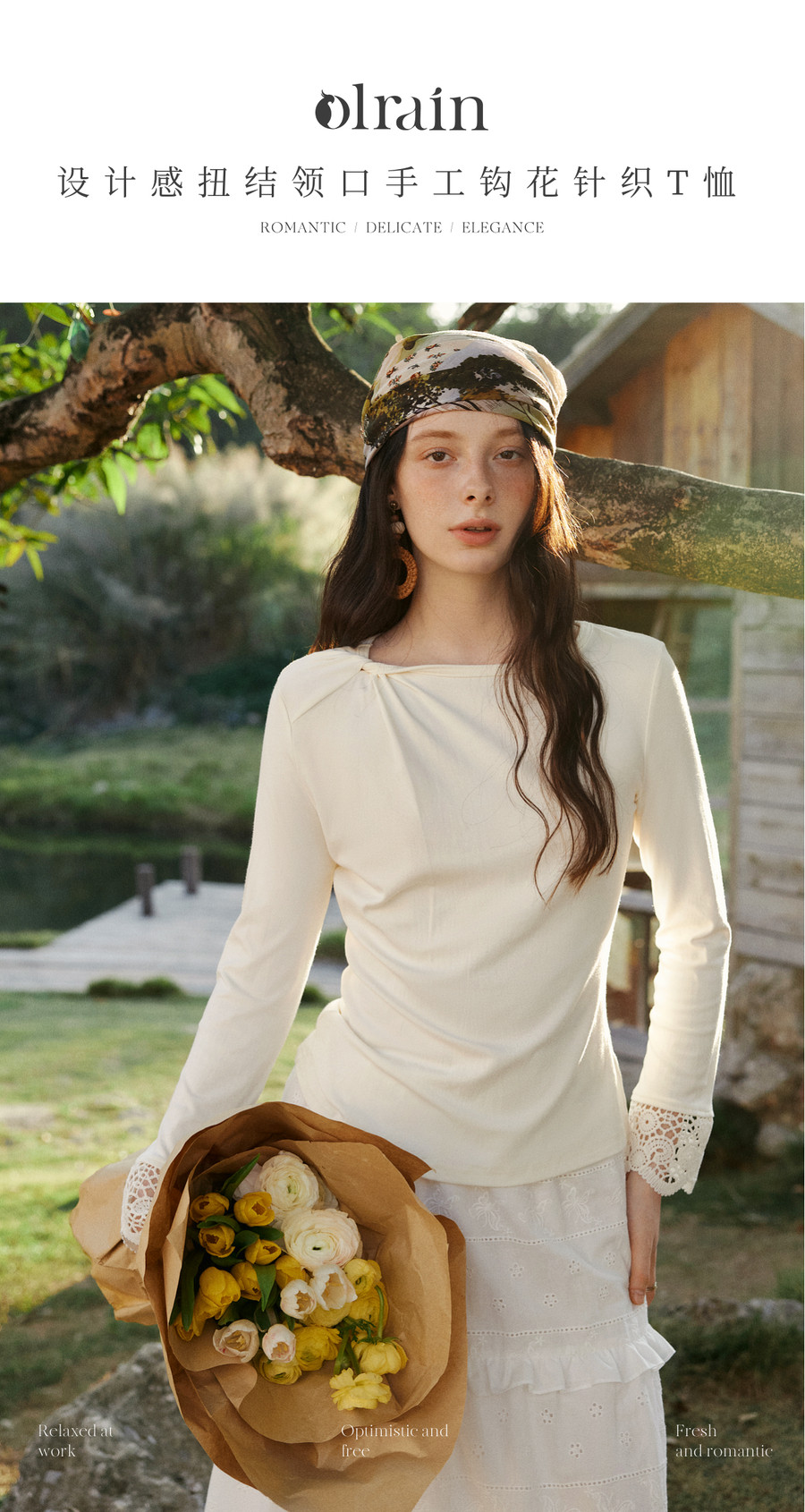 欧芮儿2026春新款设计感扭结领T恤女法式钩花袖口修身上衣长袖