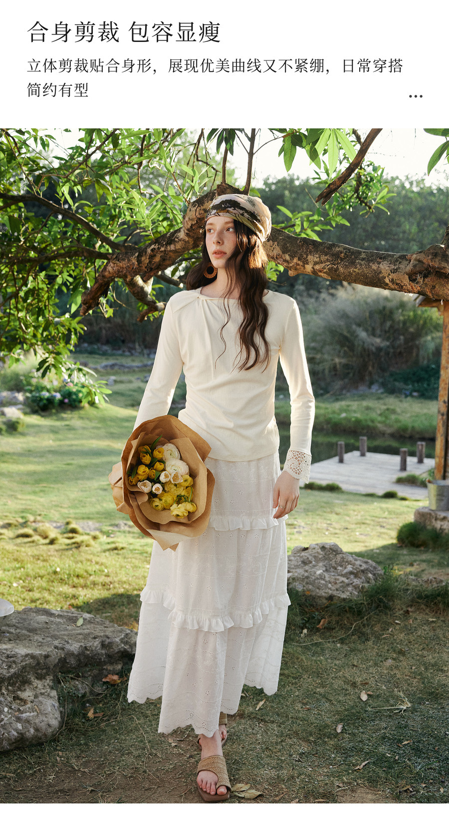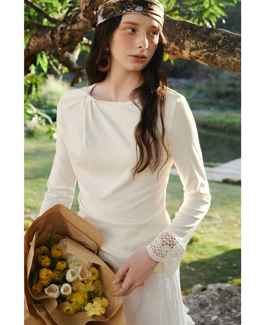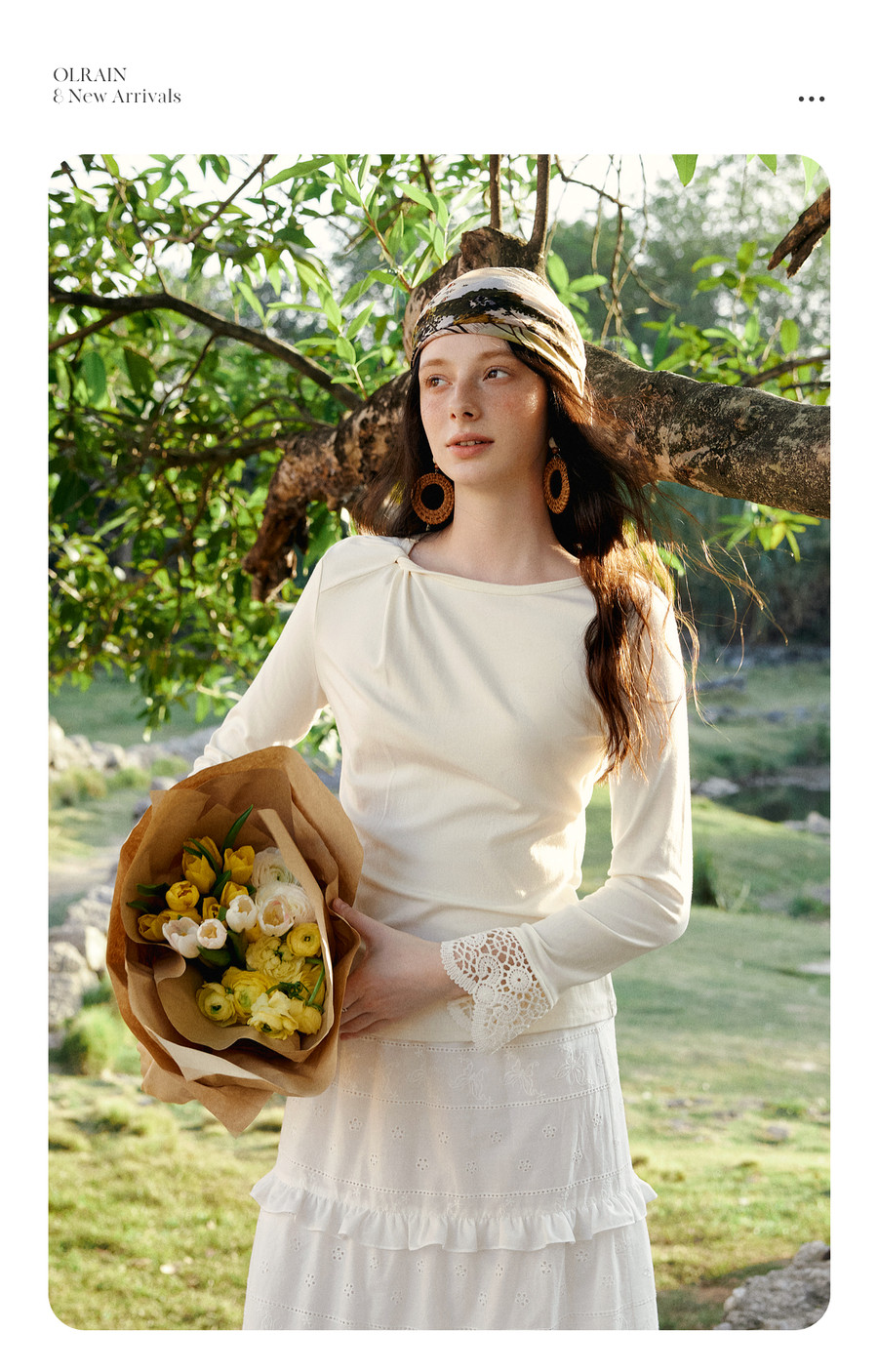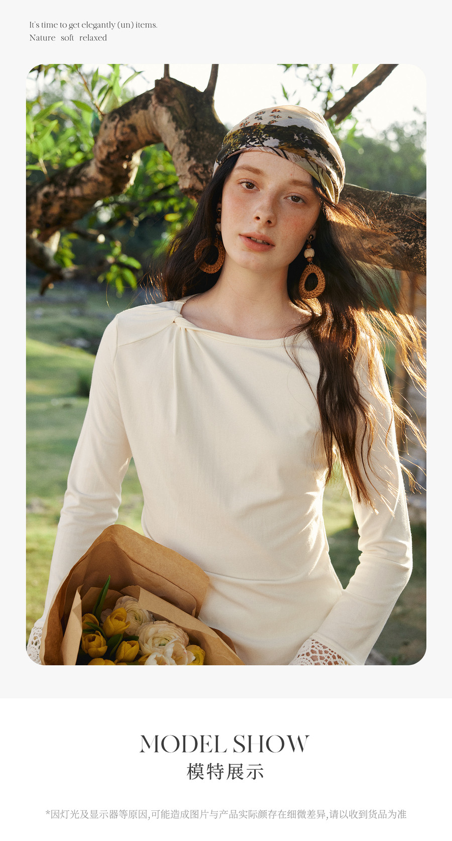 欧芮儿2026春新款设计感扭结领T恤女法式钩花袖口修身上衣长袖