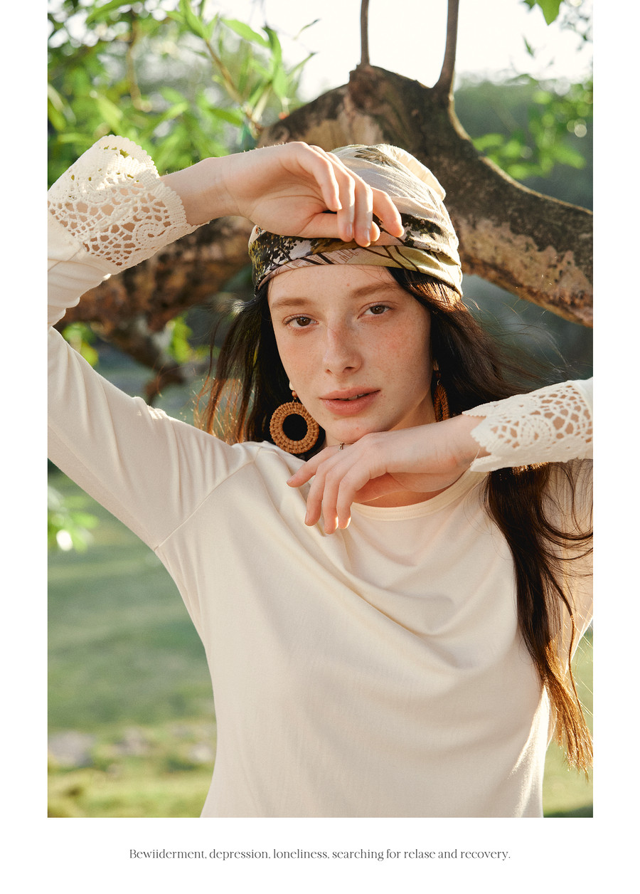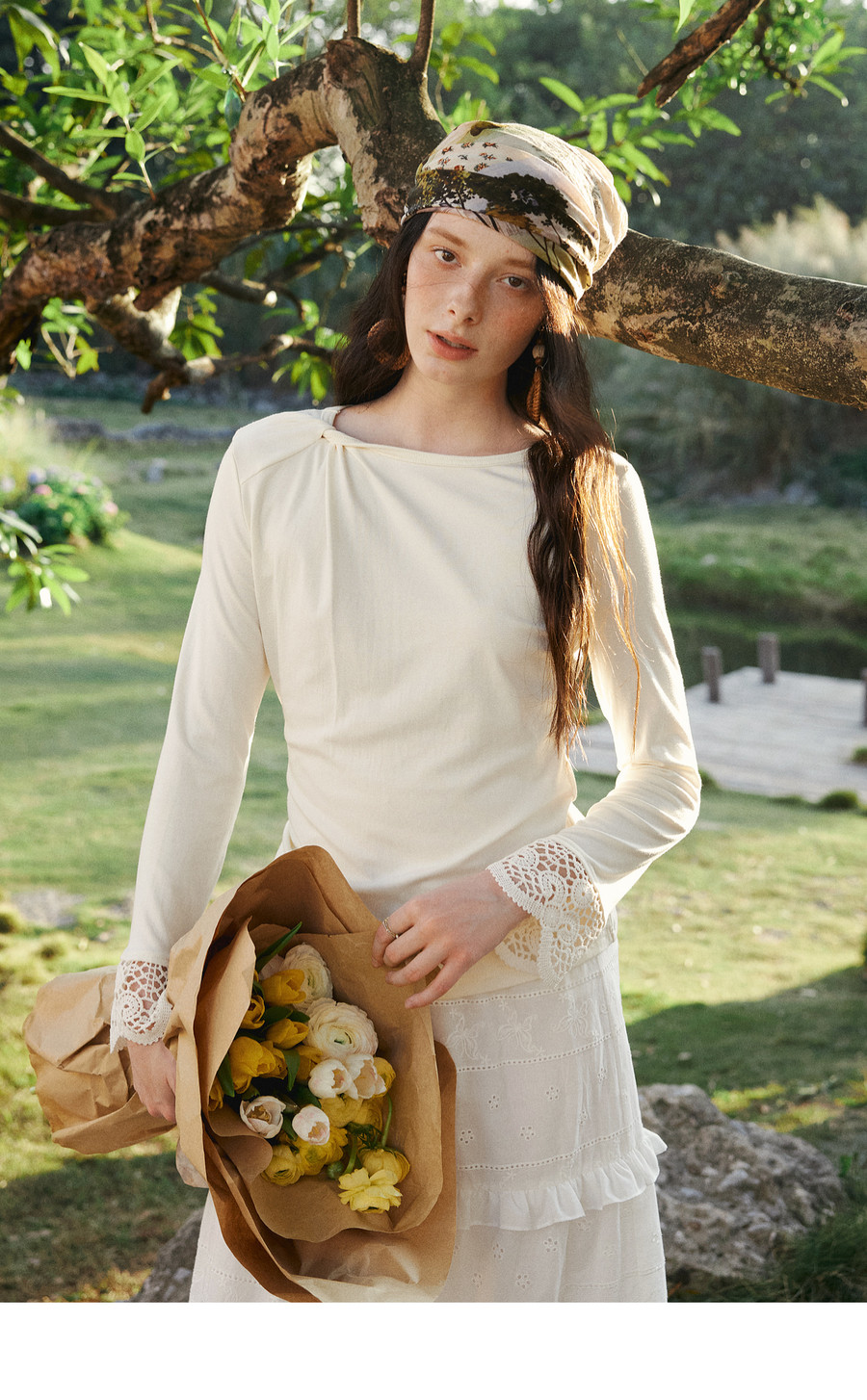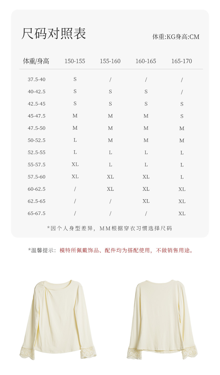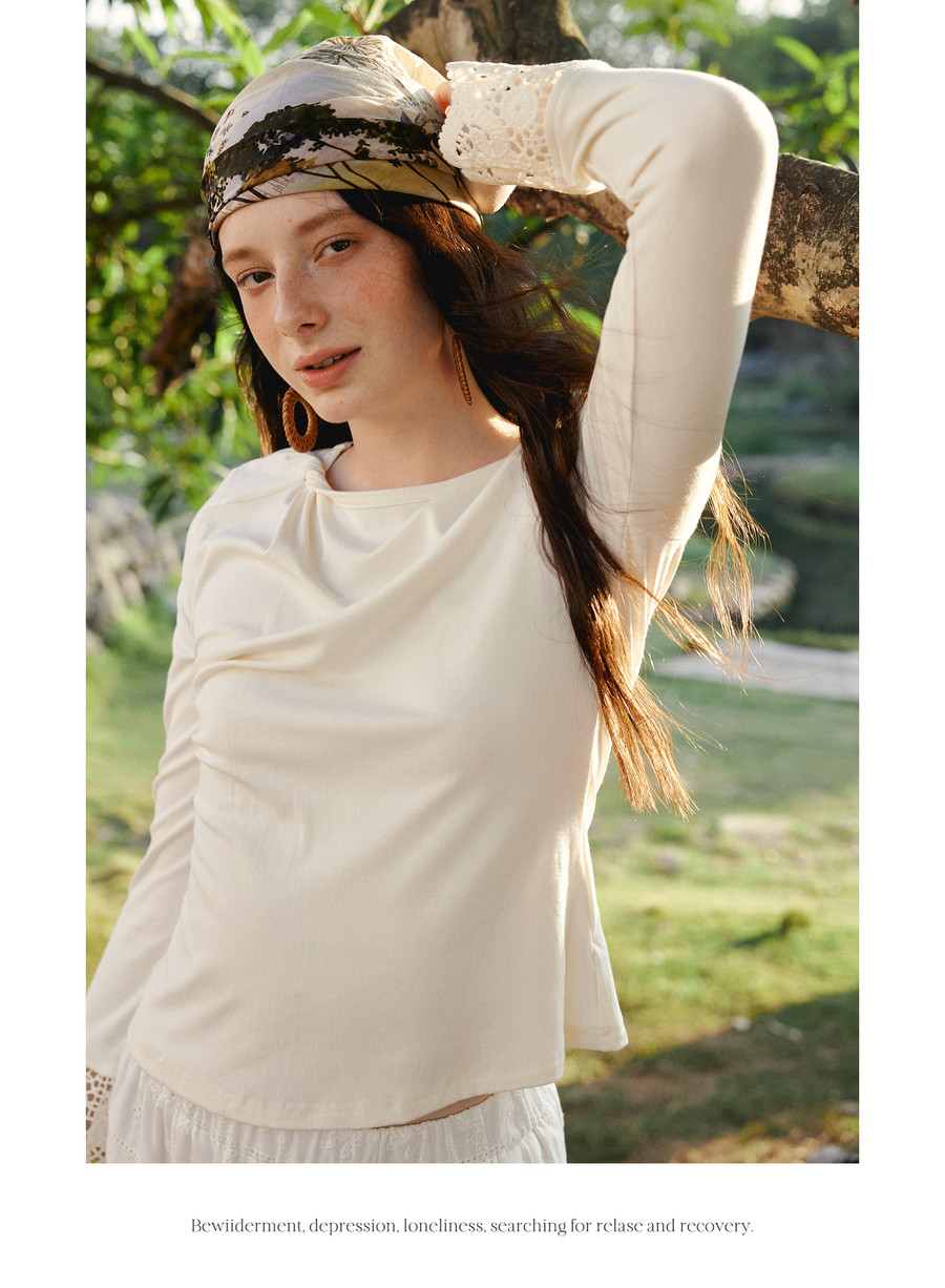 欧芮儿2026春新款设计感扭结领T恤女法式钩花袖口修身上衣长袖