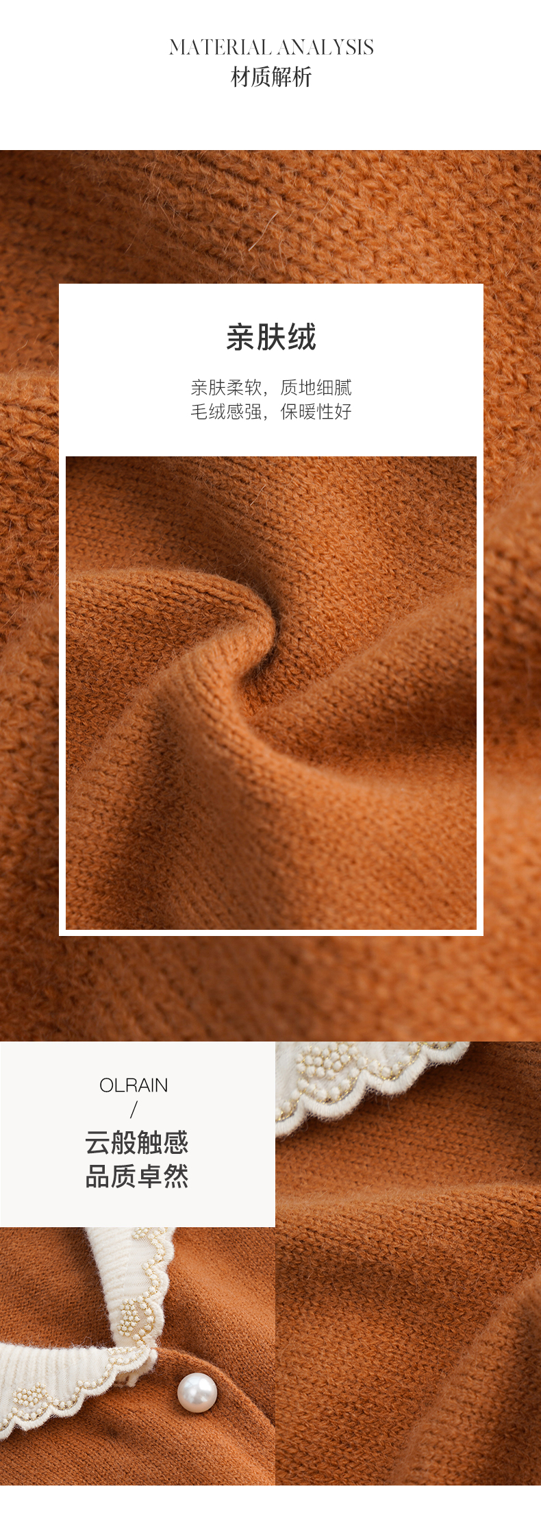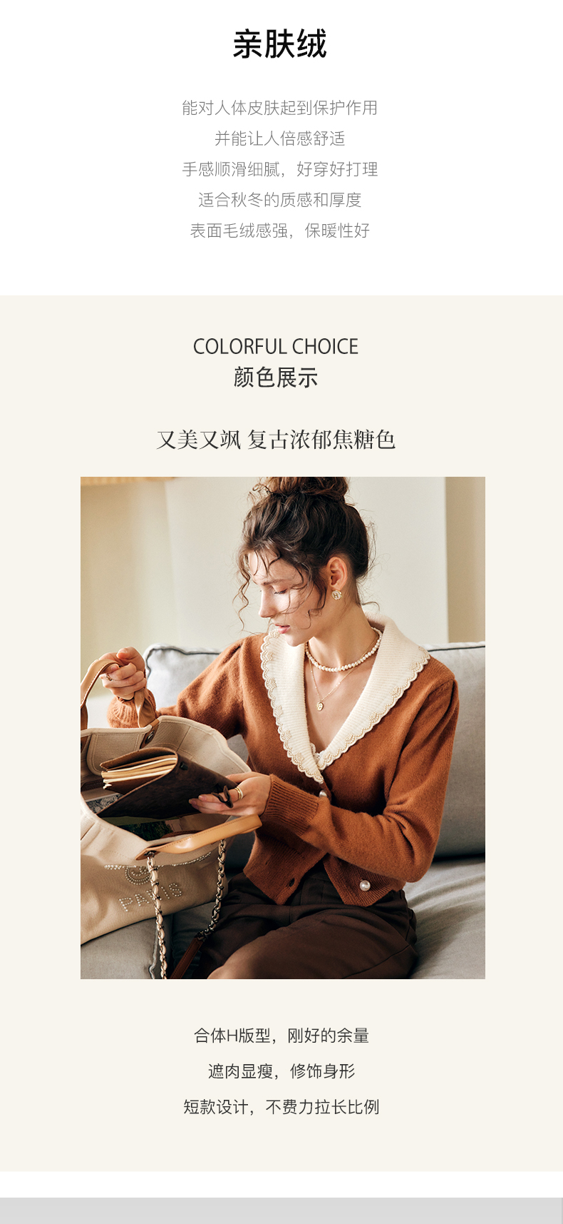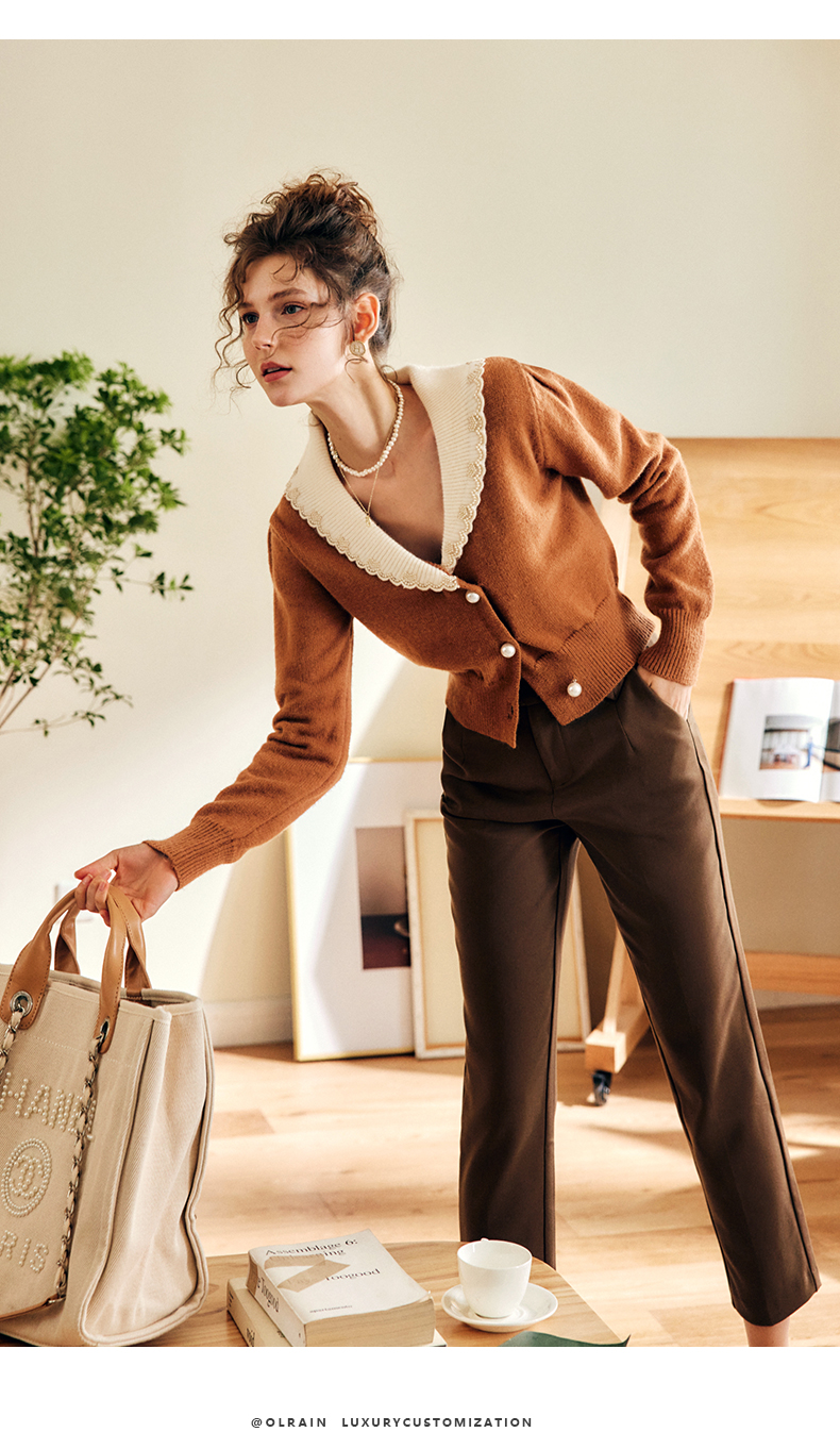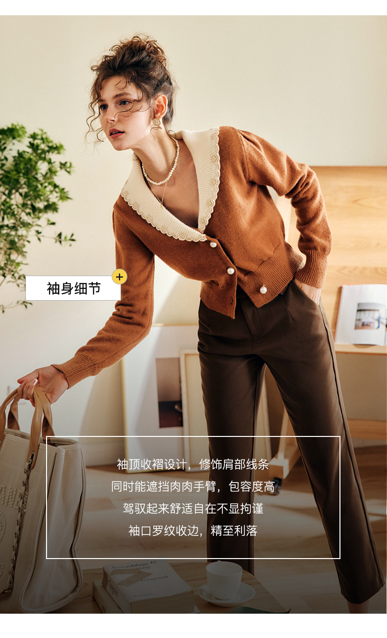 OLrain欧芮儿法式焦糖色针织开衫女秋季2022年新款修身翻领上衣
