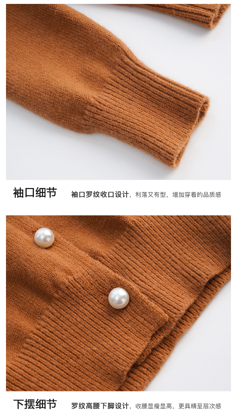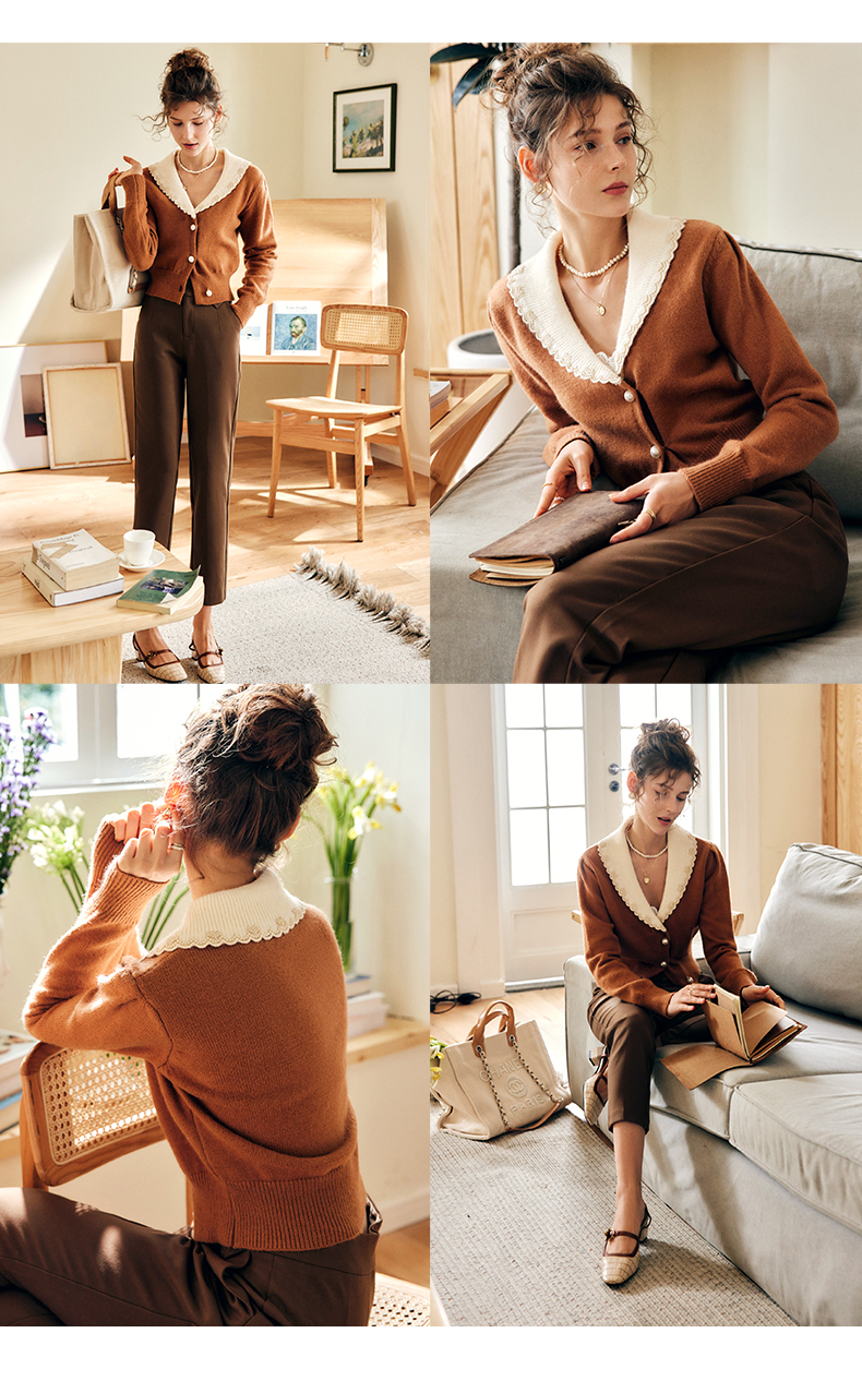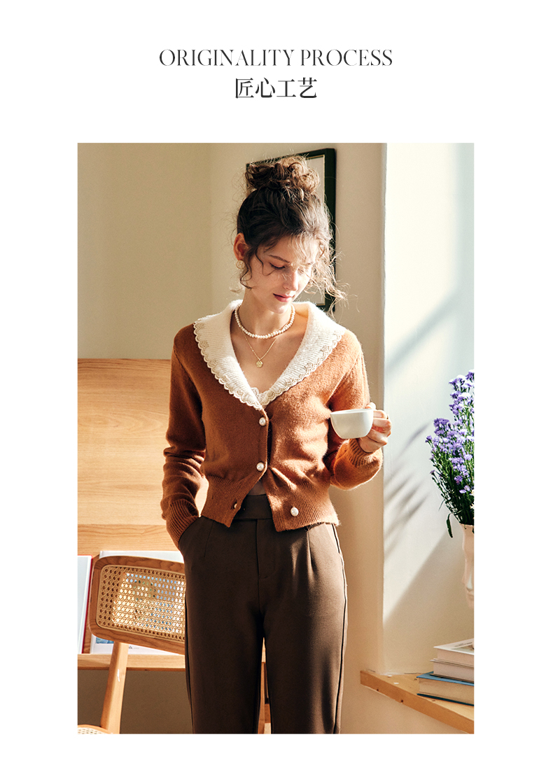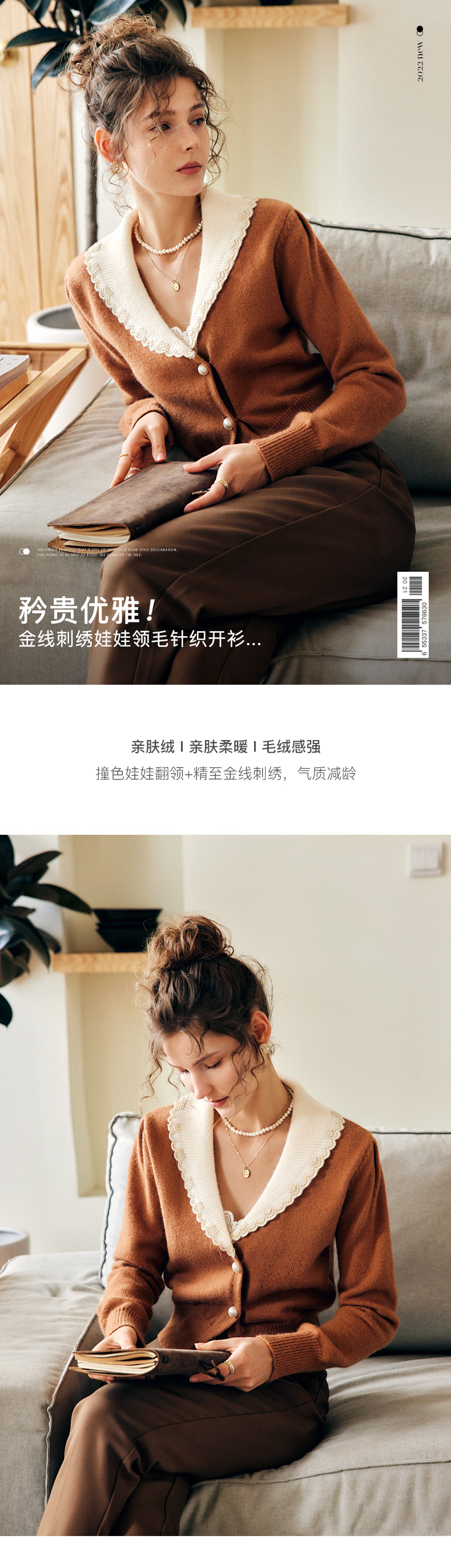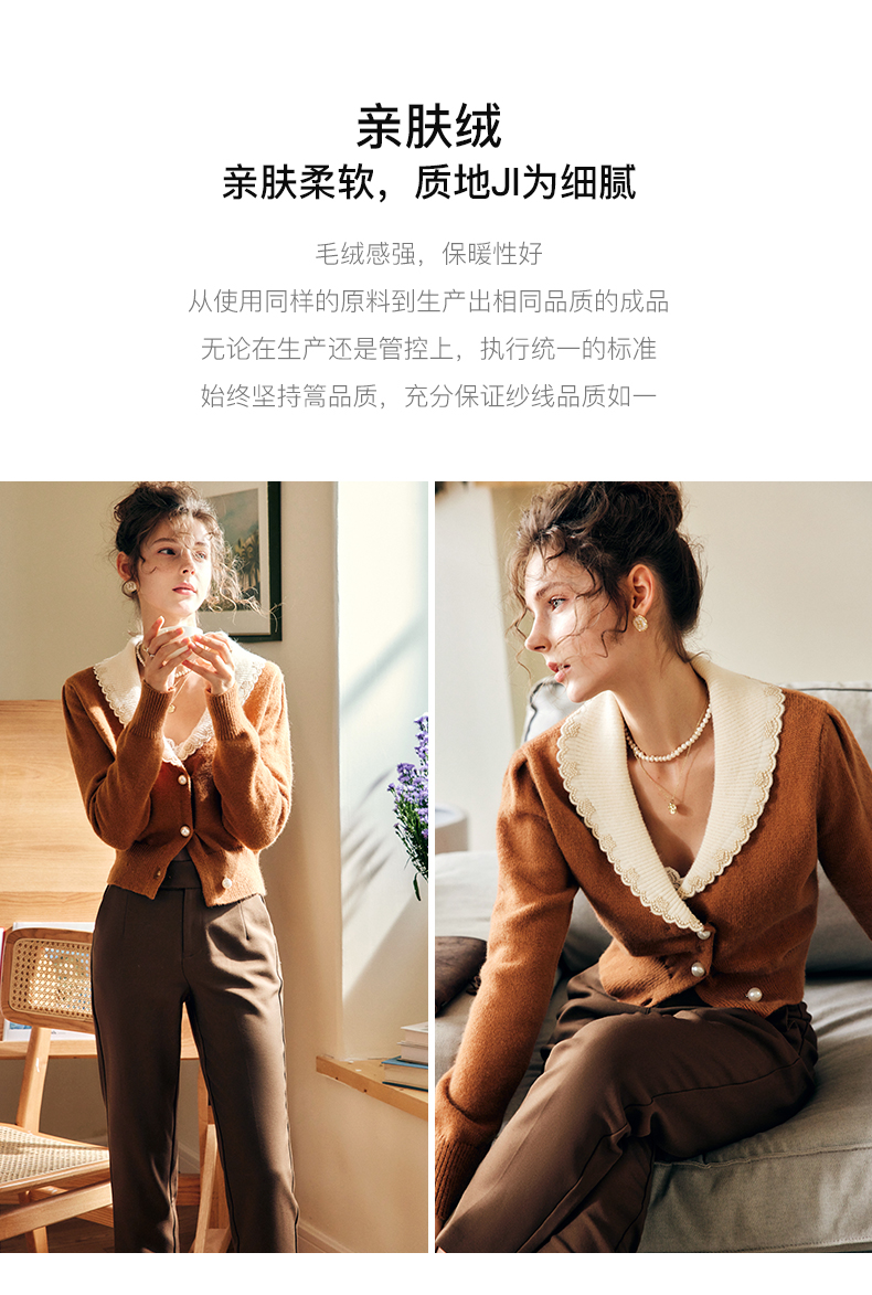 OLrain欧芮儿法式焦糖色针织开衫女秋季2022年新款修身翻领上衣