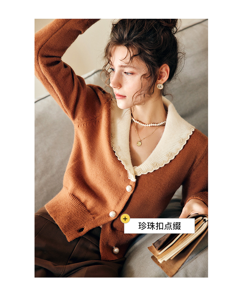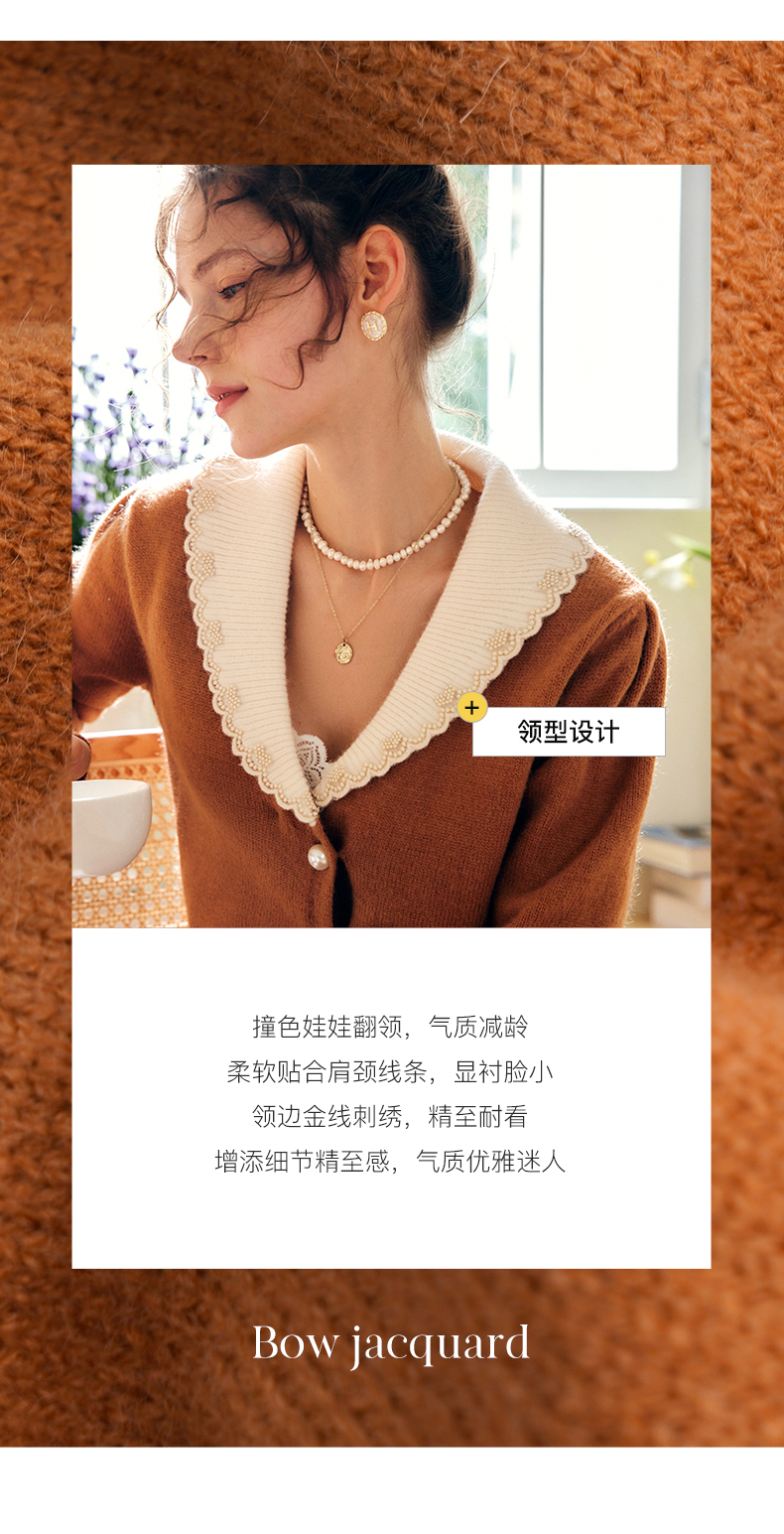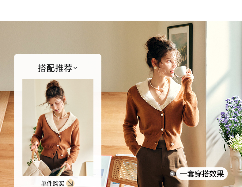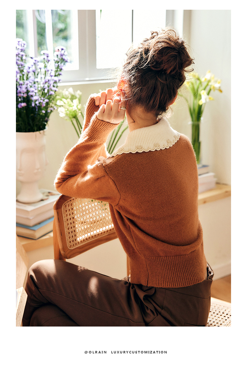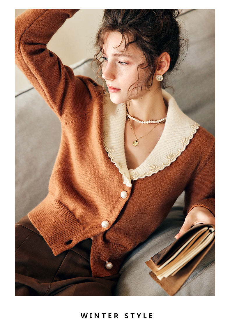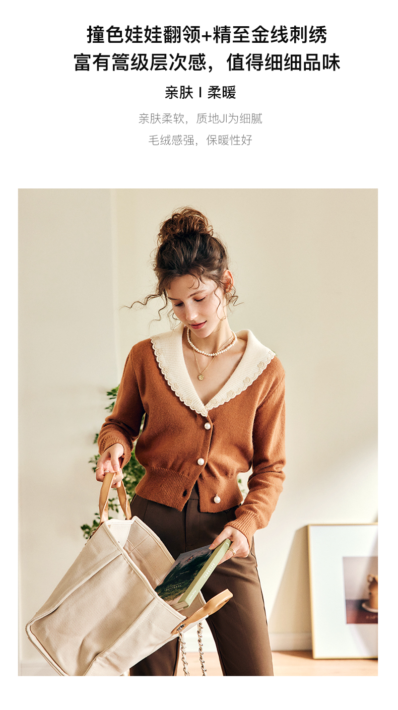 OLrain欧芮儿法式焦糖色针织开衫女秋季2022年新款修身翻领上衣