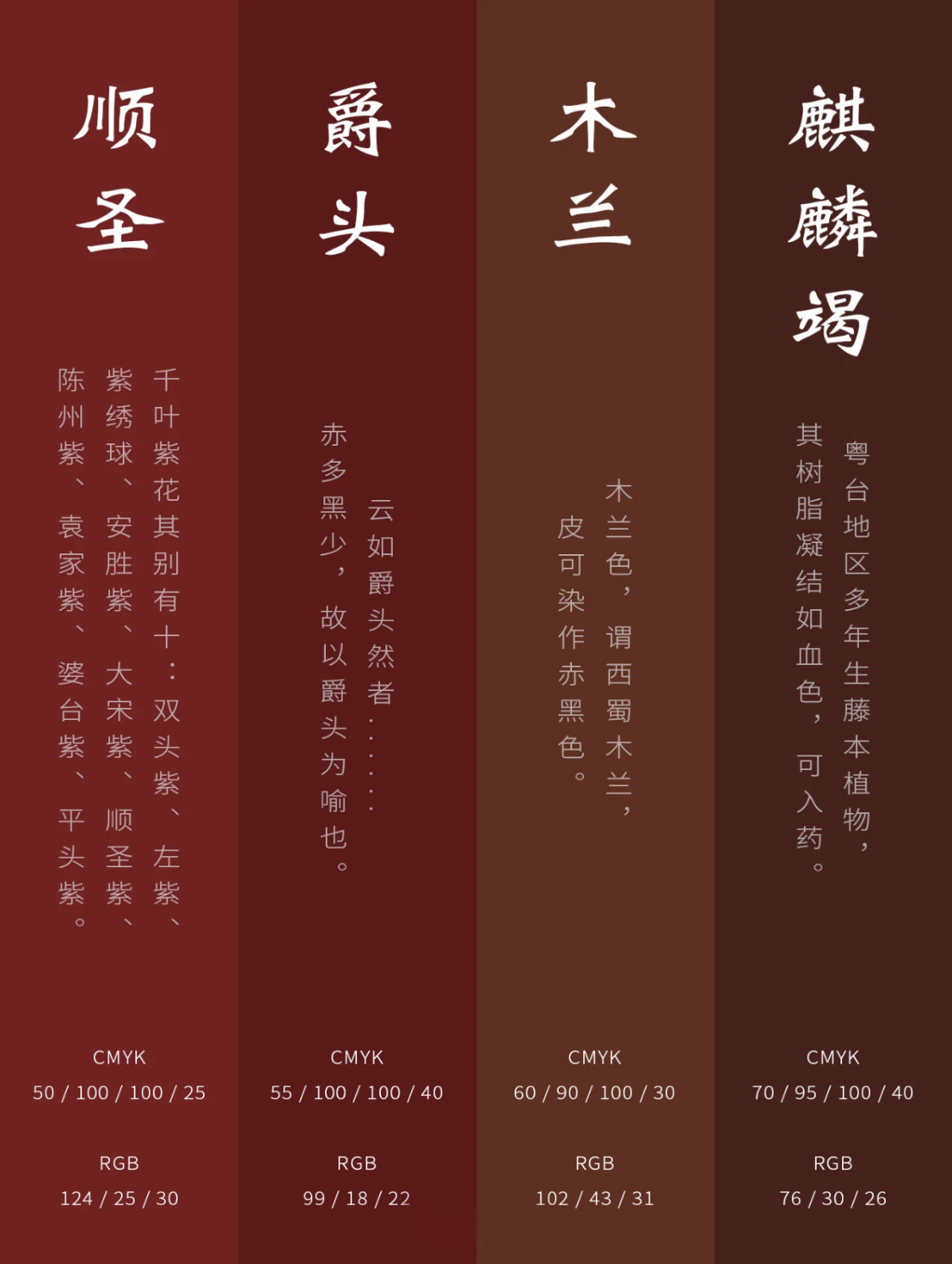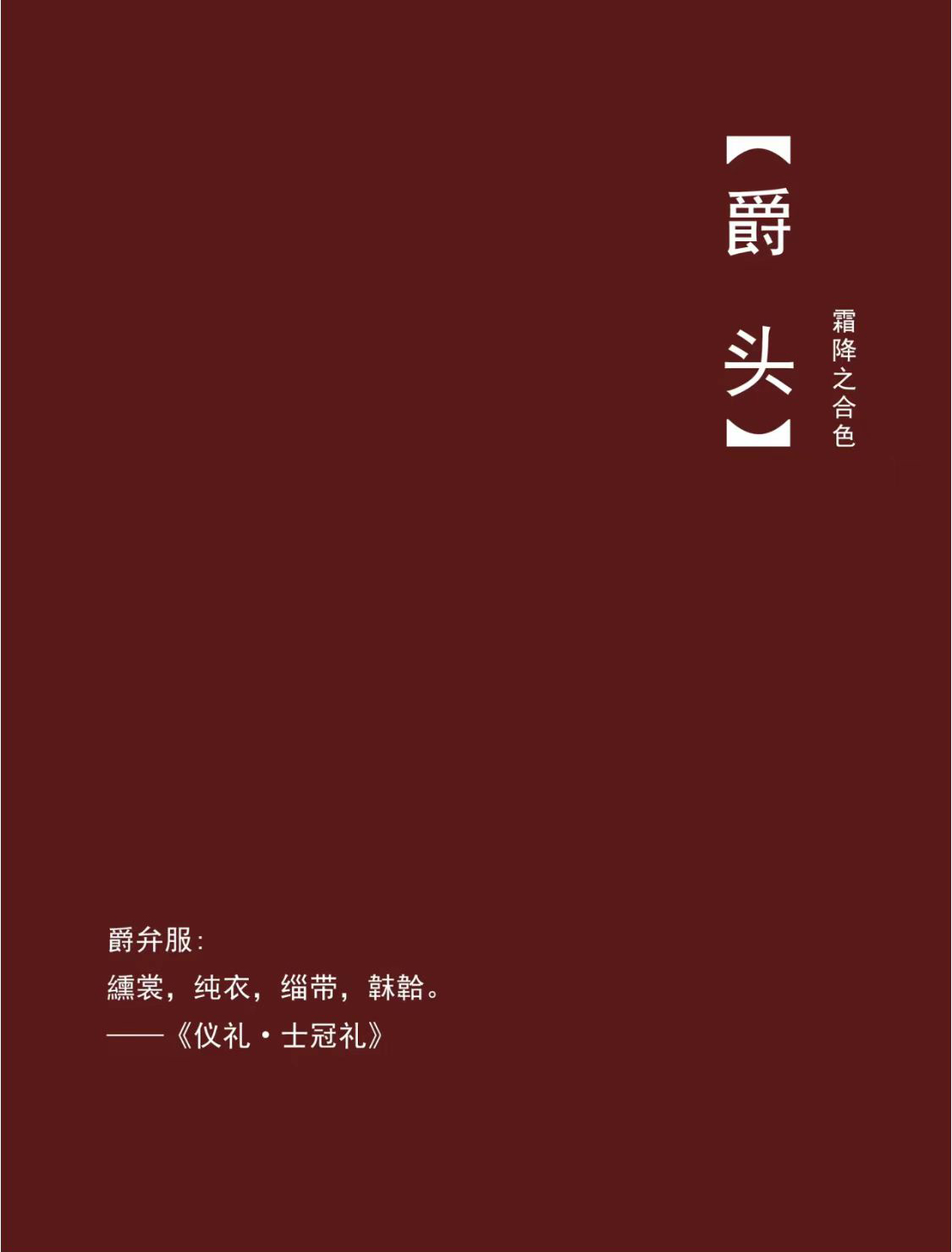 爵头——霜降之合色 ,赤多黑少的雀头颜色,古代贵族男子二十岁时行加冠礼,礼仪是第一回合的冠是这种颜色,象征着一段新的里程的开始,责任与担当,自由和独立。