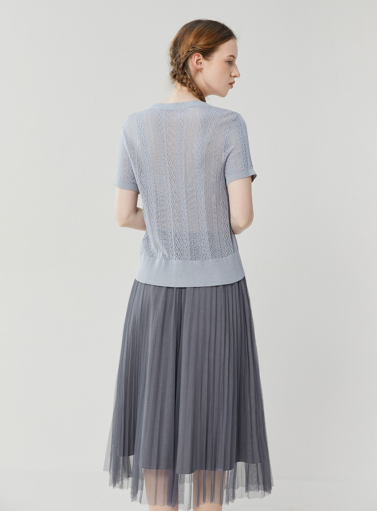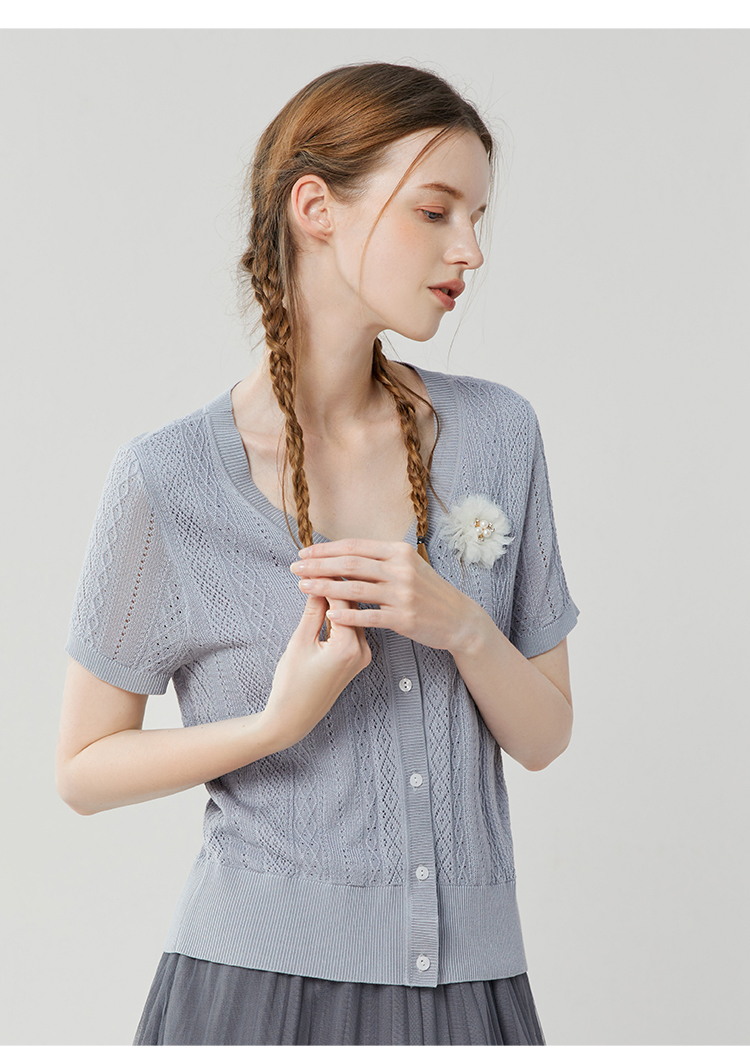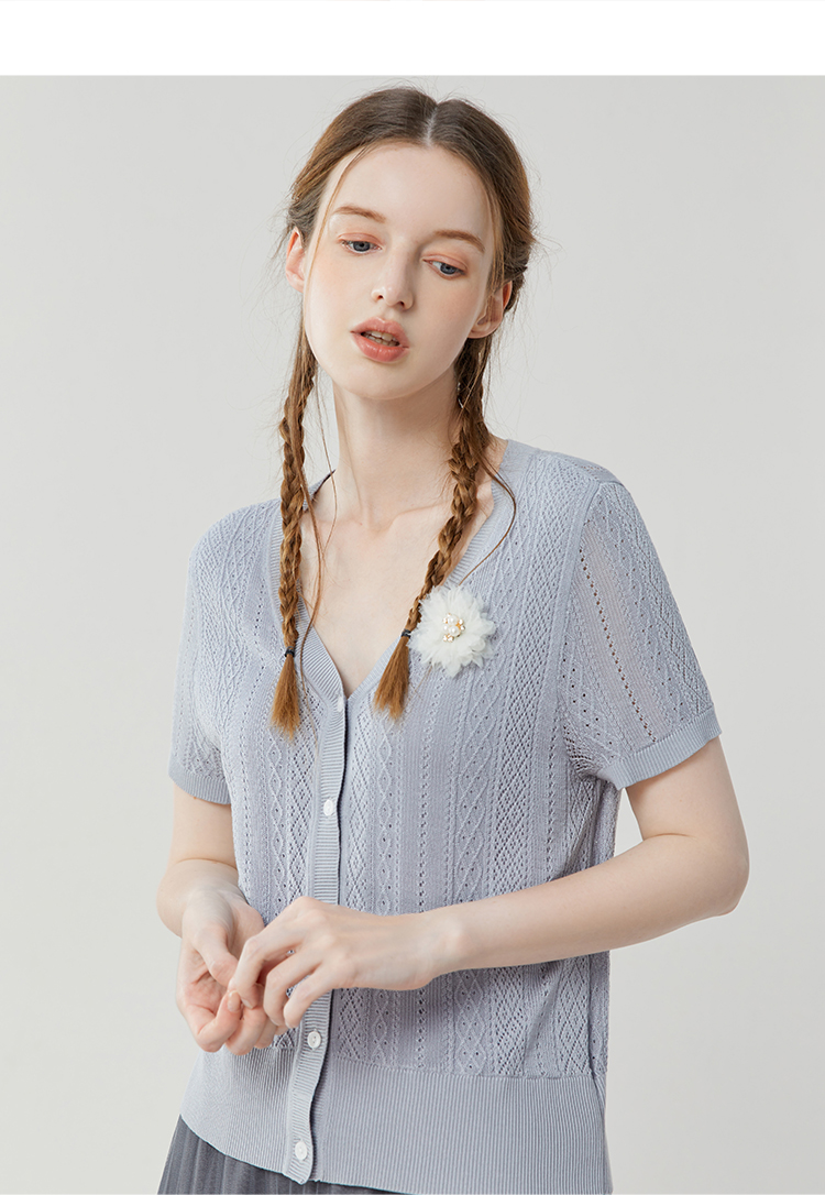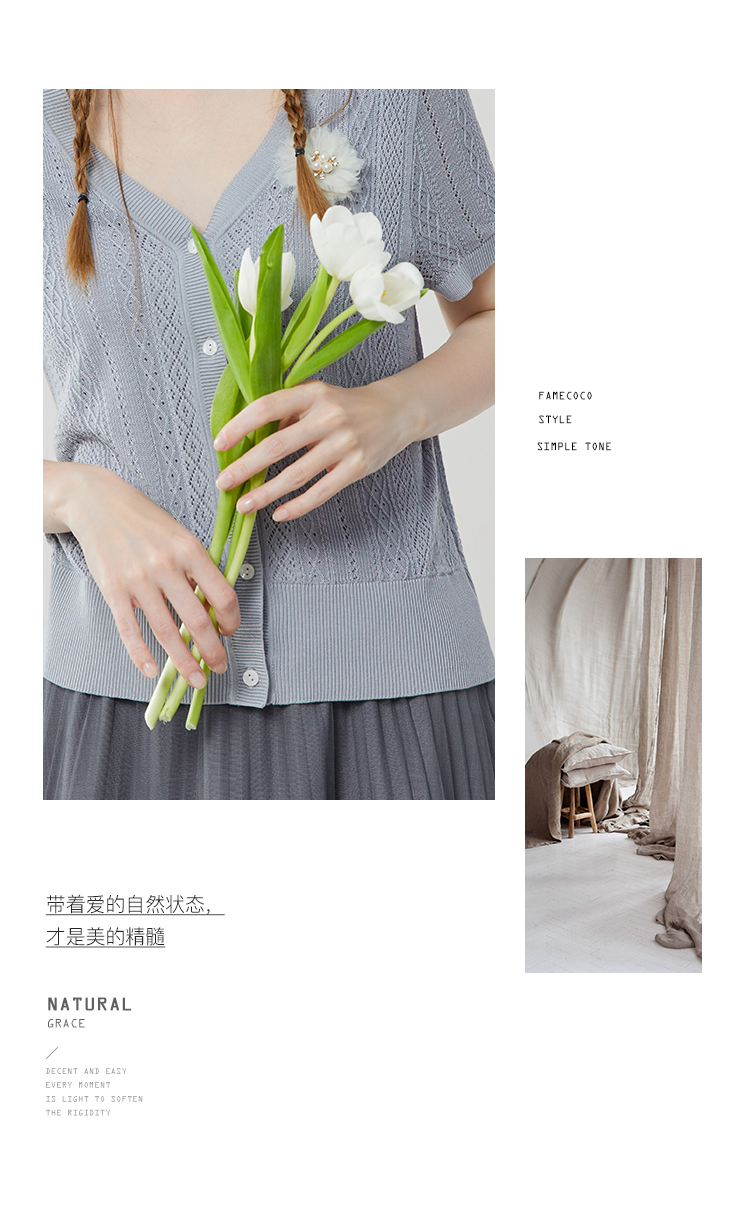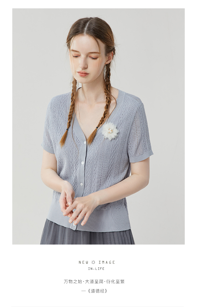 Famecoco范可儿钩织风针织上衣女夏季天丝短袖薄款打底衫FAB3DA002