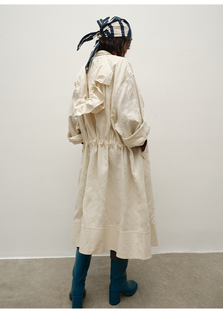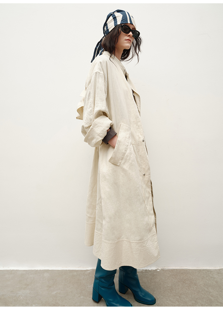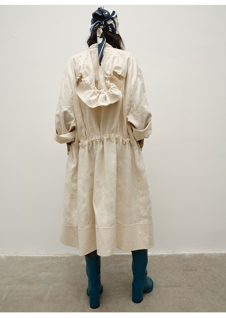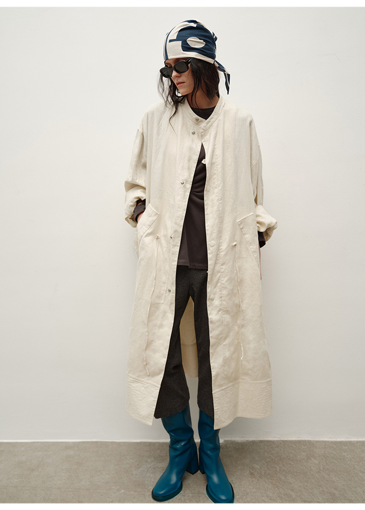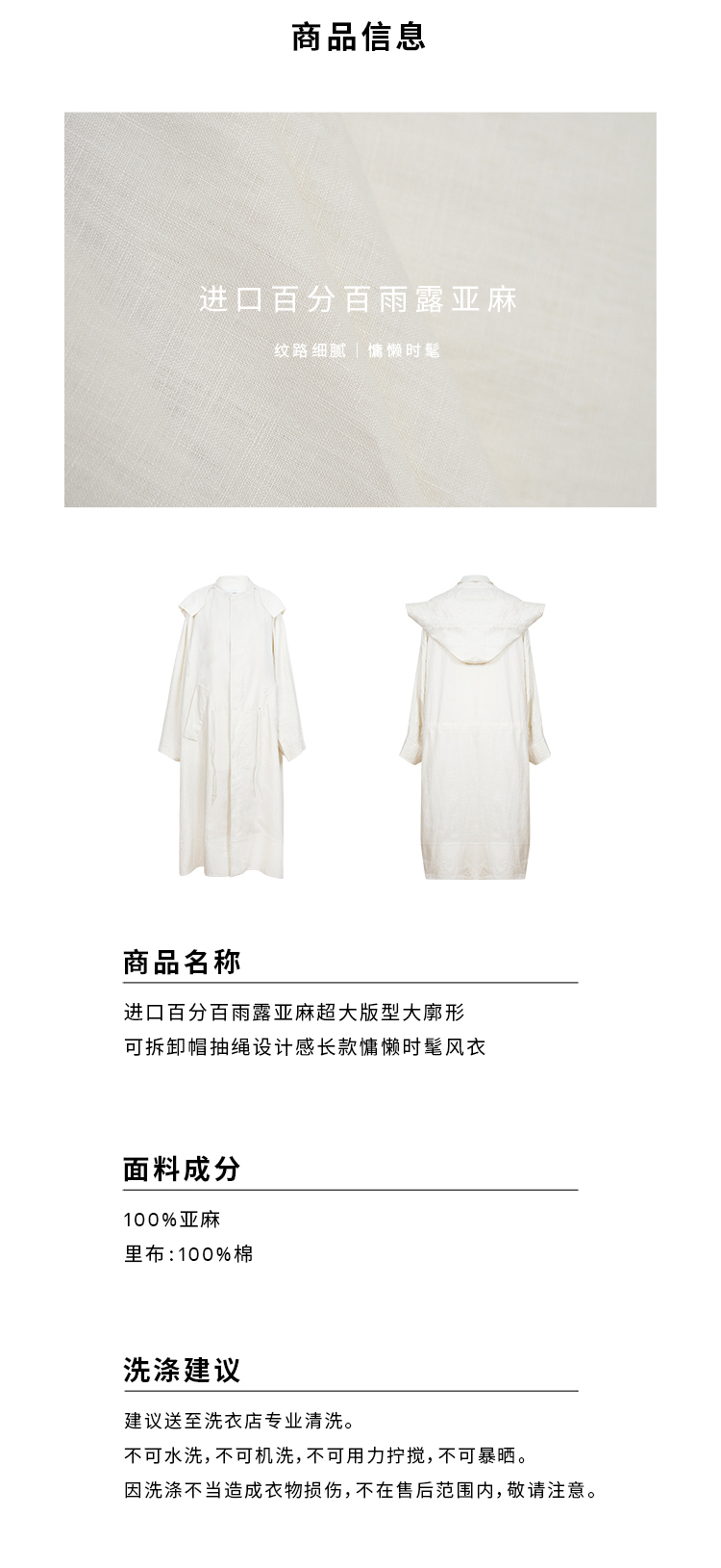 HIDEMI 进口百分百雨露亚麻超大版型大廓形可拆卸帽抽绳设计感长款慵懒时髦风衣