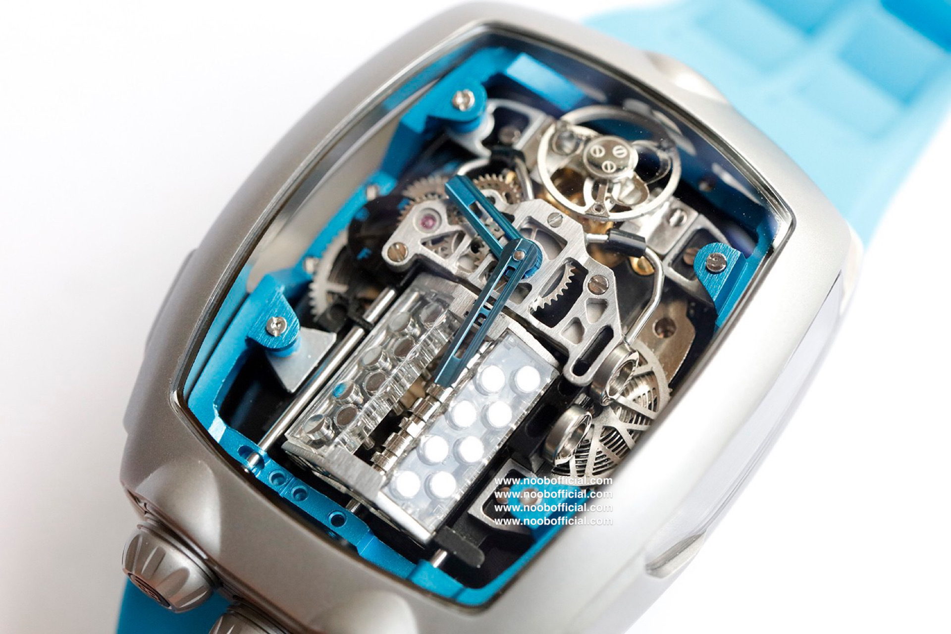 最让人感到惊讶的是透过蓝宝石水晶制作的曲型镜面你可以看到一个16缸的发动机,和超跑上是一样的发动机,只是mini版的,透过它的外表,你可以将里面的机械感看得一清二楚